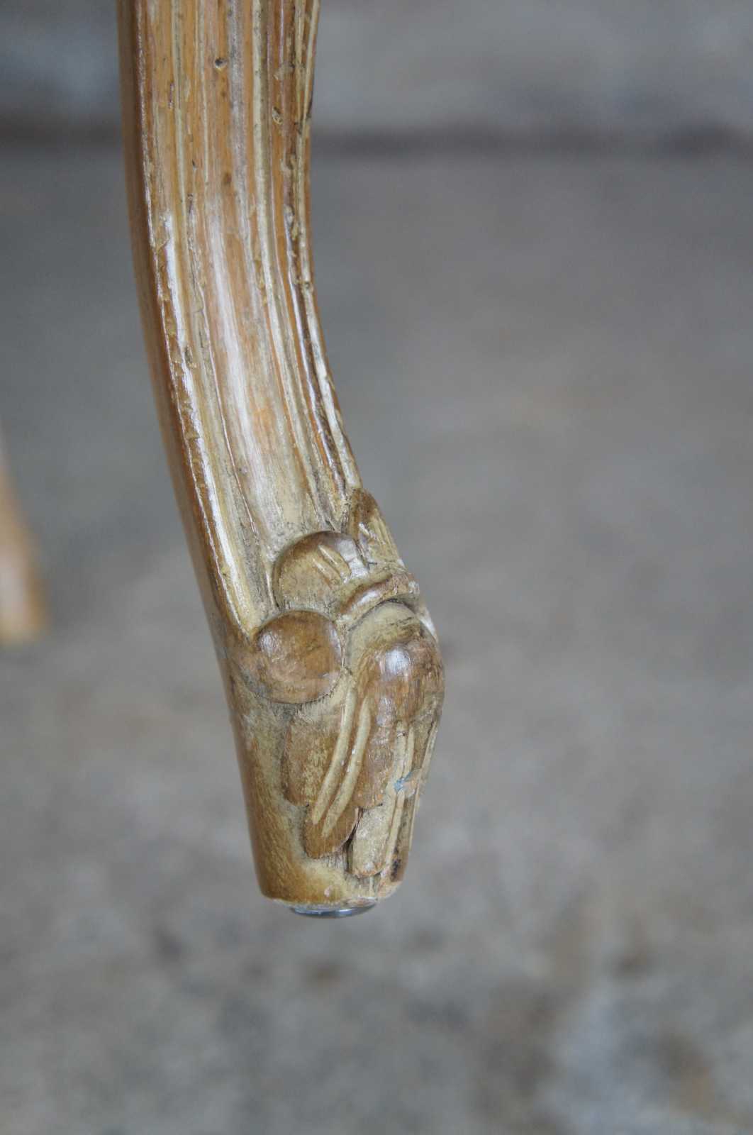 A beautiful pair of early 20th century Louis XV arm chairs. Elegantly carved with floral accents over a distressed white washed frame. Features an off yellow upholstery with a blue topical floral print and couble cording. Includes matching lumbar and throw pillows
