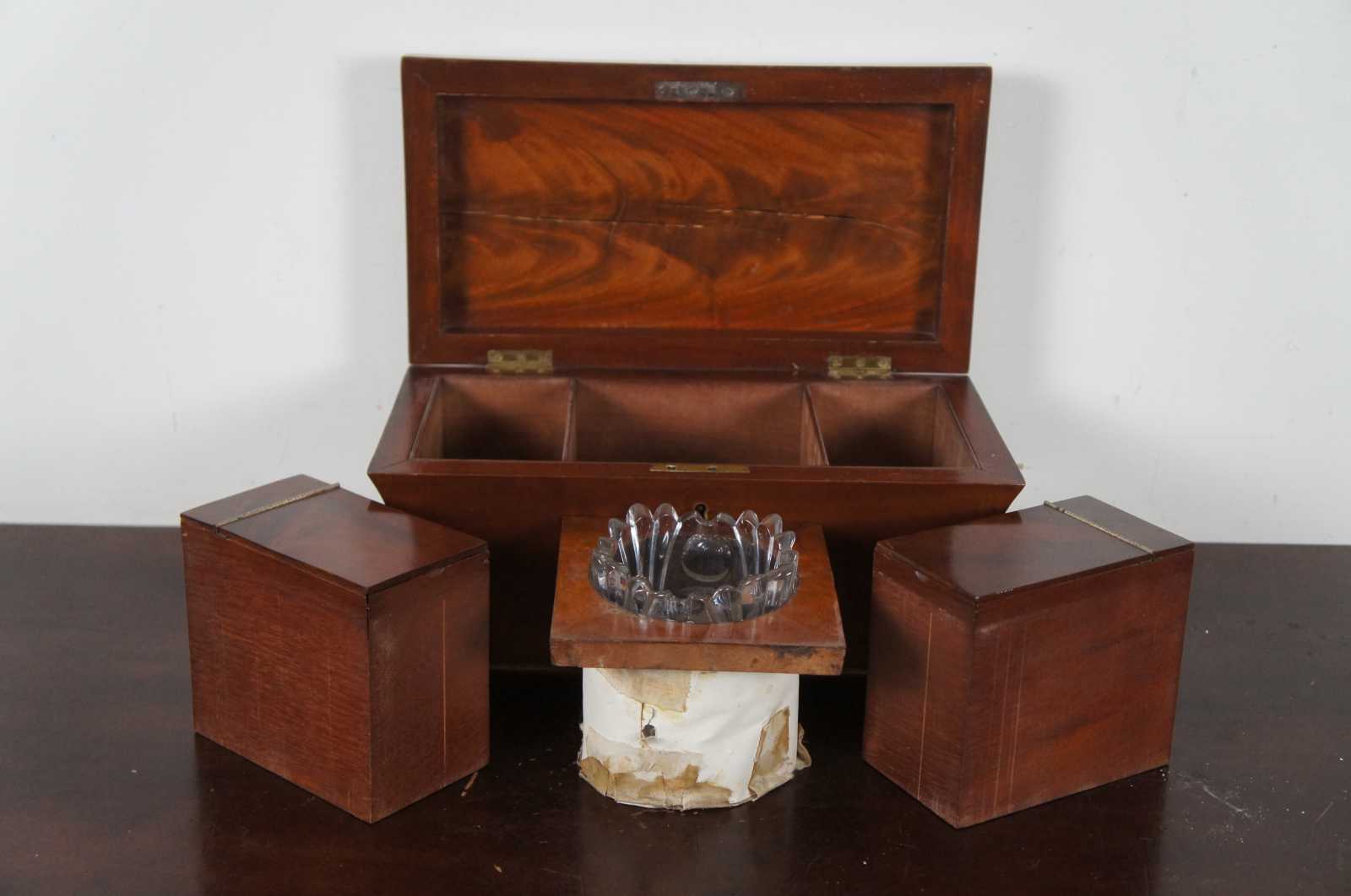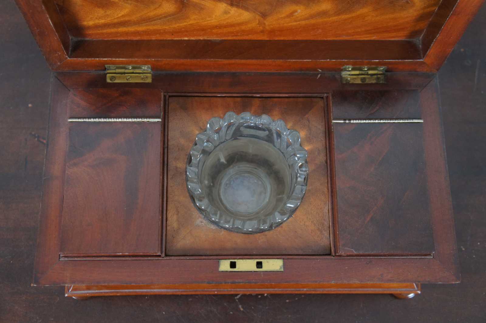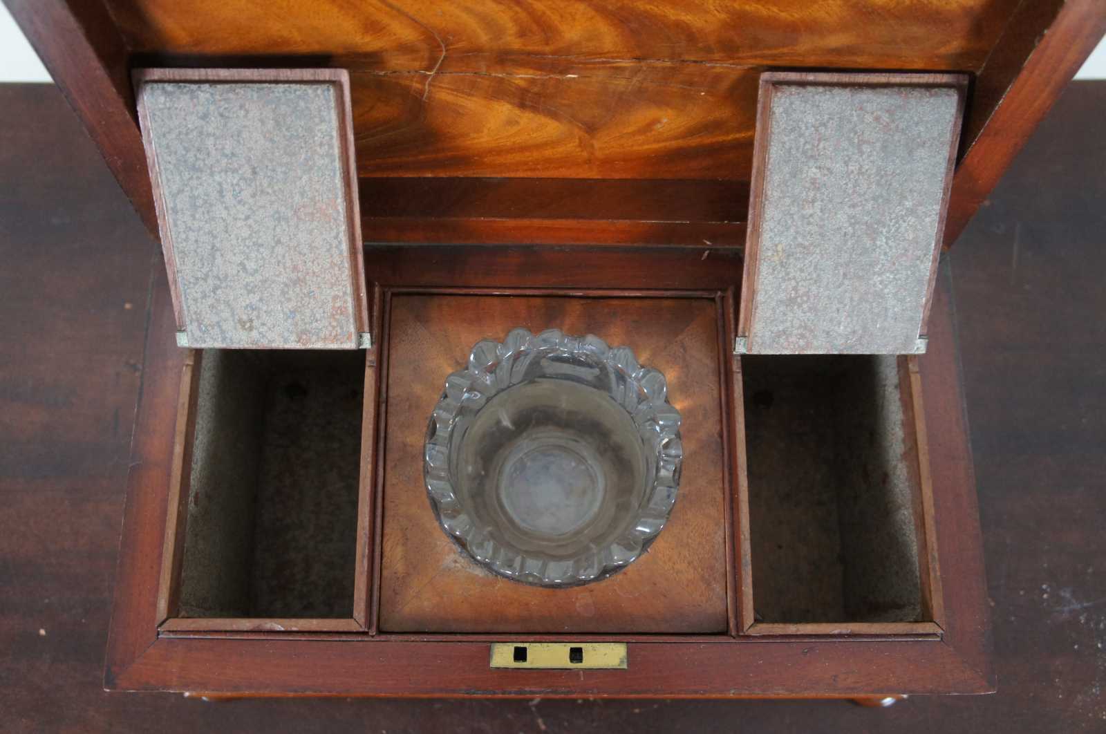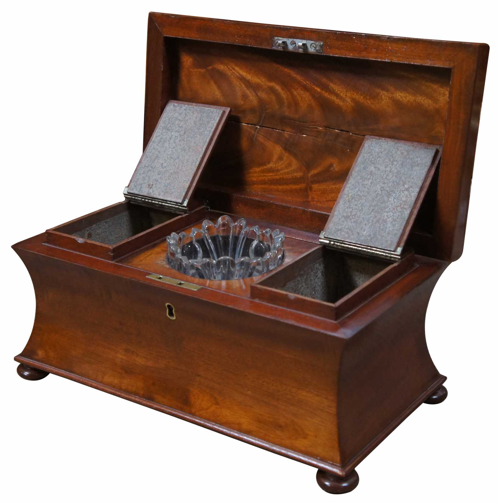 Antique Edwardian flamed mahogany footed trophy shaped cigar box with two lidded inner compartments and pressed glass insert.