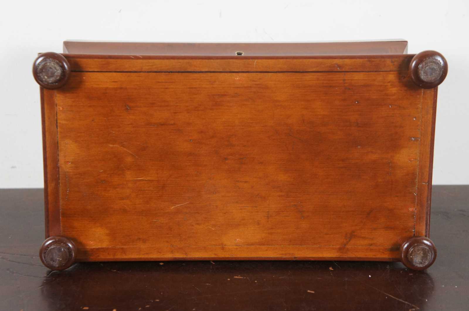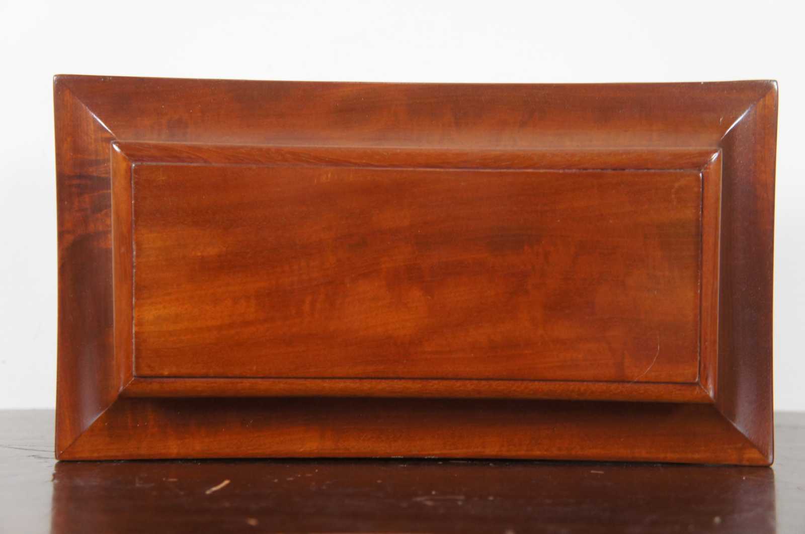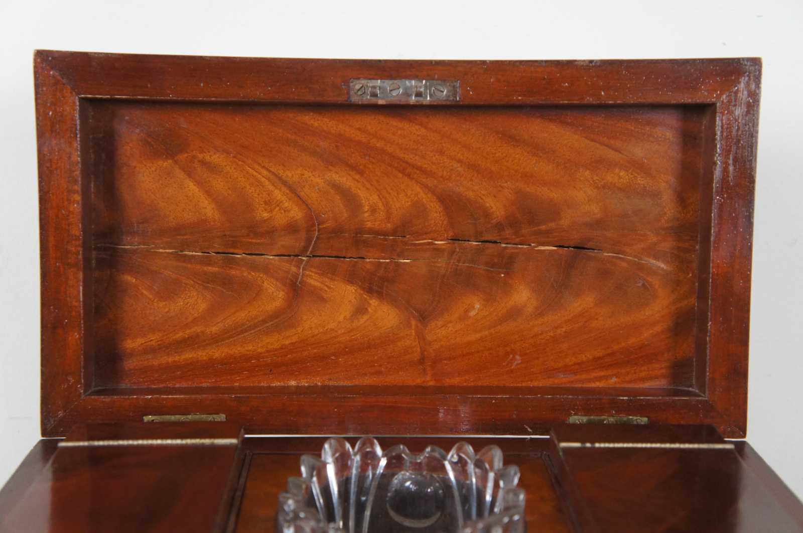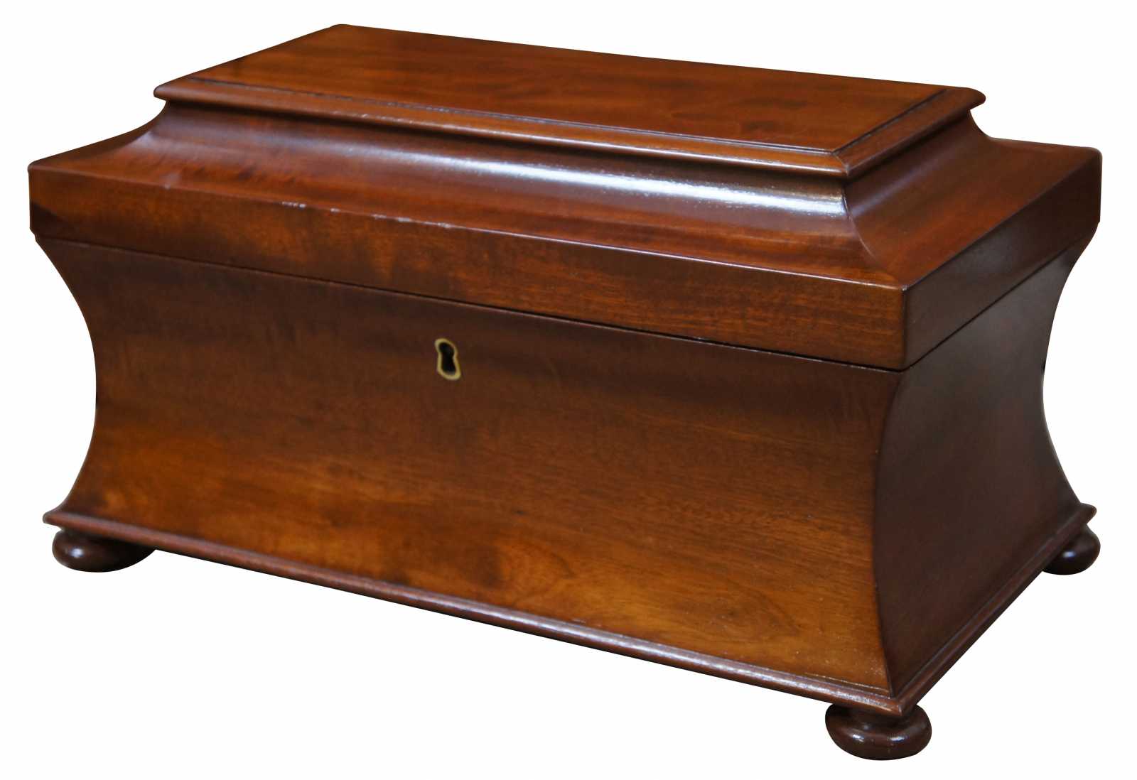 Antique Edwardian flamed mahogany footed trophy shaped cigar box with two lidded inner compartments and pressed glass insert.