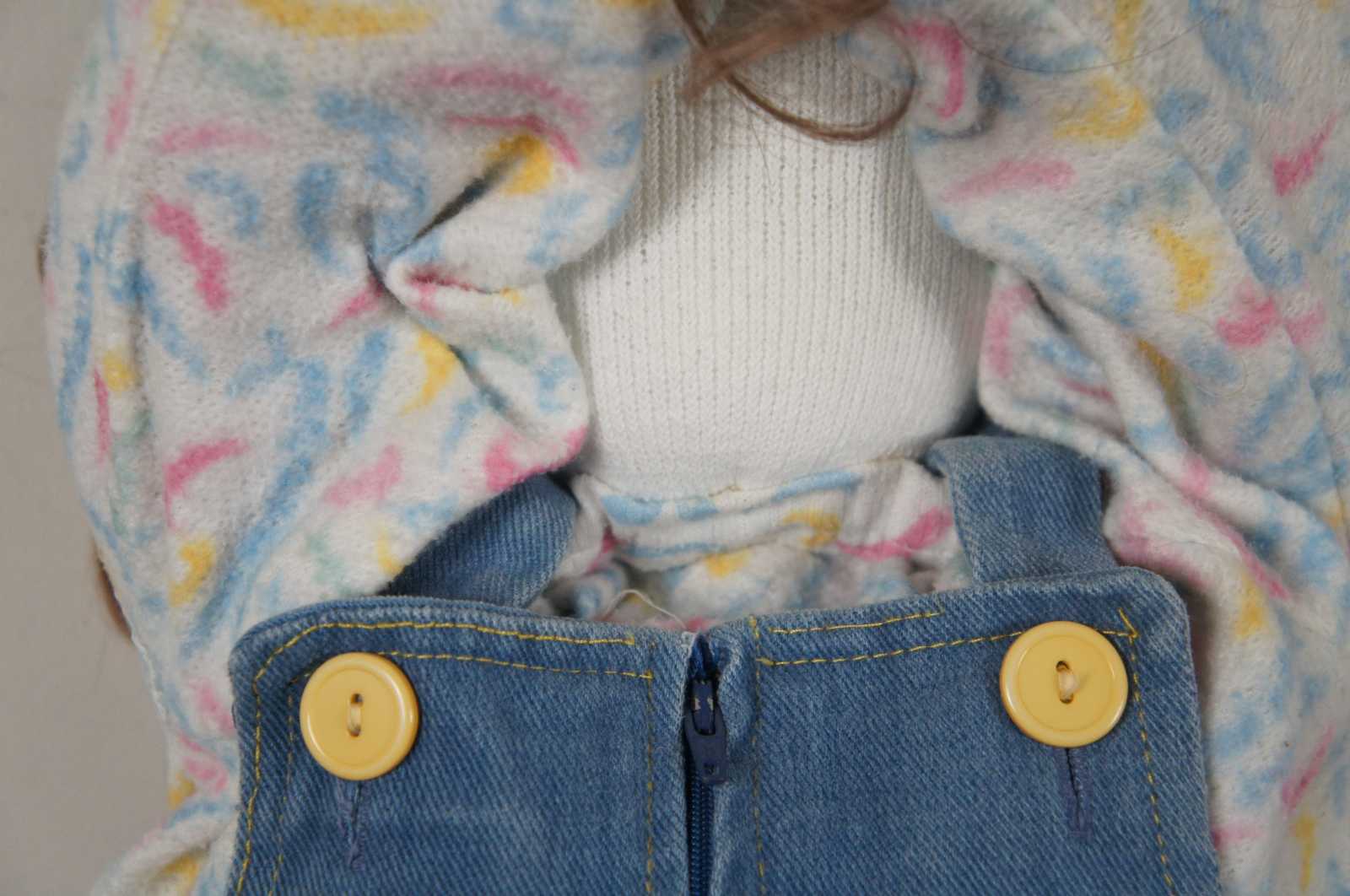 Vintage 1990’s time out doll dressed in a pastel shirt, denim overalls, red and blue sneakers, and a Barney the Dinosaur hat over curly brown hair. Hat marked The Lyons Group 1992.