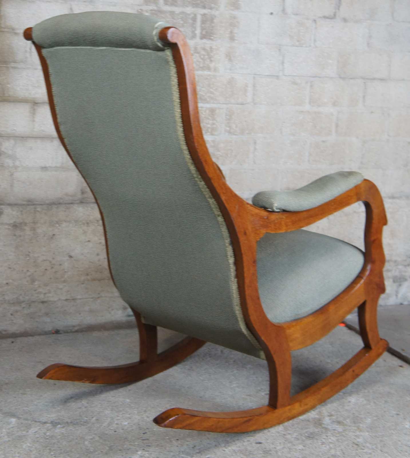 Antique American Empire / Victorian rocking chair. Made of mahogany with green needlepoint fabric and padded arms and tufted back.