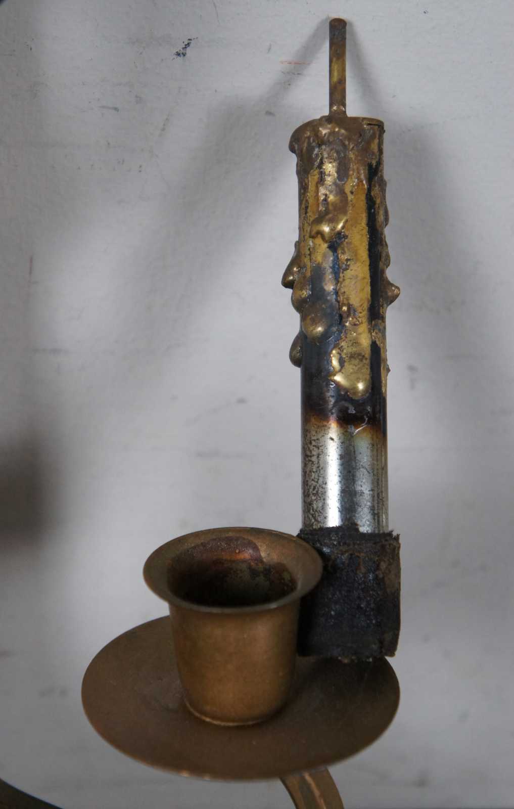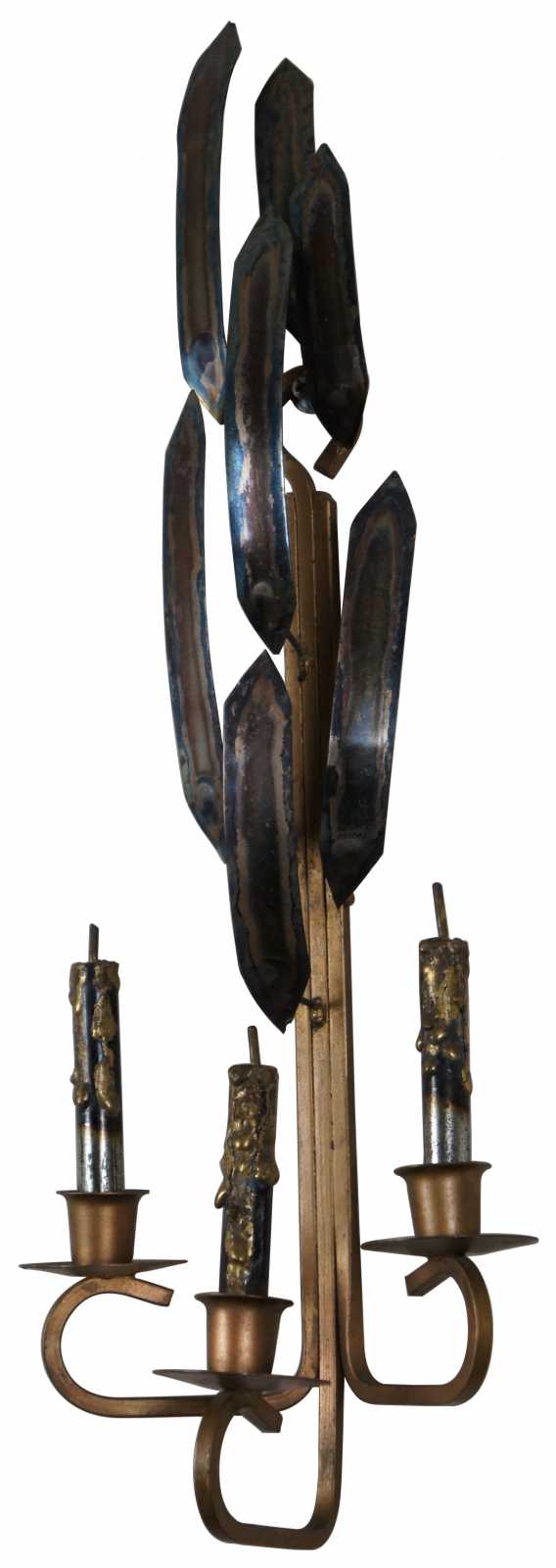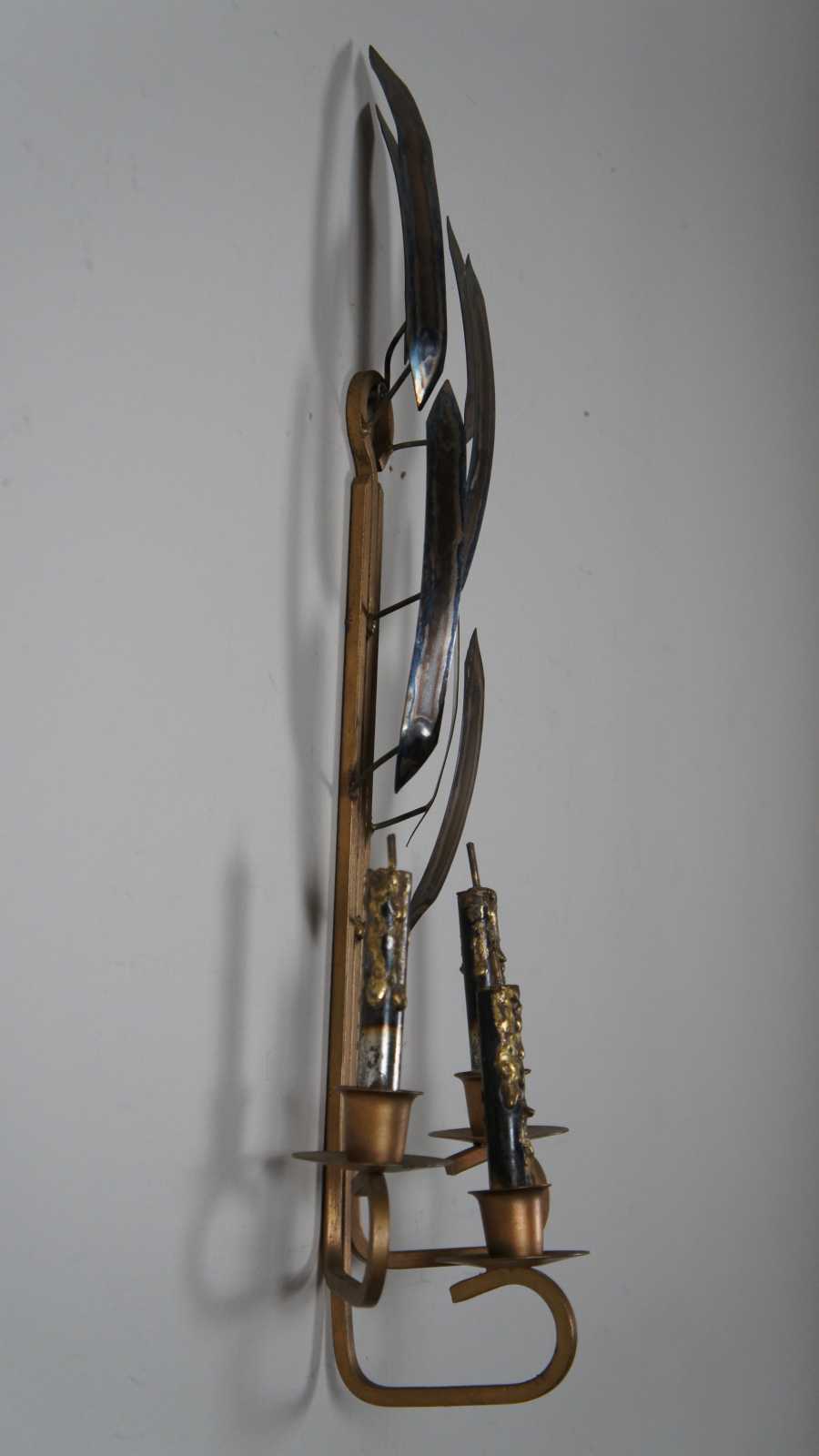 Vintage three light candelabra wall sconce with gold painted arms and metal / burnished copper leaf / flame design and taper candles, inspired by the style of Curtis Jere.