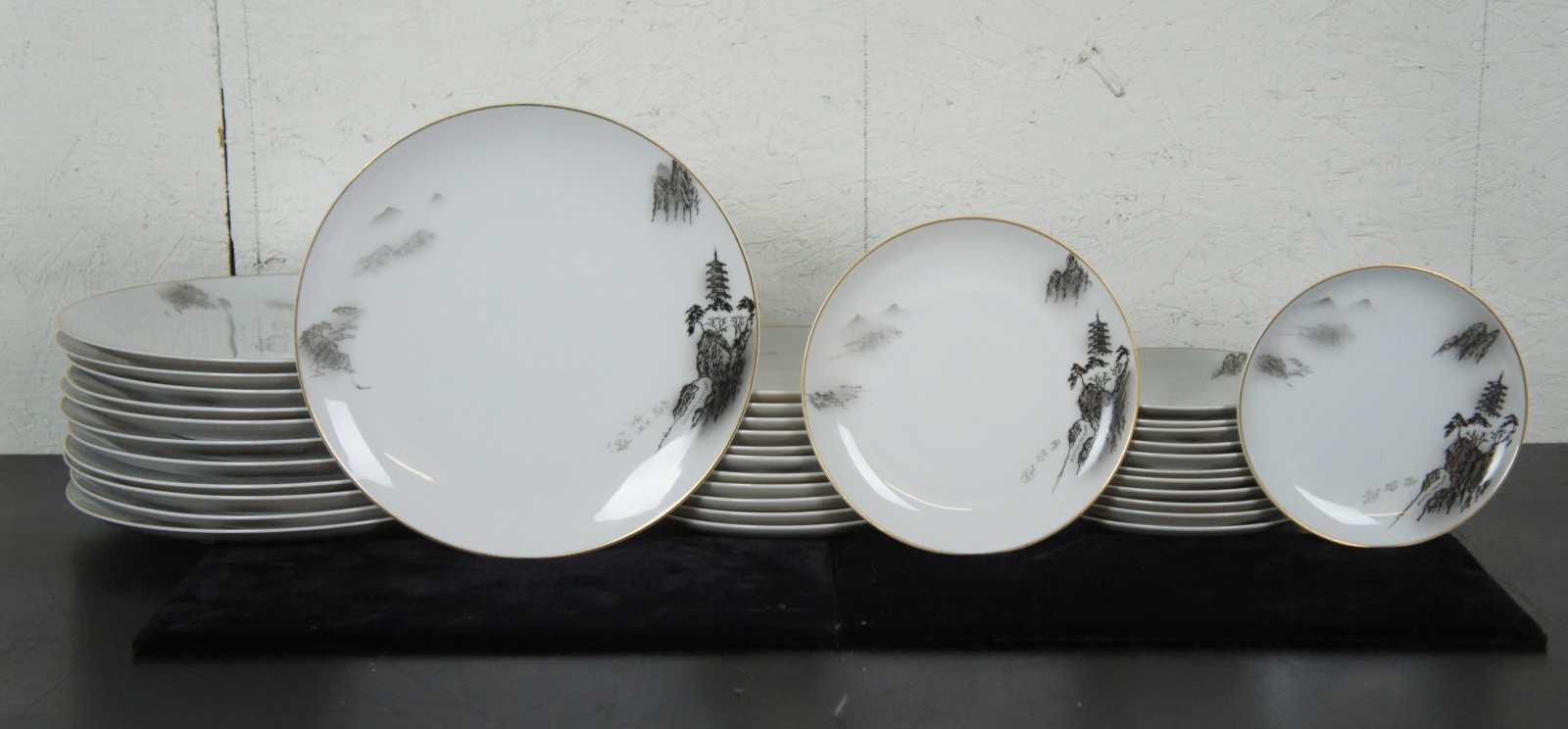 92 piece set of dinnerware by Fukagawa, pattern number 903, featuring a black and white pagoda tower on a rocky hillside or landscape with gilded edges.