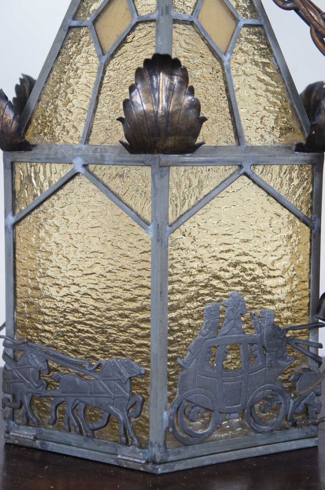 Vintage stained glass and wrought iron Gothic style swag light with scallop shell accents and encircled with metal silhouettes of a loaded stagecoach.