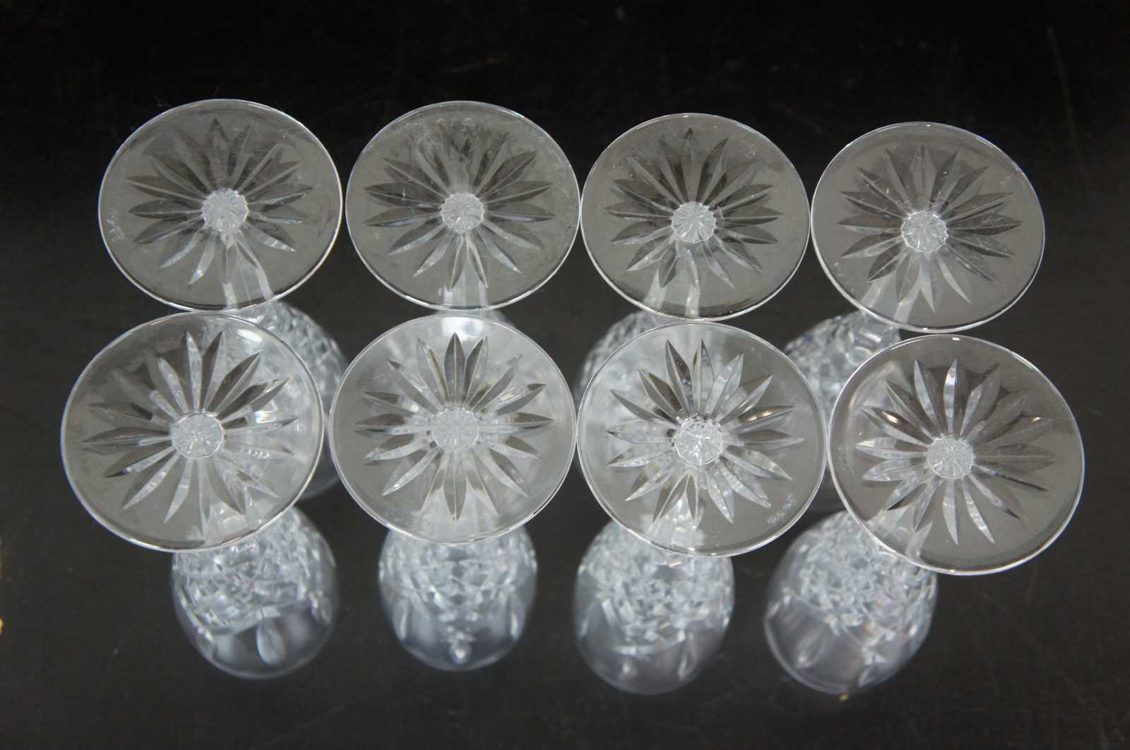 Set of 8 Waterford crystal champagne flutes in the Araglin pattern with cut criss cross and verticals, faceted stem, and a cut foot.