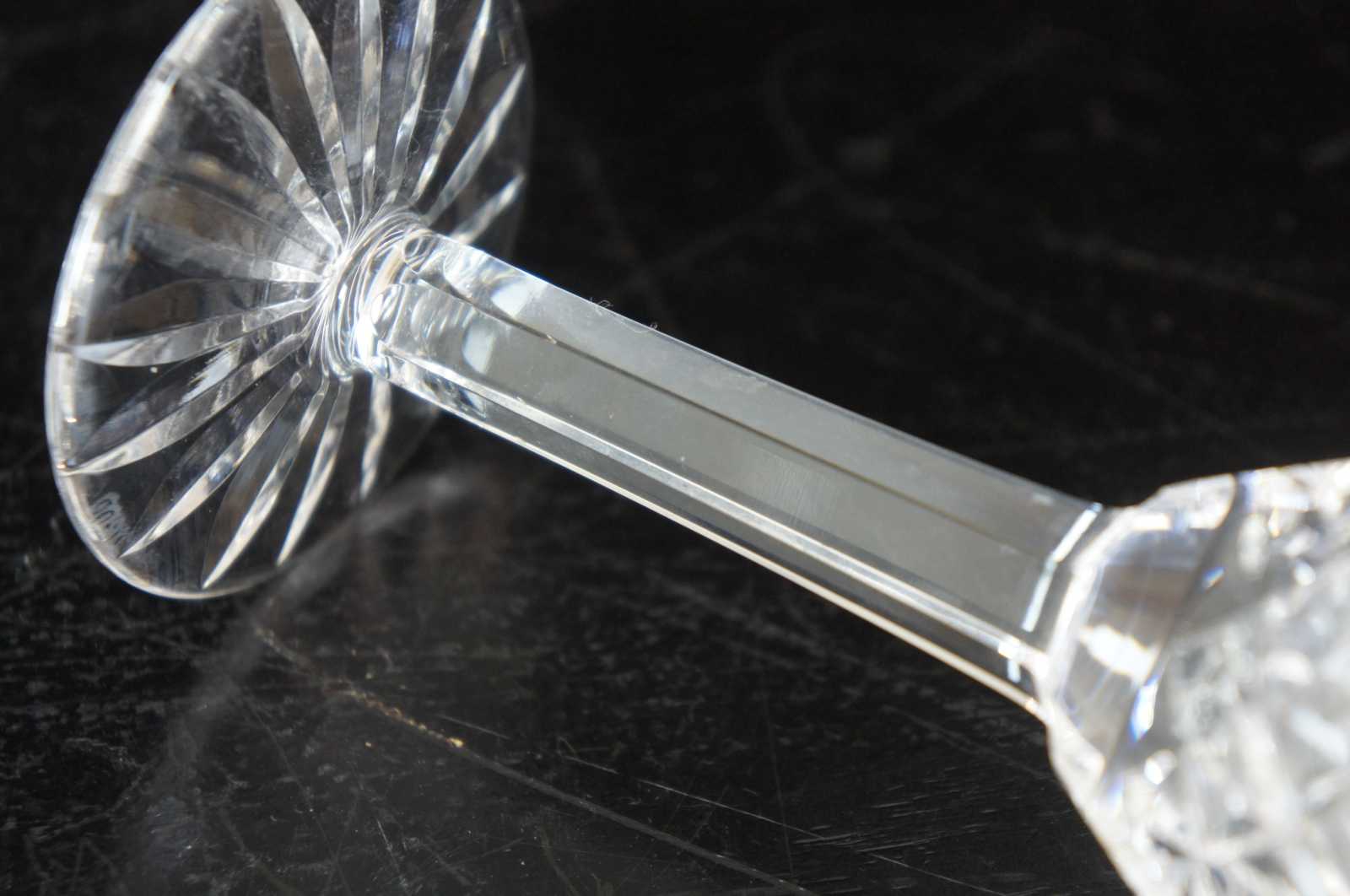 Set of 8 Waterford cut crystal wine glasses in the Araglin pattern with cut criss cross and verticals, faceted stem, and a cut foot.