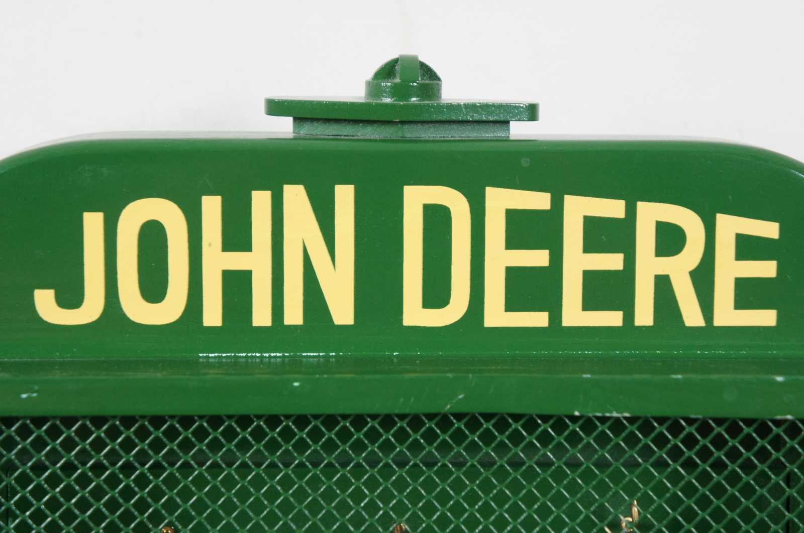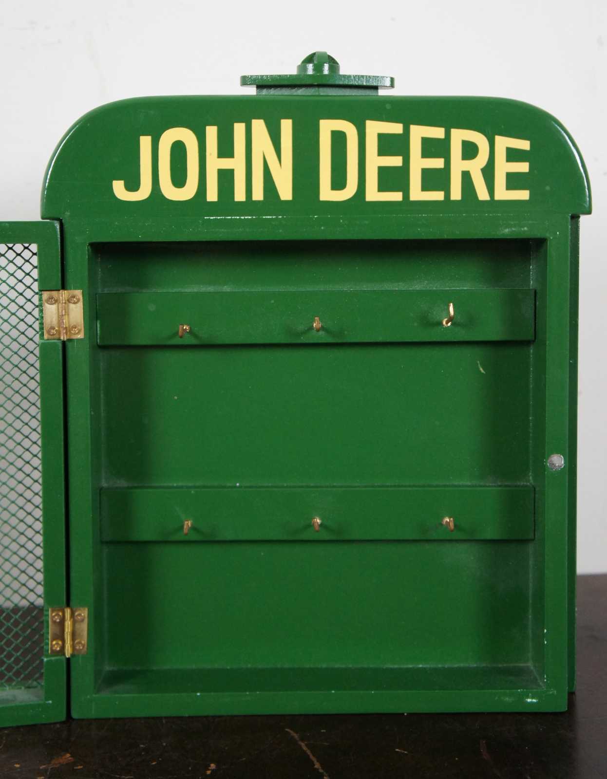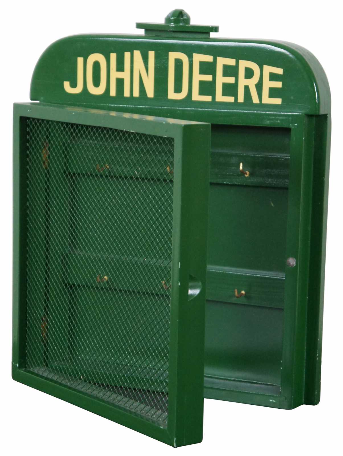 John Deere branded green wood key rack with mesh front door and six hooks.