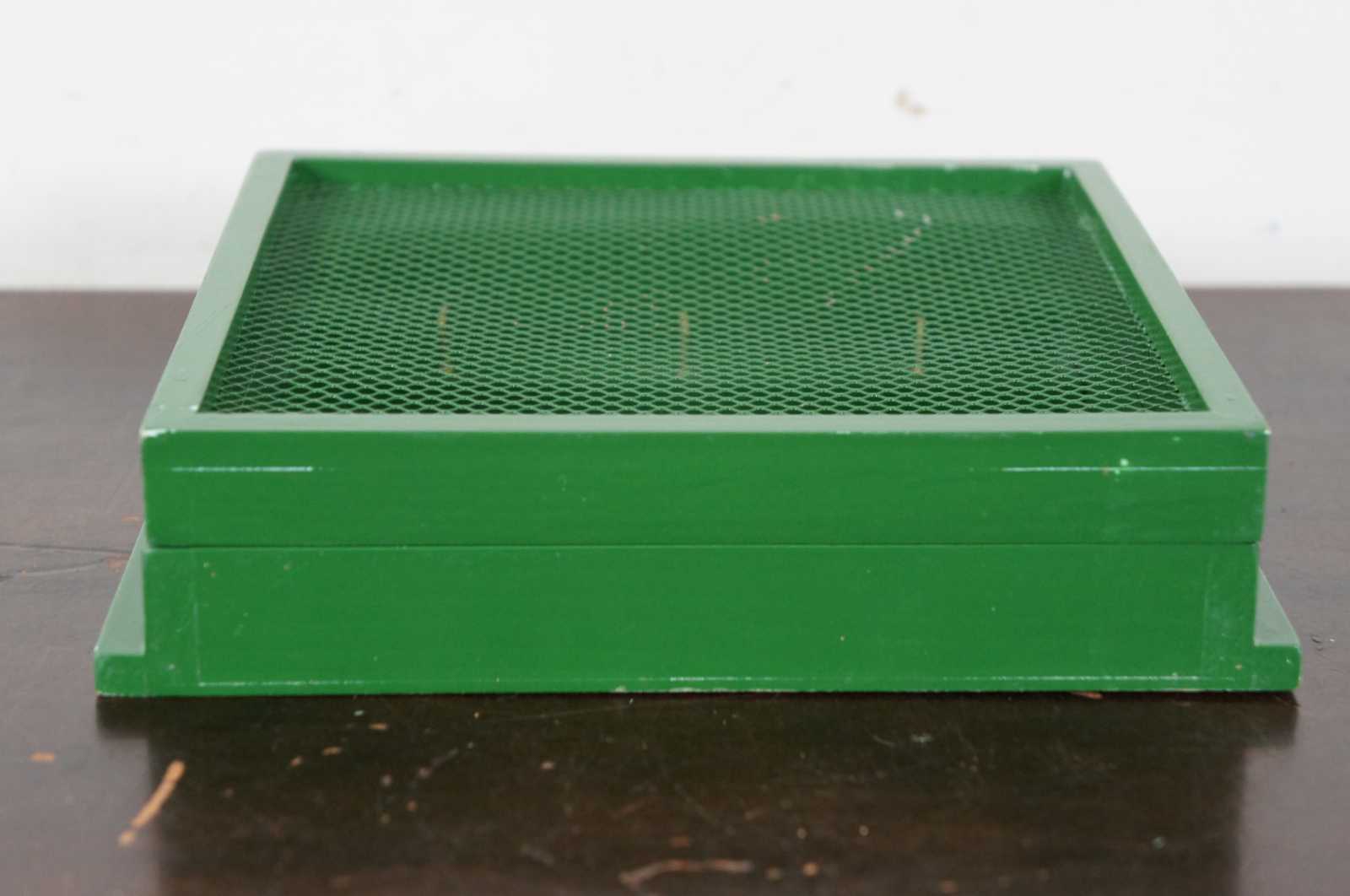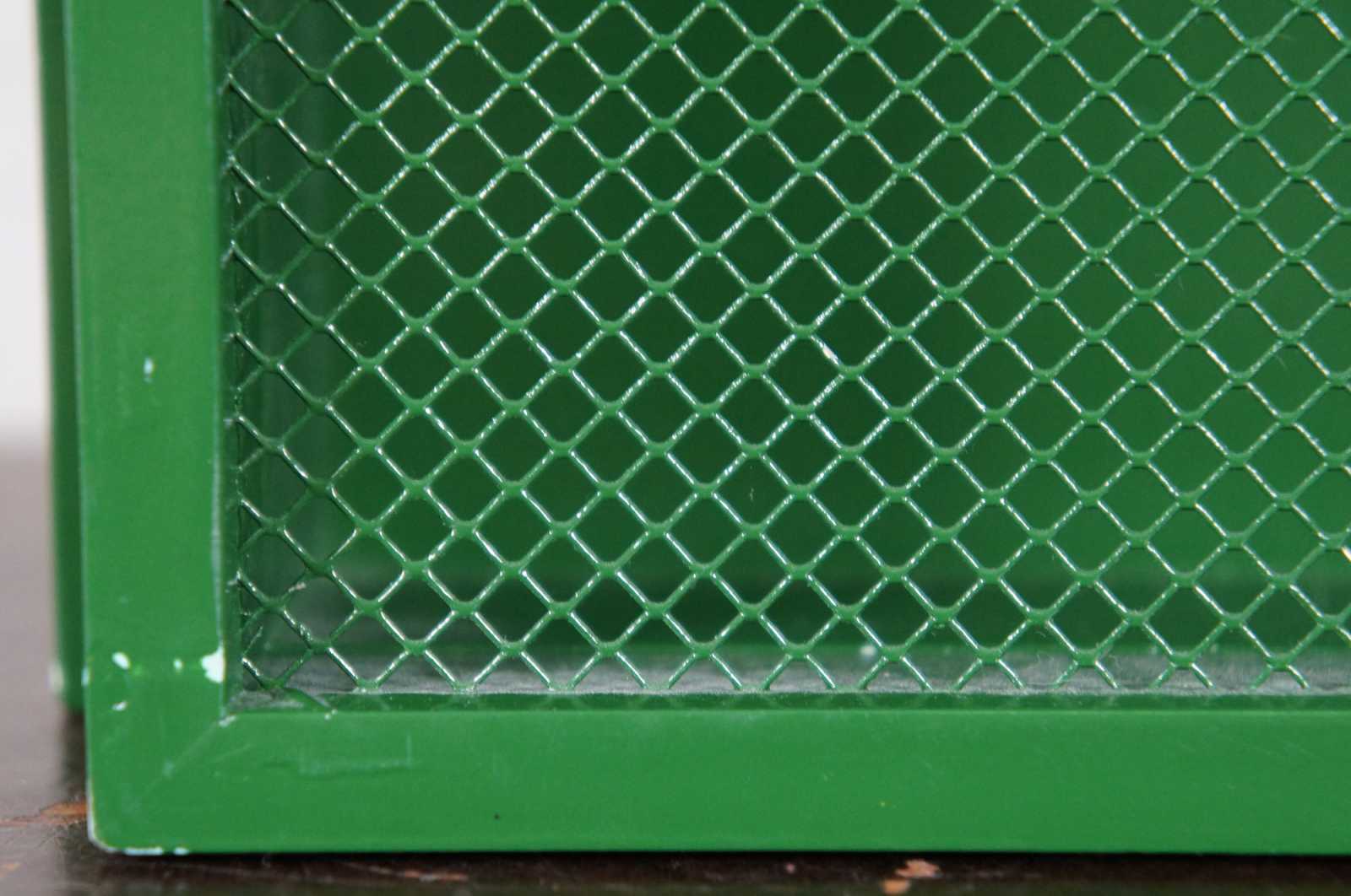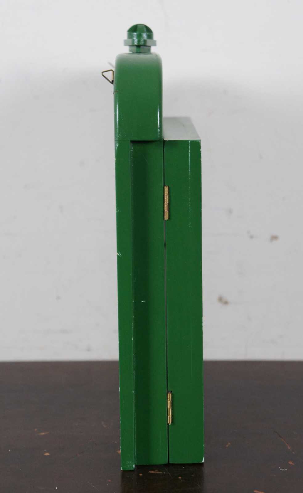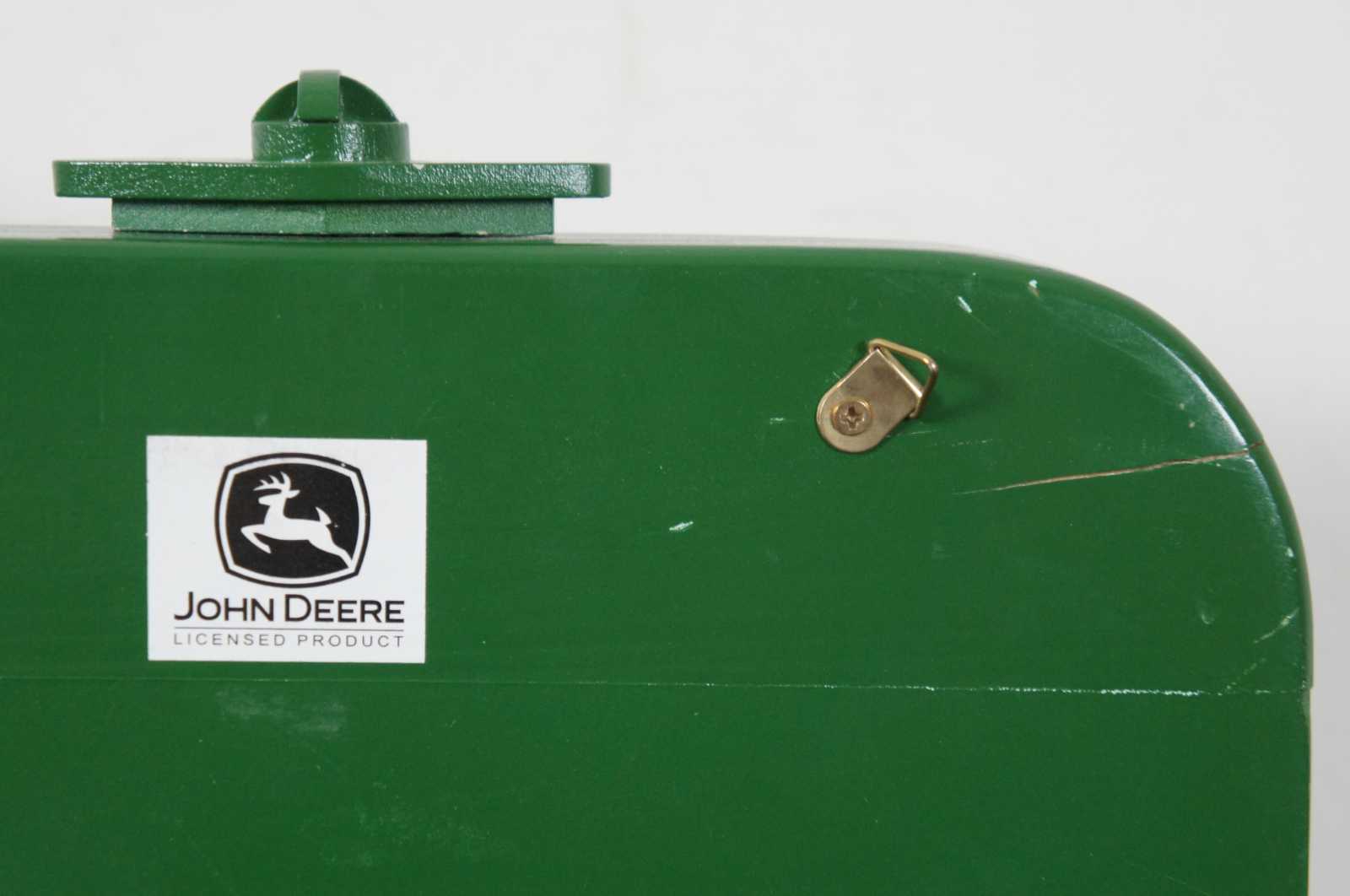 John Deere branded green wood key rack with mesh front door and six hooks.