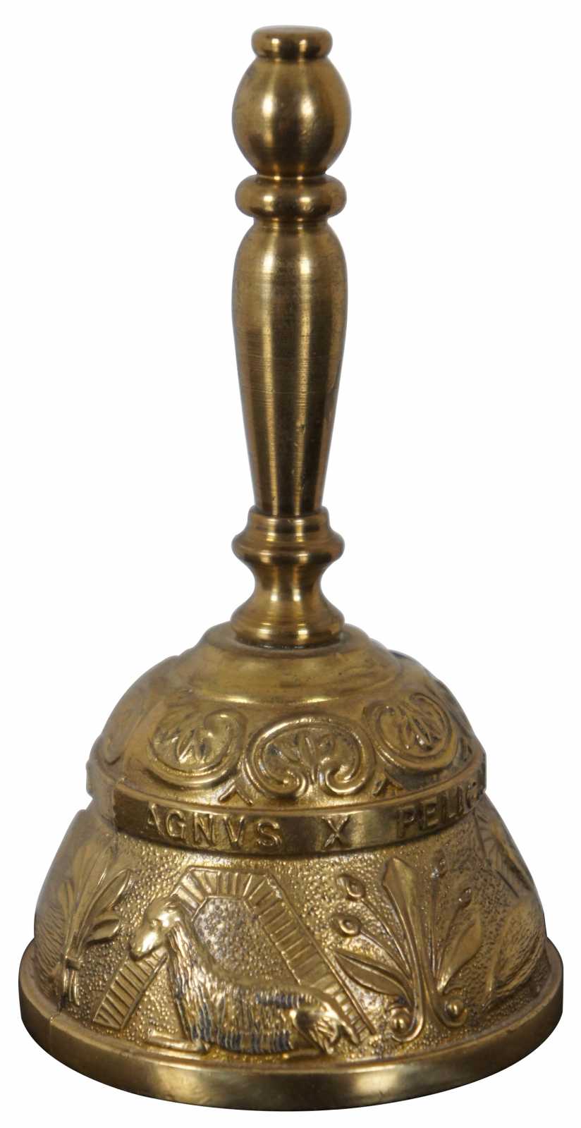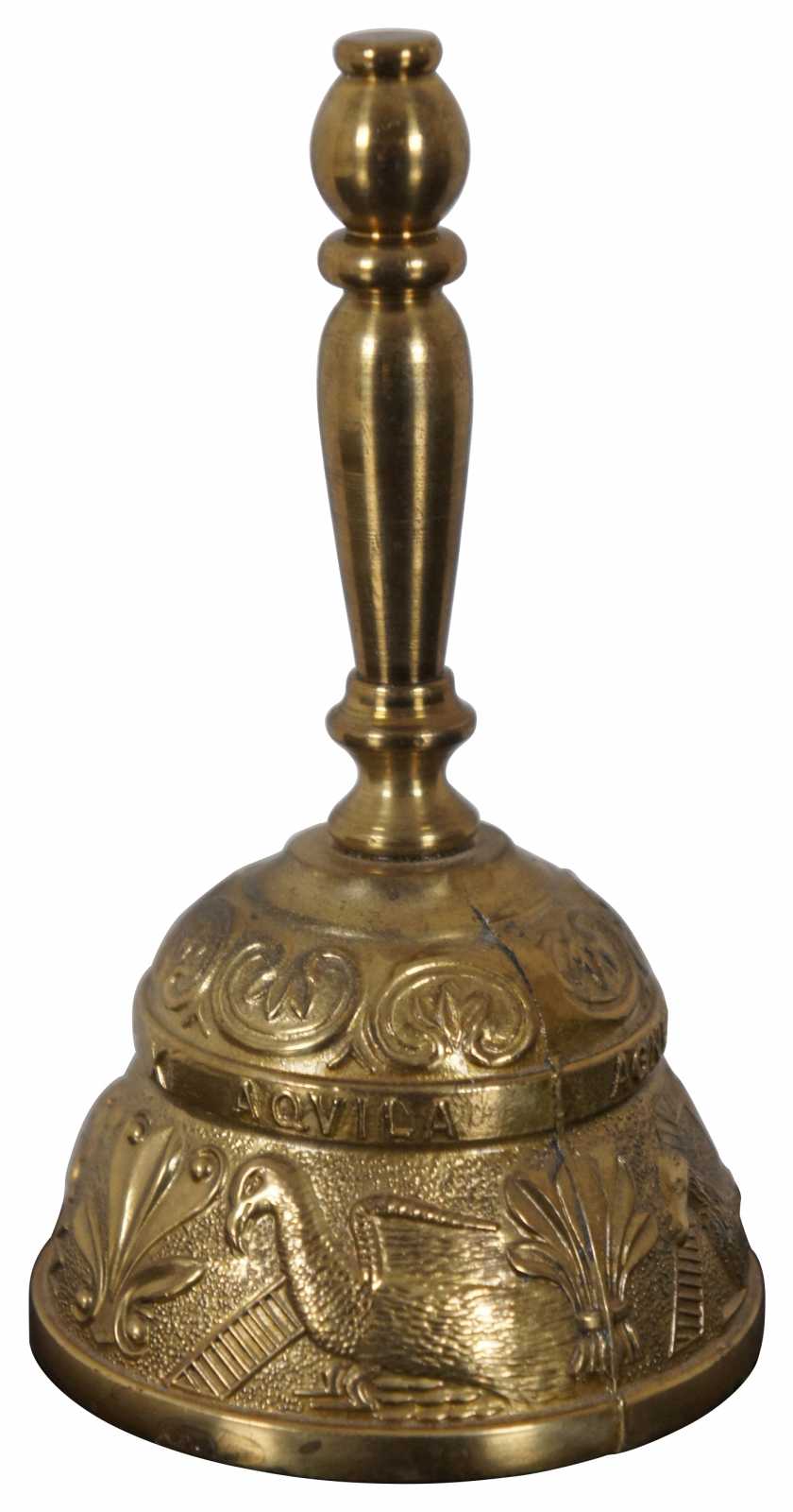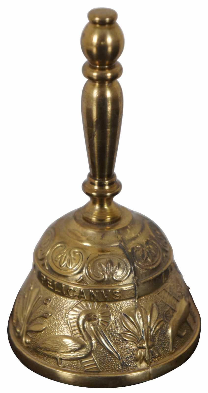 Vintage made in England brass sanctuary bell inscribed with animals and their names in Latin: Leo (lion), Aqvila (eagle), Agnvs (lamb), and Pelicanvs (pelican).