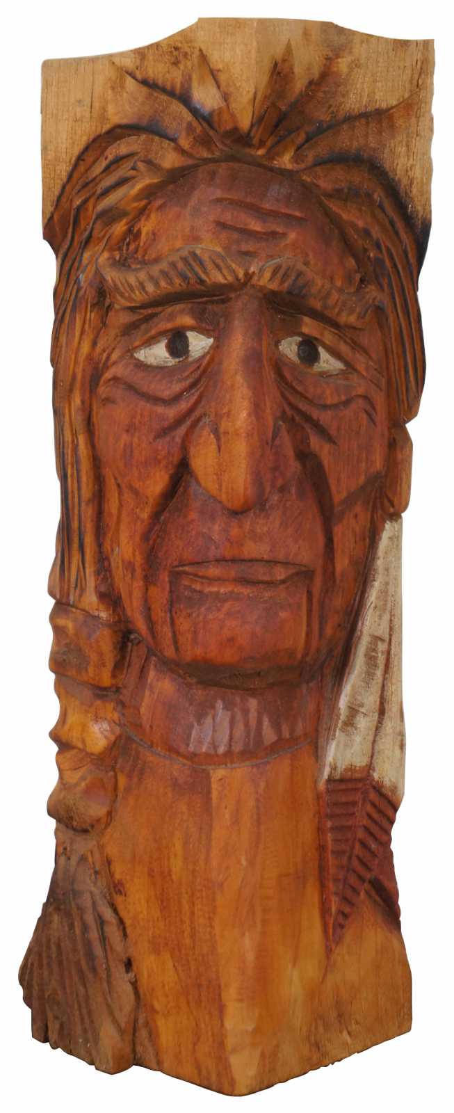 Vintage hand carved wooden log bust of an elderly American Indian Chief / man with braids and eagle feathers.