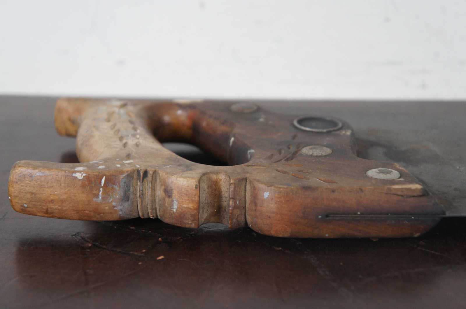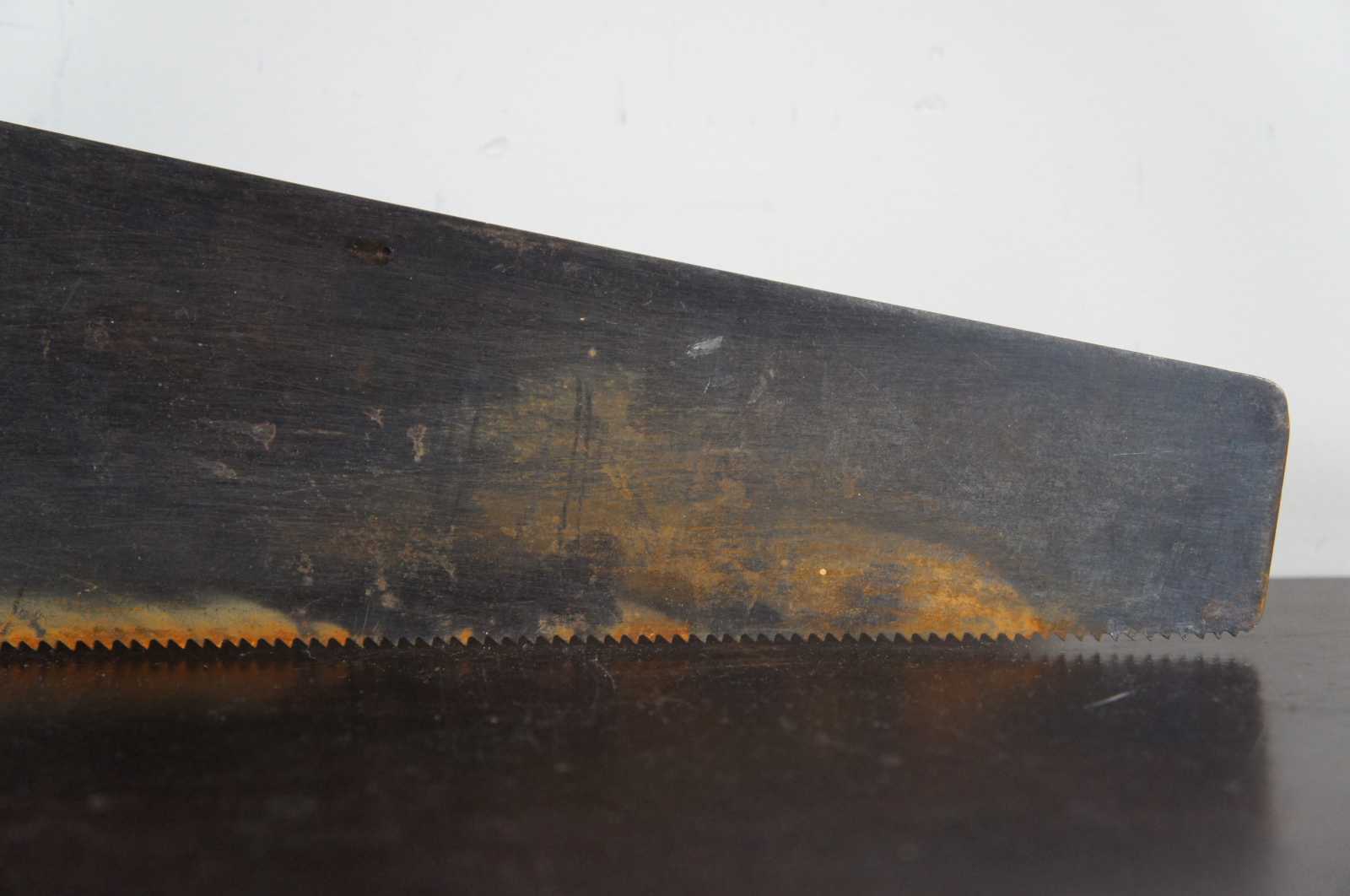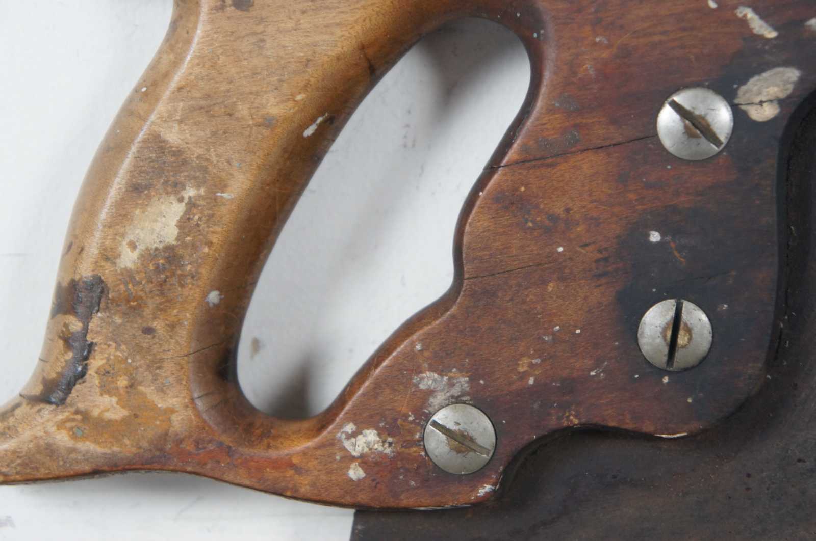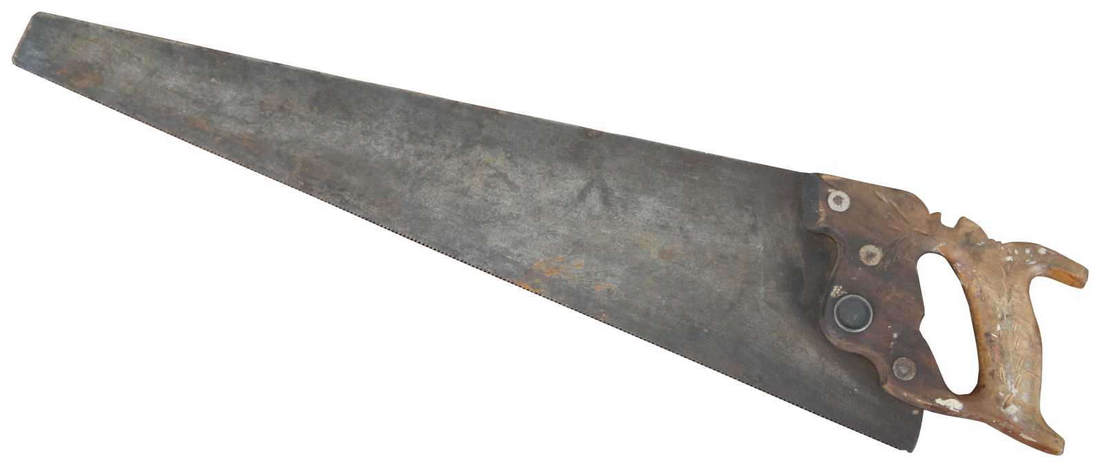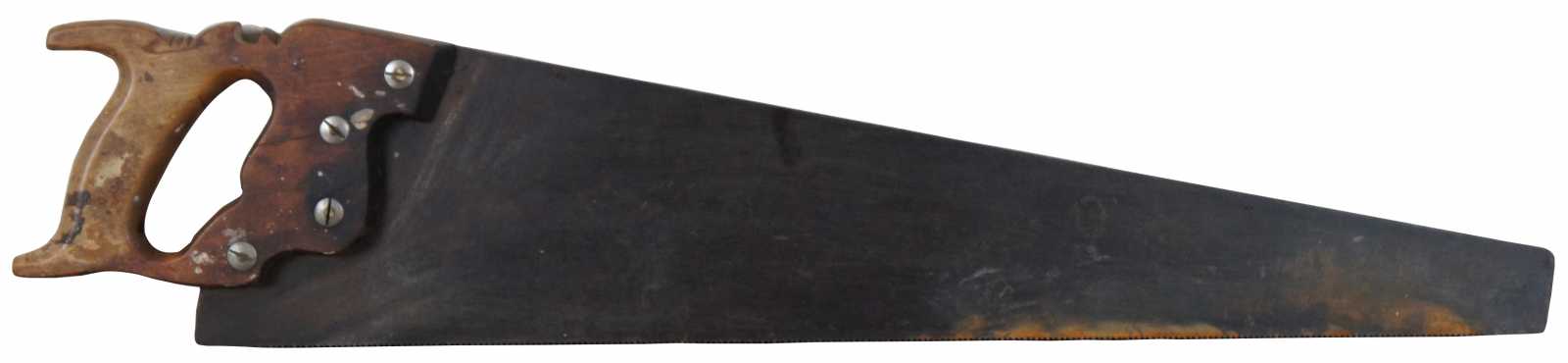 E.C. Atkins hand saw, manufactured in Indianapolis, Indiana with traditional carved leaves on the handle.“E. C. Atkins & Company was founded in 1855 by Elias C. Atkins in Cleveland, Ohio. Its industry was hardware and tools and its headquarters were in Cleveland, Ohio (1855-1856), Indianapolis, Indiana (1856-1961) and Greenville, Mississippi (1961-1970). In 1952, the company was acquired by the Borg-Warner Corporation. The Atkins division was sold to the Nicholson File Company in 1966. In 1970, the Greenville plant was renamed Nicholson File Company in place of Atkins Saw.