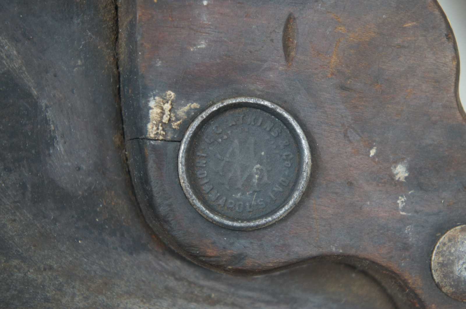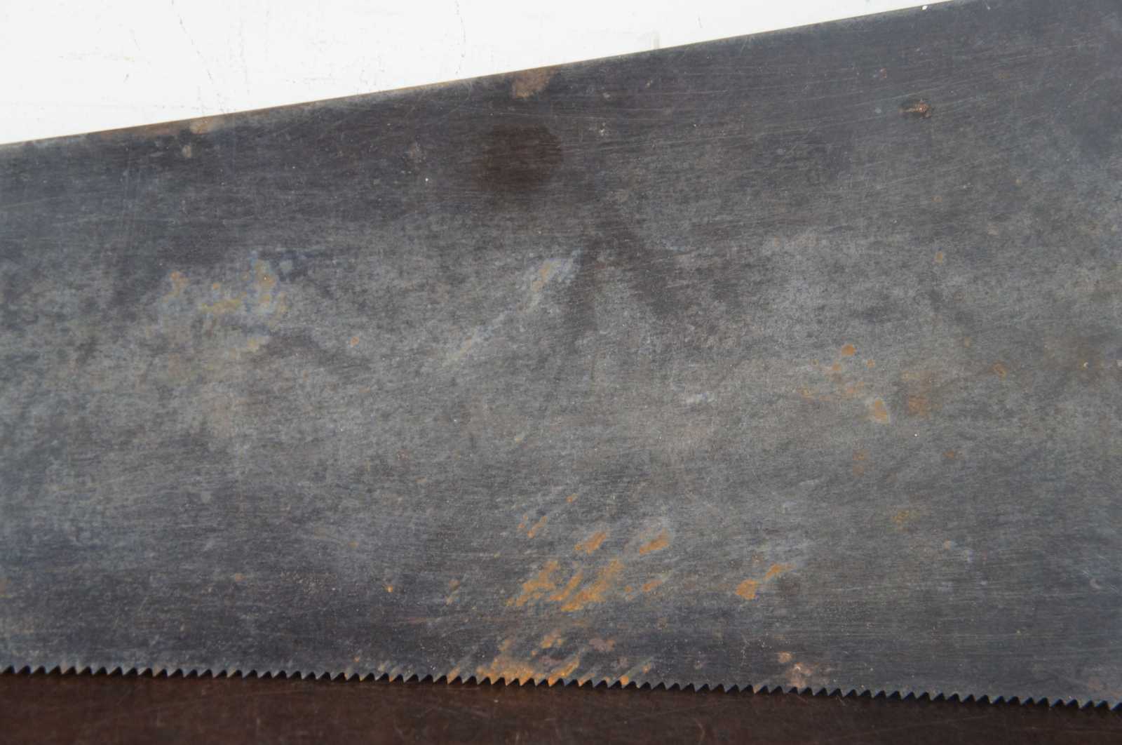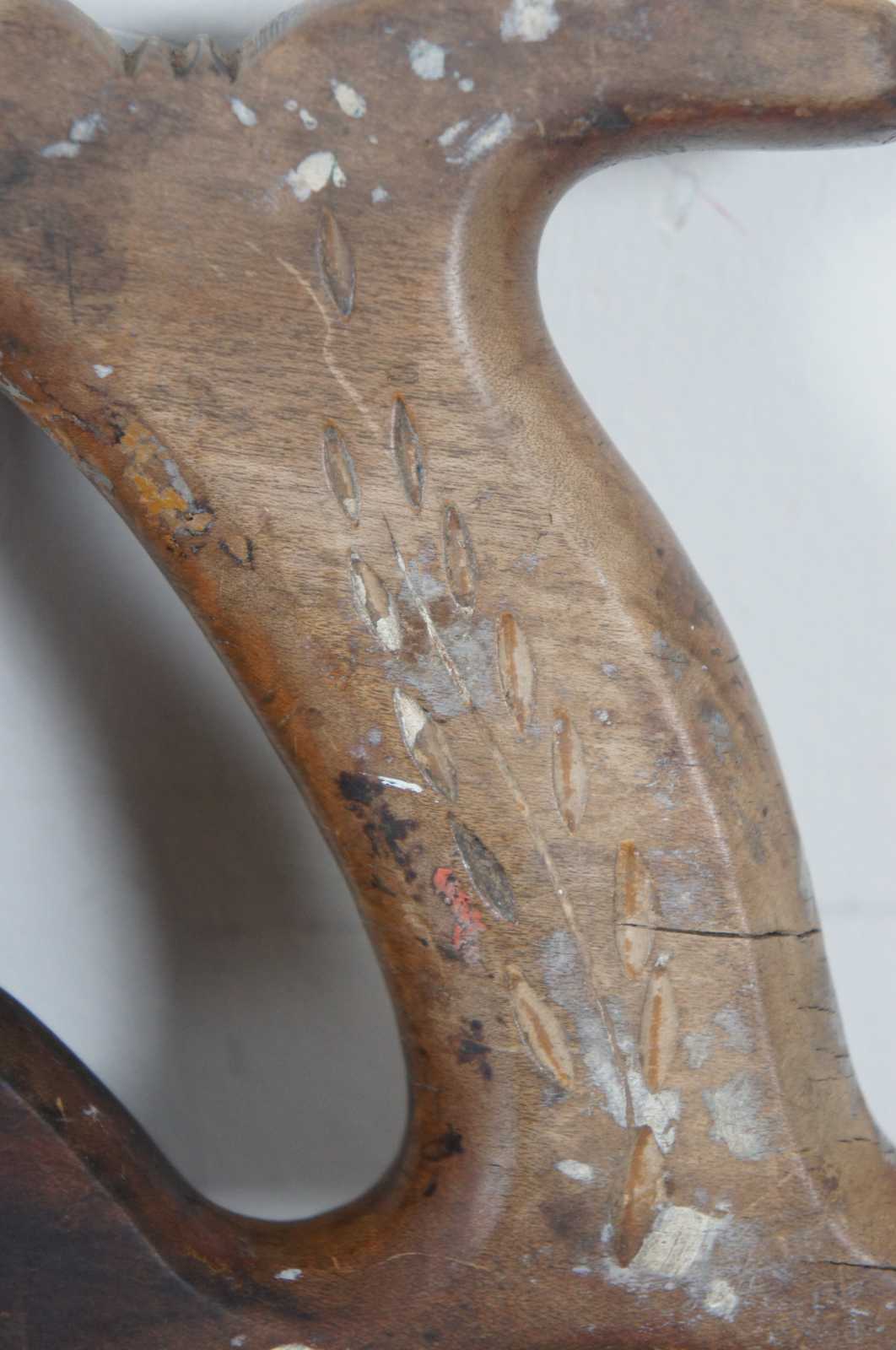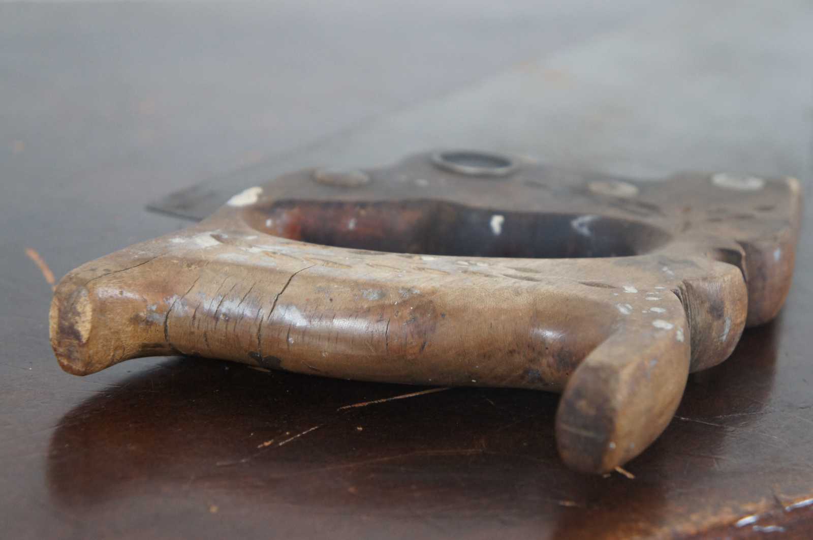 E.C. Atkins hand saw, manufactured in Indianapolis, Indiana with traditional carved leaves on the handle.“E. C. Atkins & Company was founded in 1855 by Elias C. Atkins in Cleveland, Ohio. Its industry was hardware and tools and its headquarters were in Cleveland, Ohio (1855-1856), Indianapolis, Indiana (1856-1961) and Greenville, Mississippi (1961-1970). In 1952, the company was acquired by the Borg-Warner Corporation. The Atkins division was sold to the Nicholson File Company in 1966. In 1970, the Greenville plant was renamed Nicholson File Company in place of Atkins Saw.