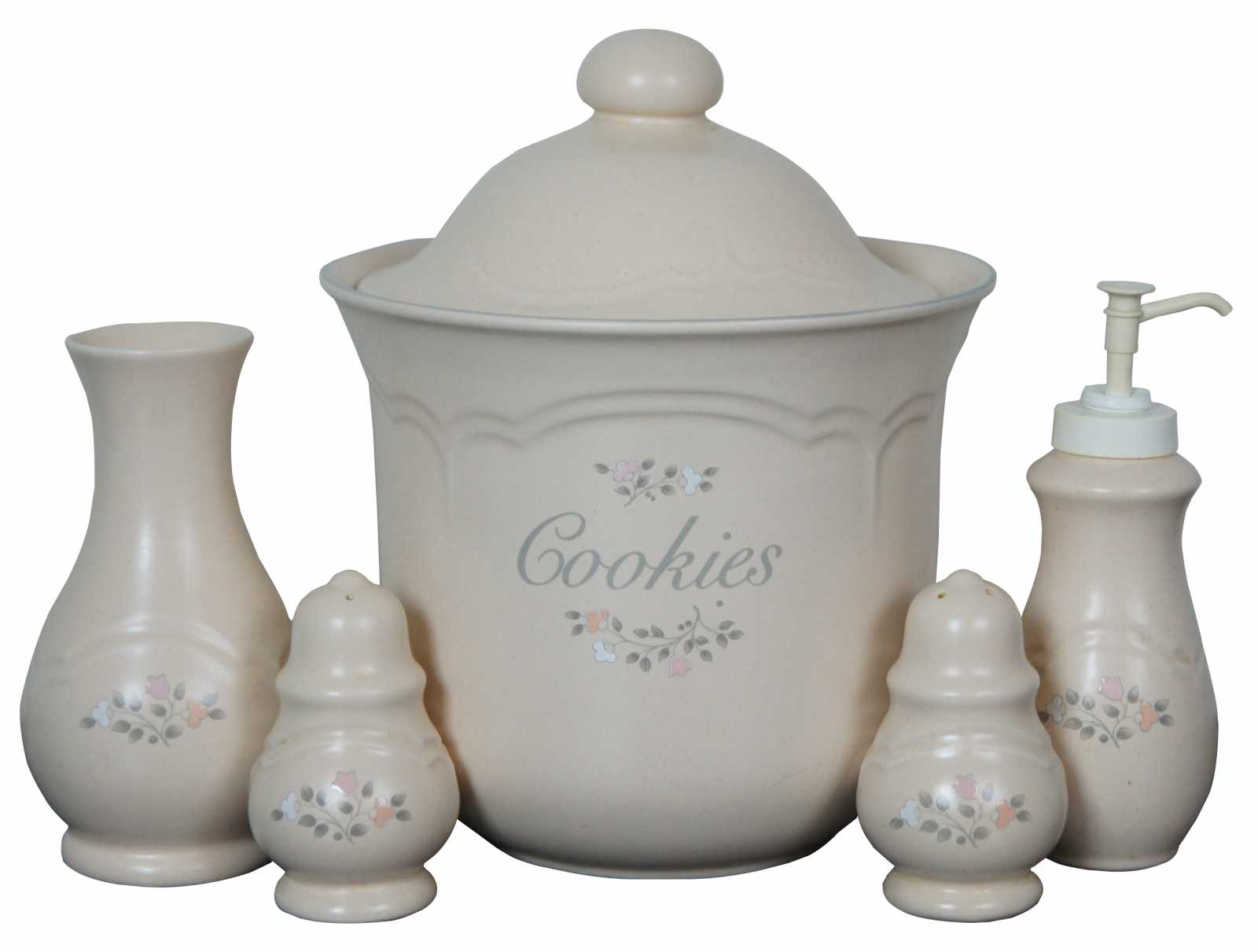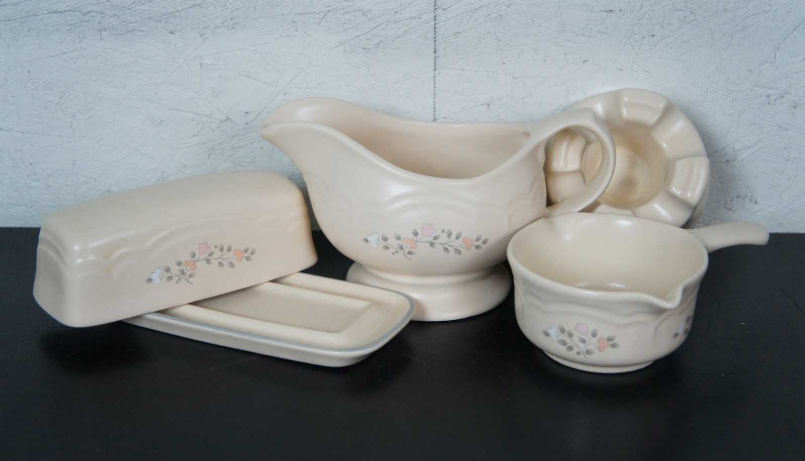 Butter Dish & Lid - 7.125” x 3.125” x 2.5” / Cookie Jar & Lid- 7.75” x 9.5” / Oval Platter - 14.5” x 10.25” x 1.375” / Scalloped Serving Bowl - 9.5” x 3.625” / 2 Vegetable Bowls - 8.75” x 2.75” / Small Serving Bowl - 7.75” x 2.5” / 6 Dinner Plates - 10.25” x 1.25” / Cookbook - 7” x 0.75” x 9.25” / 9 Salad Plates - 7.25” x 1” / 6 Soup/Cereal Bowls - 6” x 2.25” / Napkin Holder - 6.75” x 2.5” x 3.625” / 4 Sherbet Bowls - 4.5” x 3” / 8 Wine Goblets - 3” x 6.5” / 8 Saucers - 5.75” x 1” / Potpourri Warmer Base - 4.25” x 2.25” / Potpourri Warmer Pot - 6” x 4.75” x 2.125” / Vase - 3.25” x 6” / Lotion Dispenser - 2.25” x 6.75” / Candlestick - 3.25” x 5” / Gravy Server - 8” x 4.25” x 4.25” / Trivet - 7.5” x 7.25” x 0.5” / 8 Mugs - 3.5” x 3” / 2 Salt & Pepper Shakers - 2.25” x 3.75” / Toothpick Holder - 2.5” x 2.375” (Width x Depth x Height/Diameter x Height)