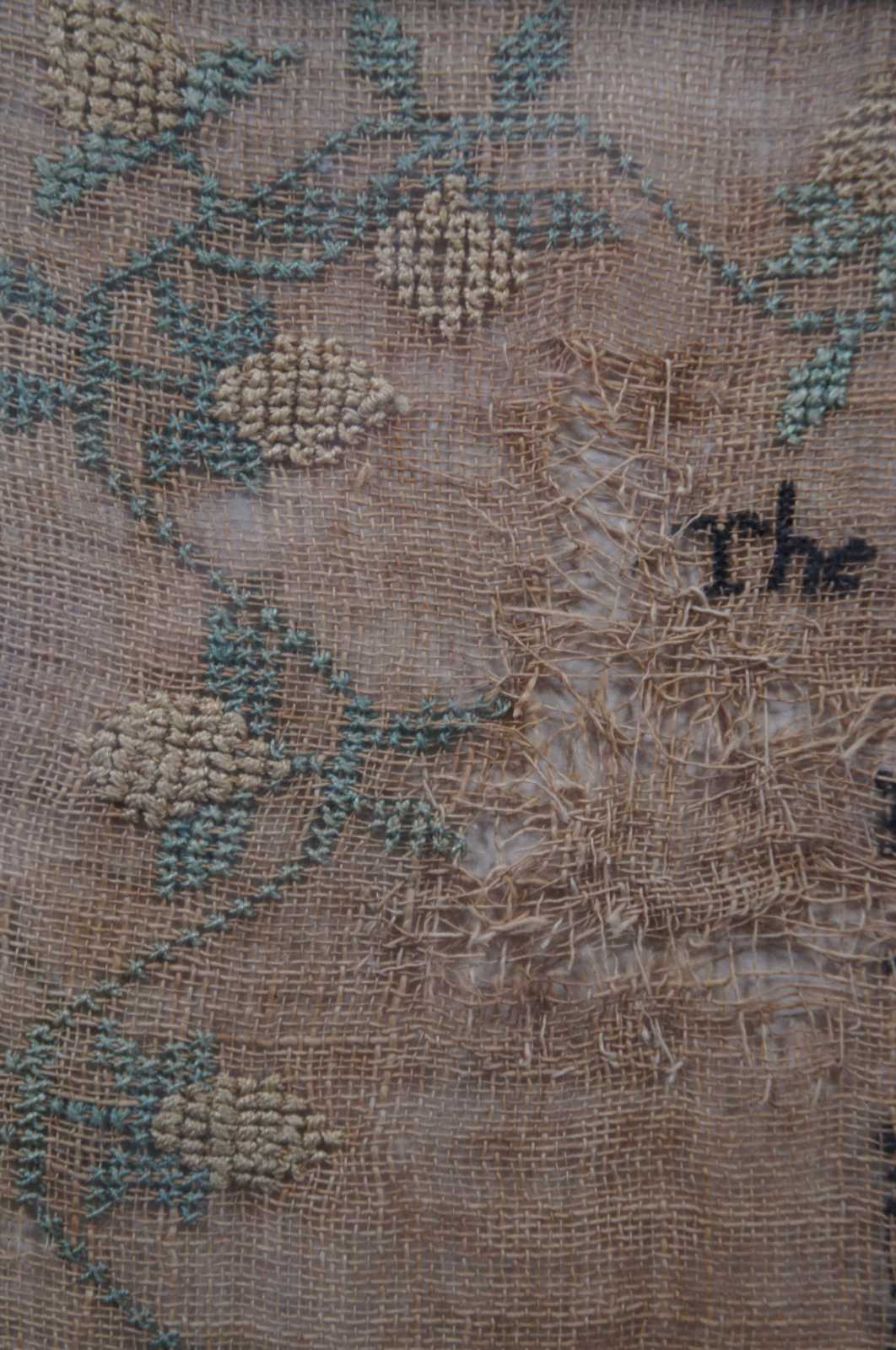 Antique 18th century child’s cross stitch sampler featuring a religious Christian poem above a scene with a house and a shepherd tending a flock of sheep, framed in flowers. “The Lord my pasture shall prepare And feed me with a shepherds care: His presence shall my wants supply, and guard me with a watchful eye. My steadfast heart shall fear no ill, For thou, O Lord: art with me still. Thy friendly crook shall give me aid, And guide me through the dreadful shade. - Catherine Crane, Aged 11 Years.”