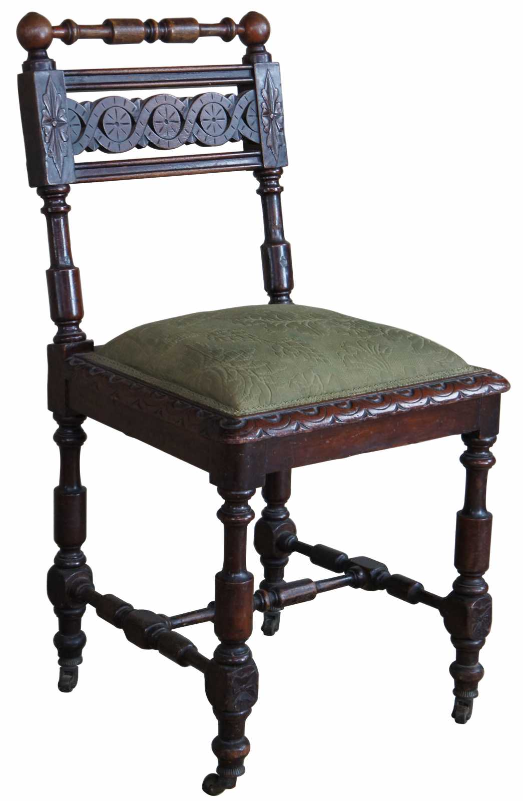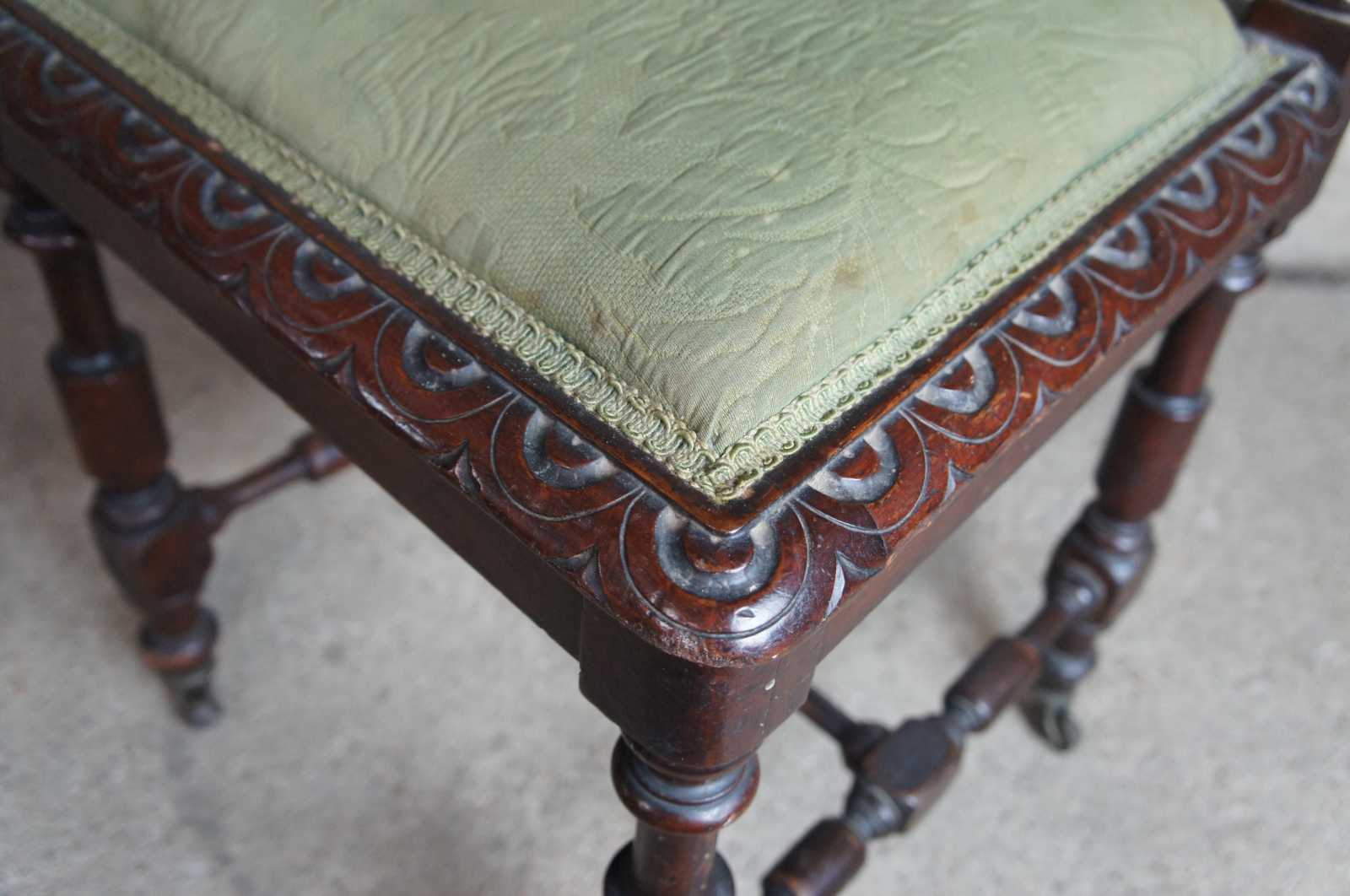 Antique 19th century Charles II style side or desk chair. Made from oak with ornately carved details. Features a ball and stick design along the back rail over a unique pierced helix design between carved medallions. The green upholstered seat is nicely framed by a repeating crescent carving. The chair is supported by four turned over castors and is connected by an H stretcher.