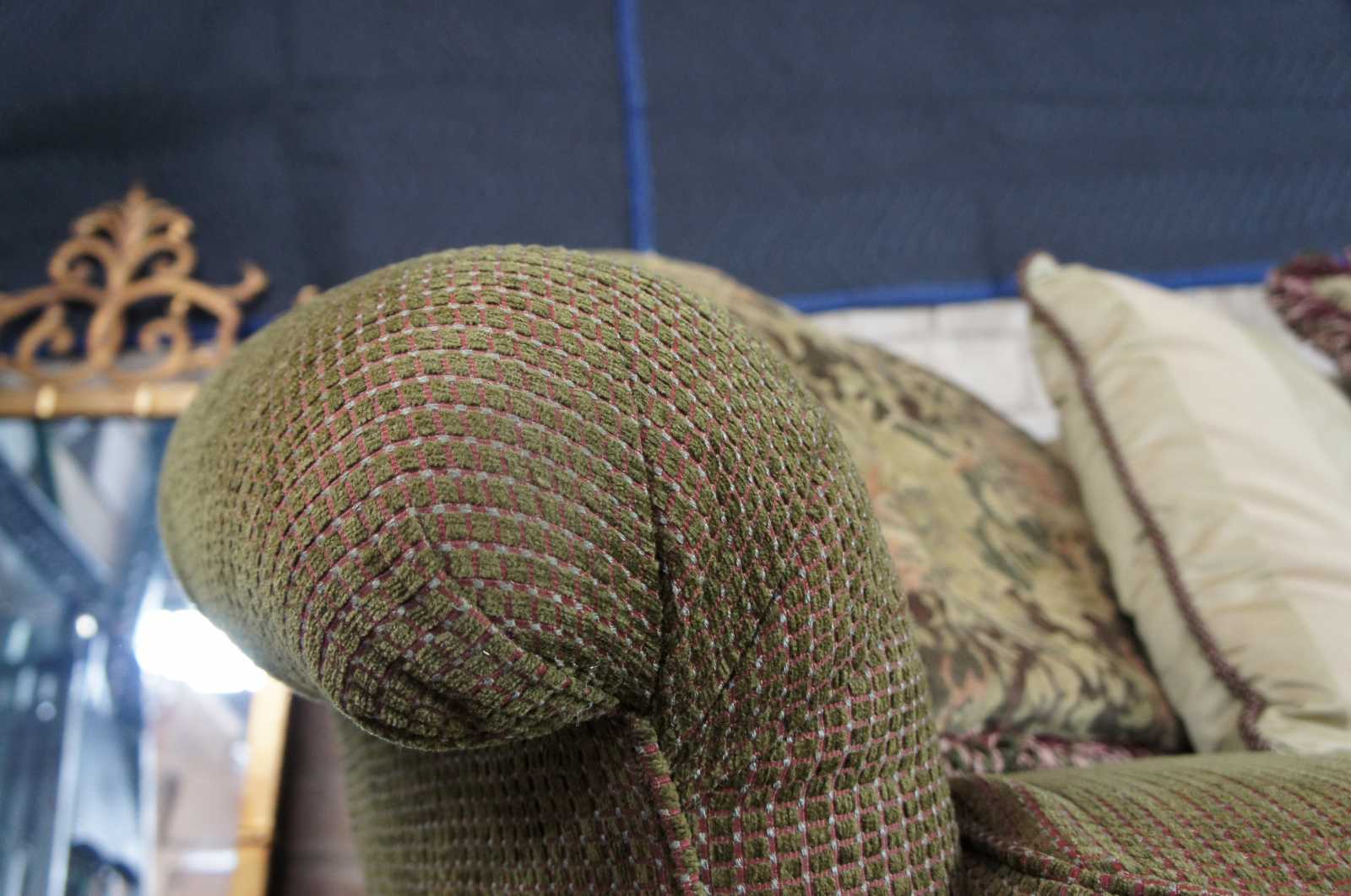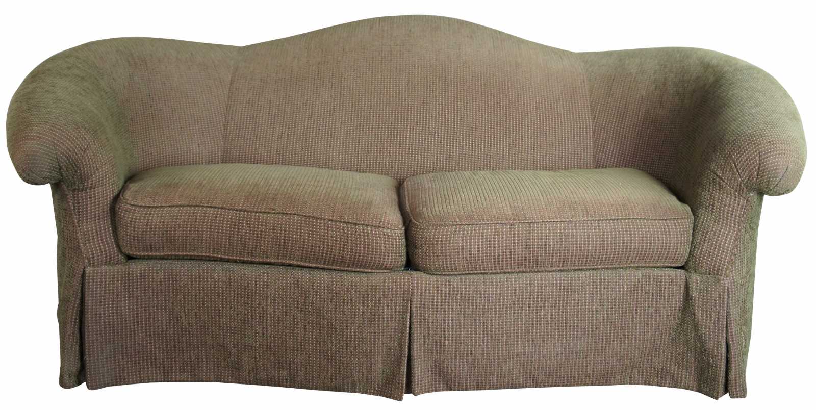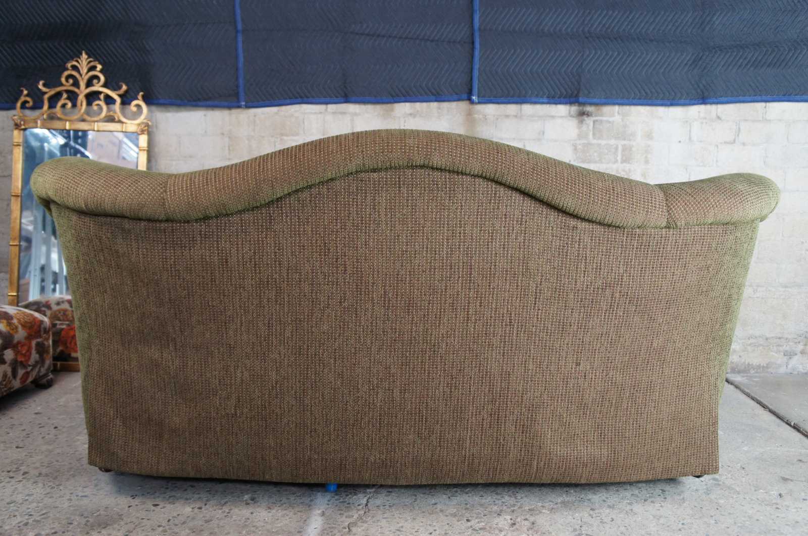 Vintage Hickory White camel back sofa or love seat. Features serpentine camel back with overstuffed rolled arms with green and maroon fabric and black oak stained legs.