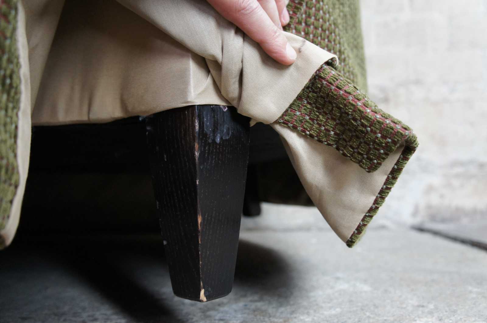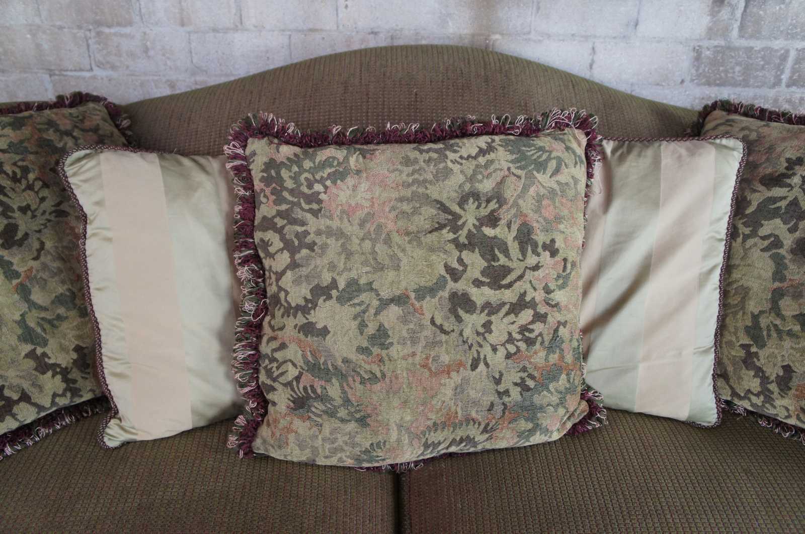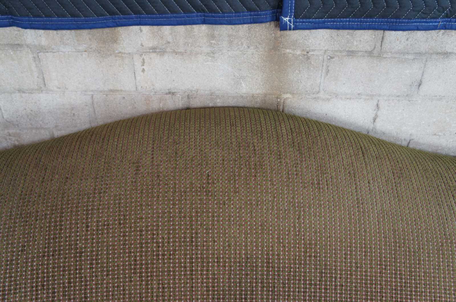 Vintage Hickory White camel back sofa or love seat. Features serpentine camel back with overstuffed rolled arms with green and maroon fabric and black oak stained legs.