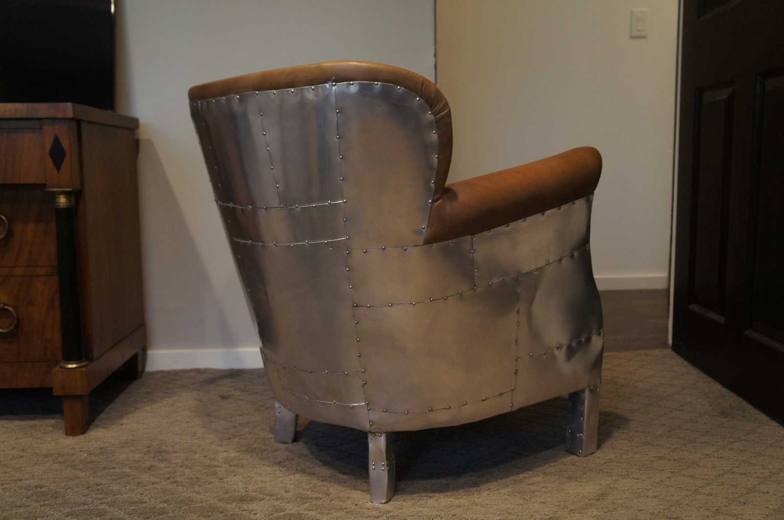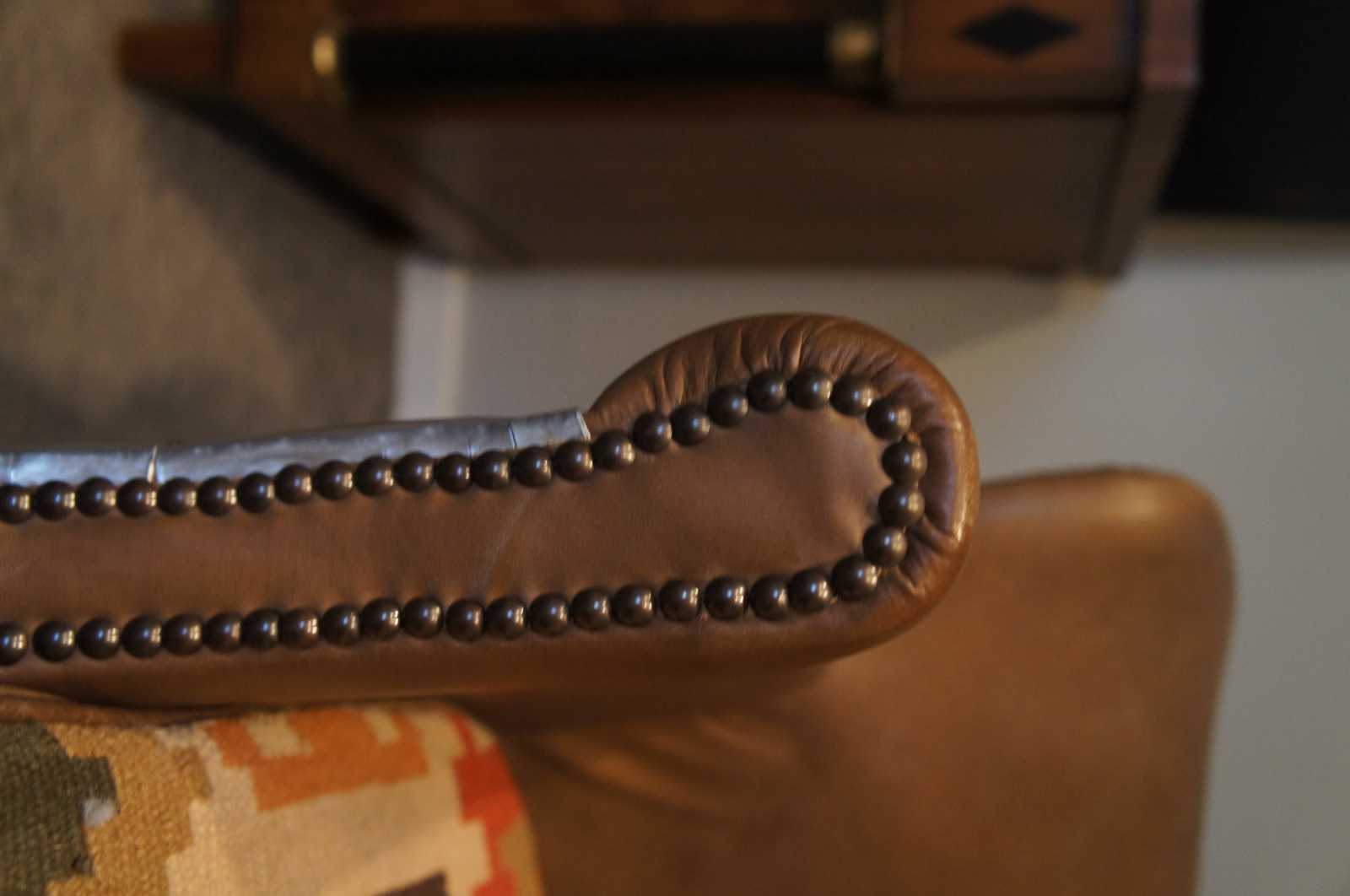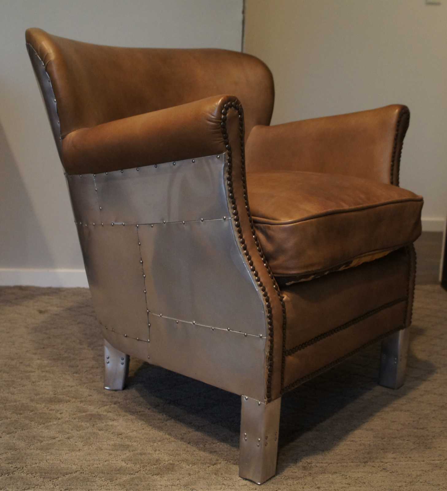 Small in stature, grand in style, the Professor's Chair provides all the presence and comfort of its larger kin. A 1920s English wing chair by design, its petite proportions and enveloping embrace offer seating on a more intimate scale. Upholstered with a down-feather fill and tailored with refined welting and nailhead trim. A special version with the Aviator aluminum flare and southwestn fabric along one side of seat.