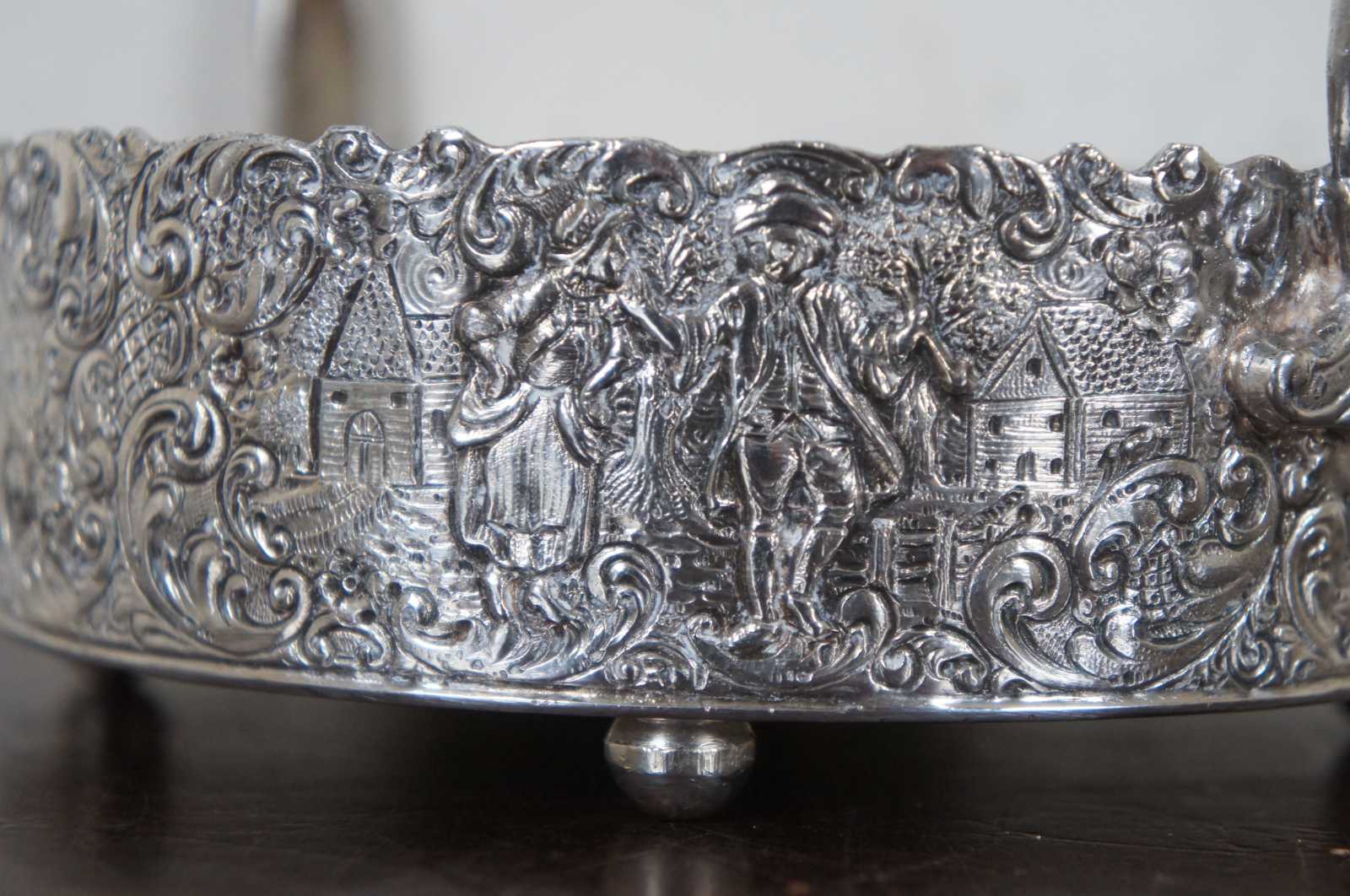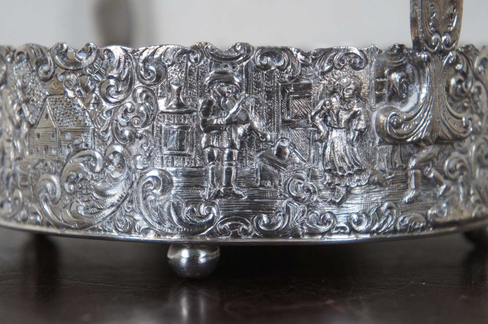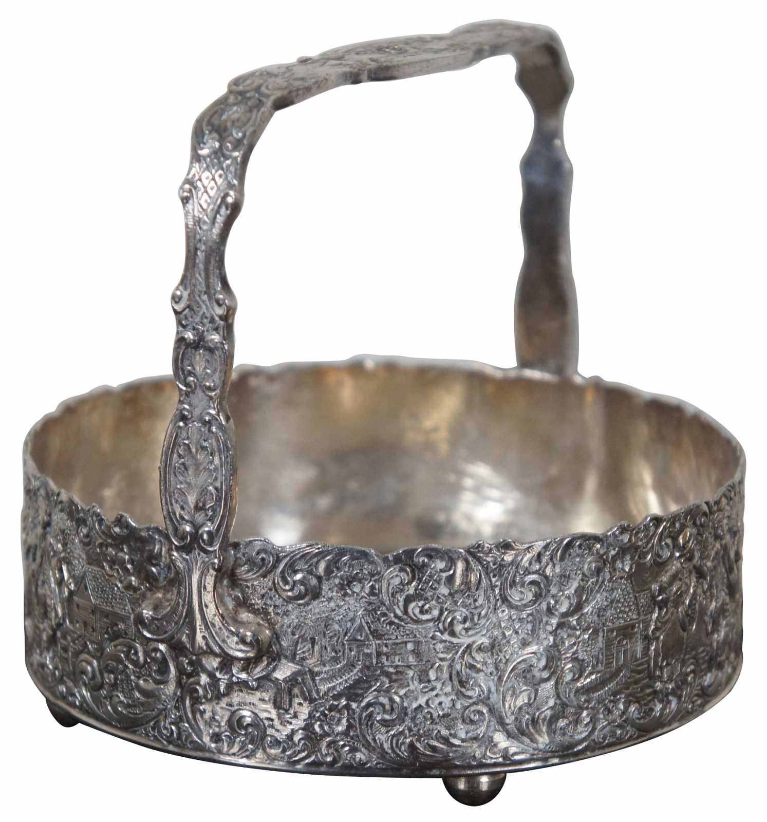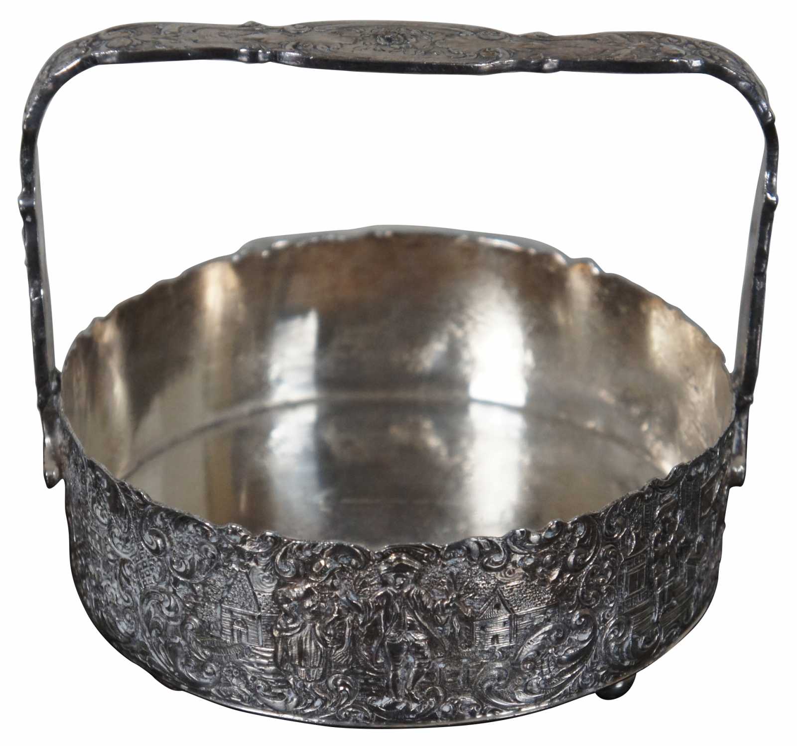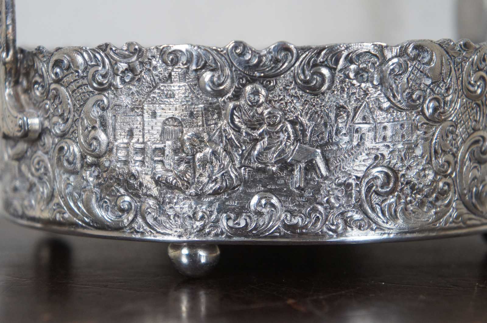 Antique silver plate basket shaped cruet or condiment caddy with molded scenes of figures in a European type village.