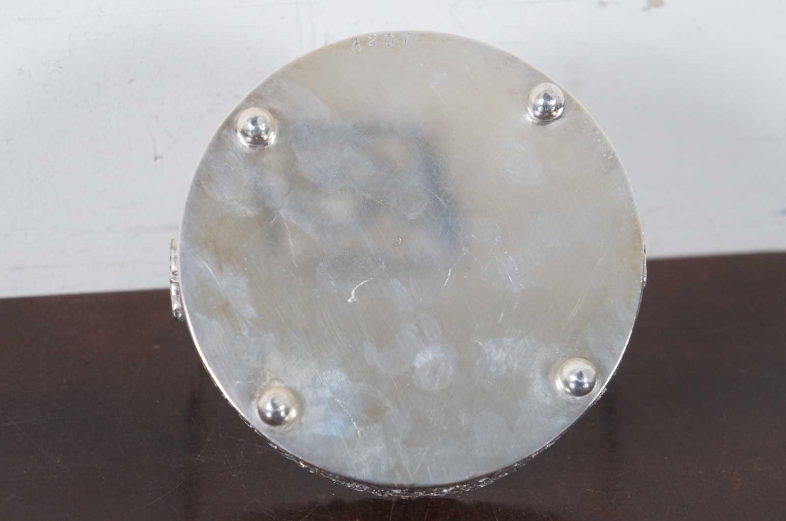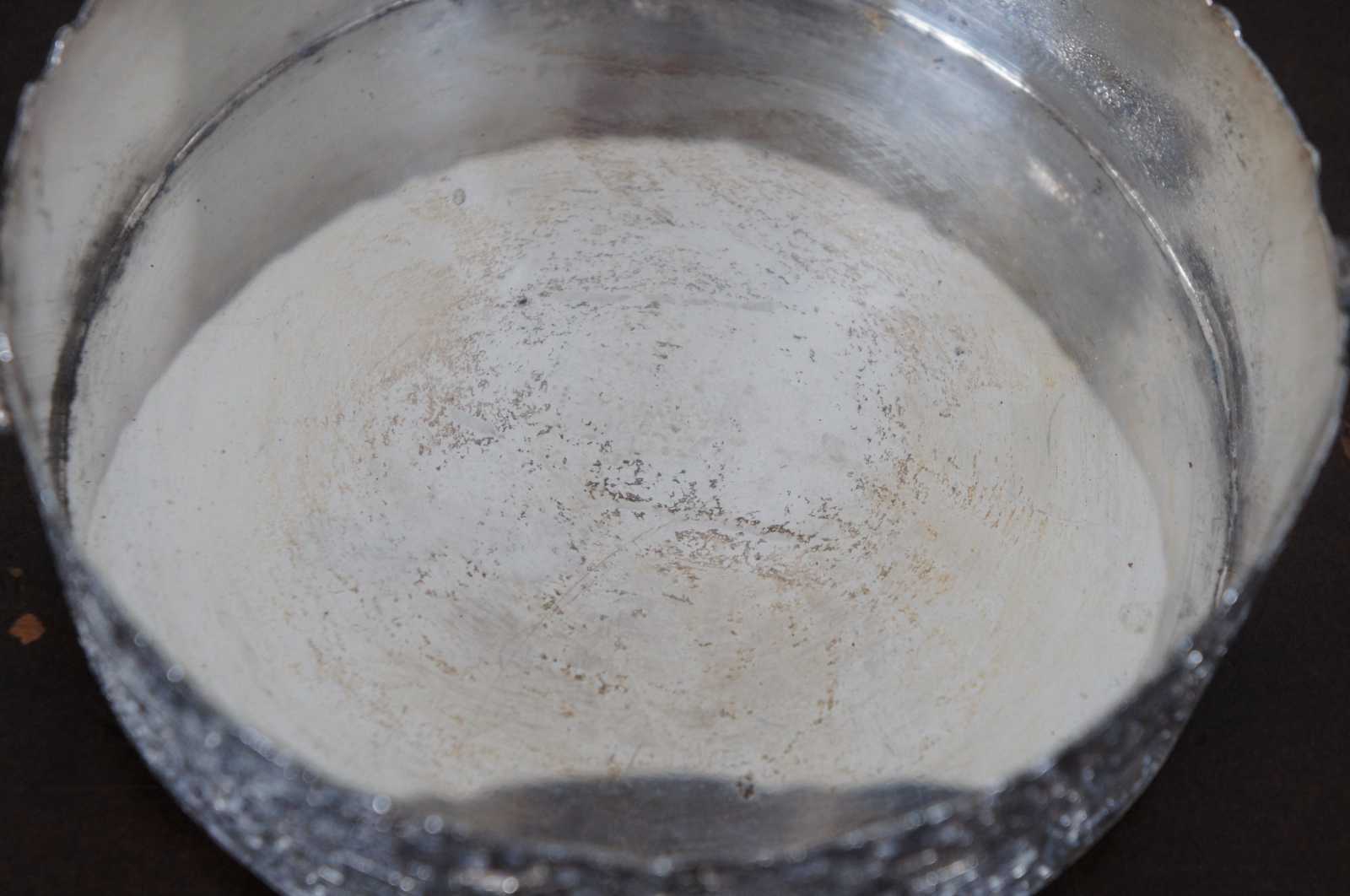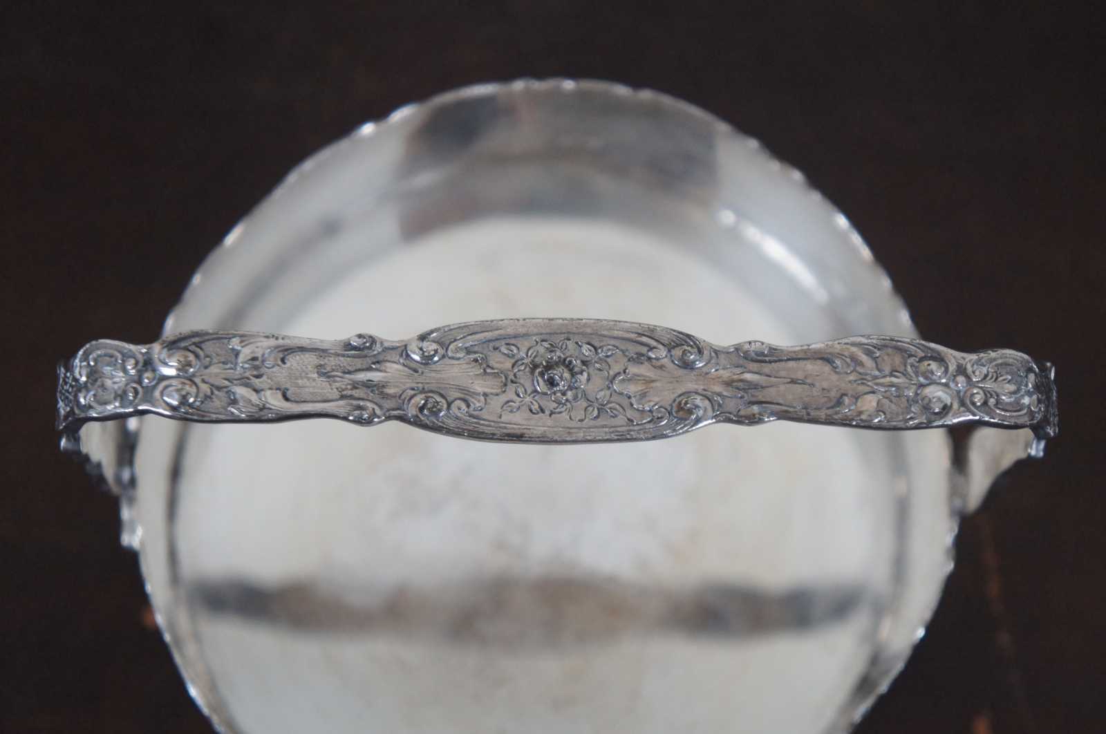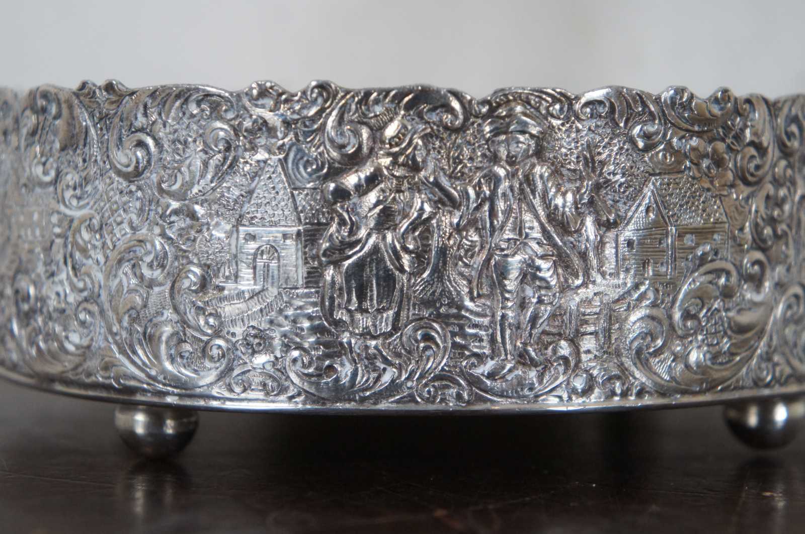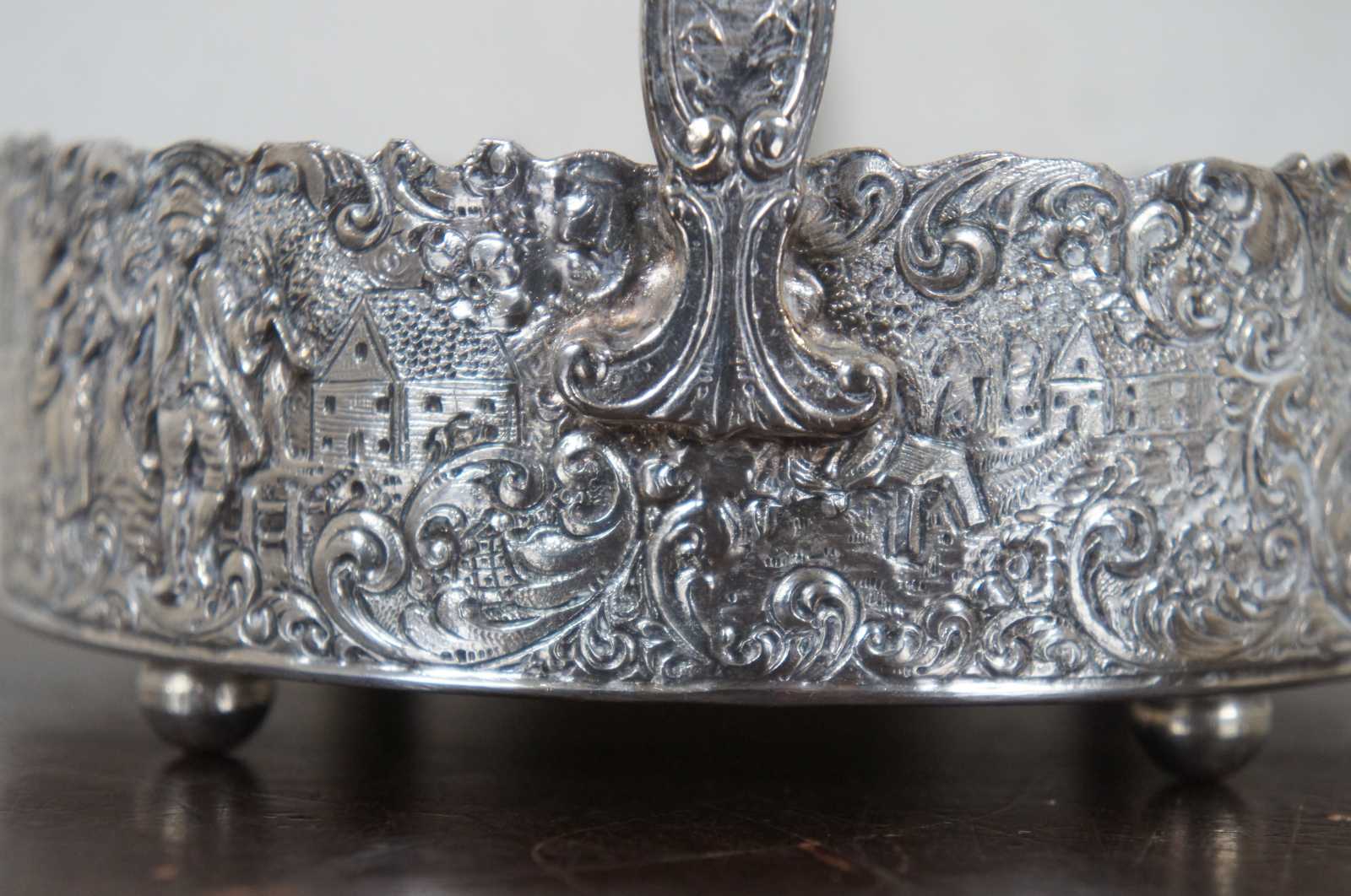 Antique silver plate basket shaped cruet or condiment caddy with molded scenes of figures in a European type village.