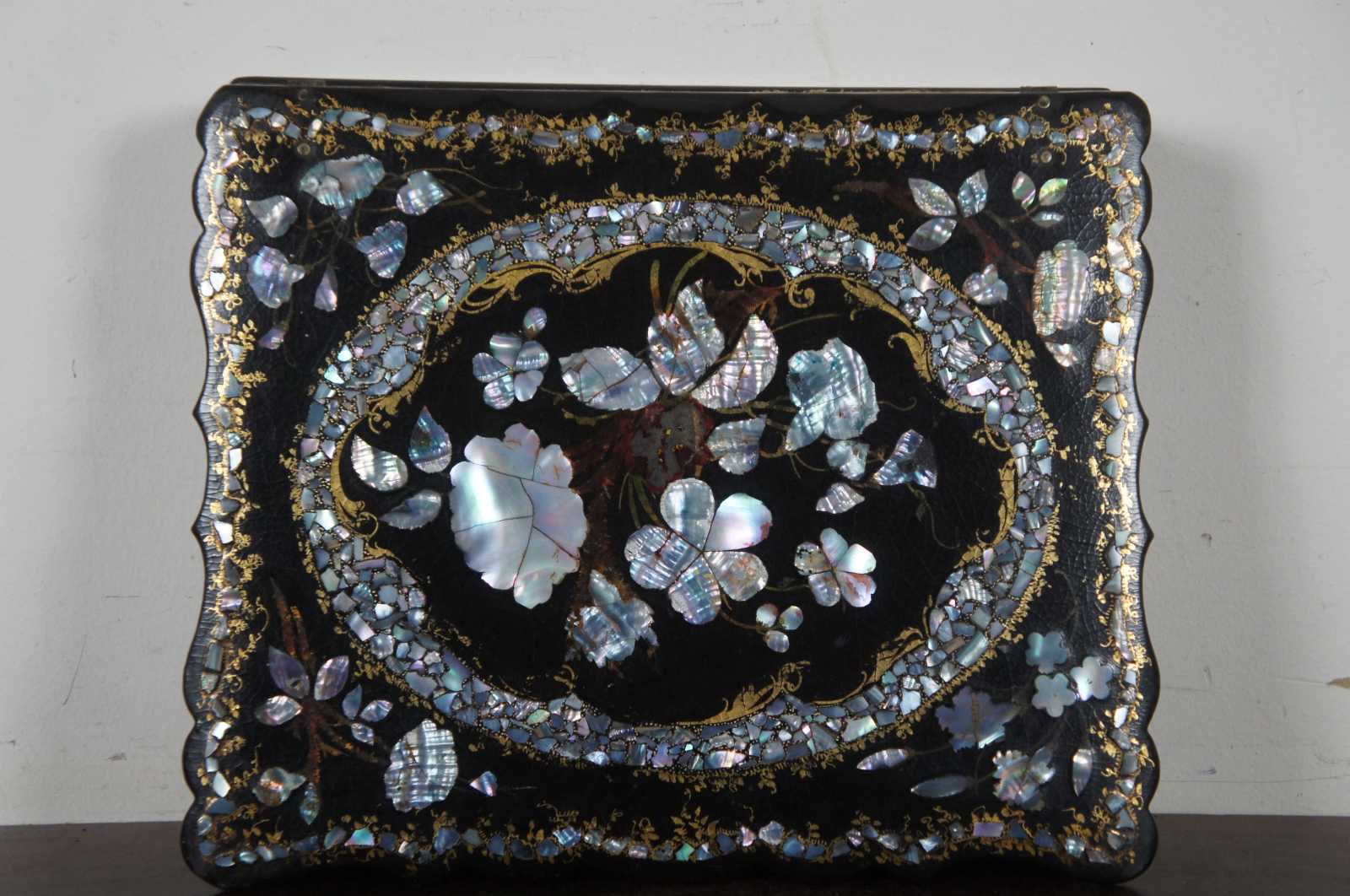 Antique black lacquered, scalloped edge writing slope with gold painted accents setting off a floral inlay of mother of pearl. Interior flat surface is lined with red velvet and includes three compartments for pens and paper. Original lock hardware is included but not attached; no key.