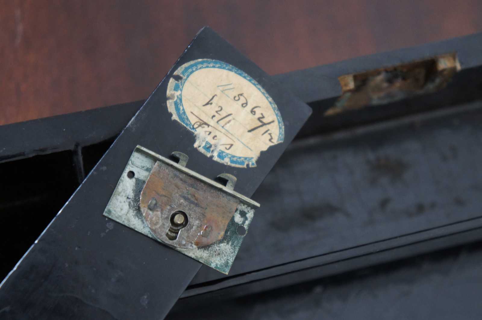 Good Overall - Crazing/chips to lacquer; tarnish/oxidation to hinges; tear/wear to velvet; lock detached; see pictures