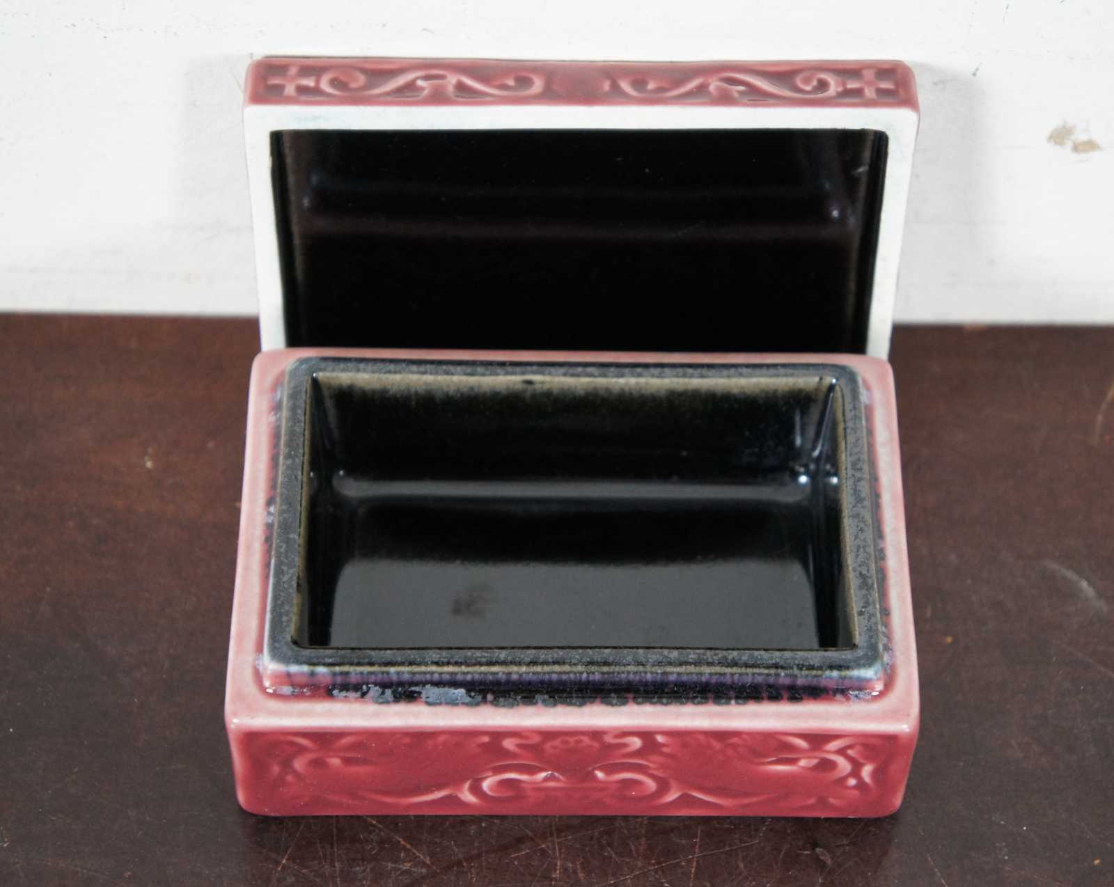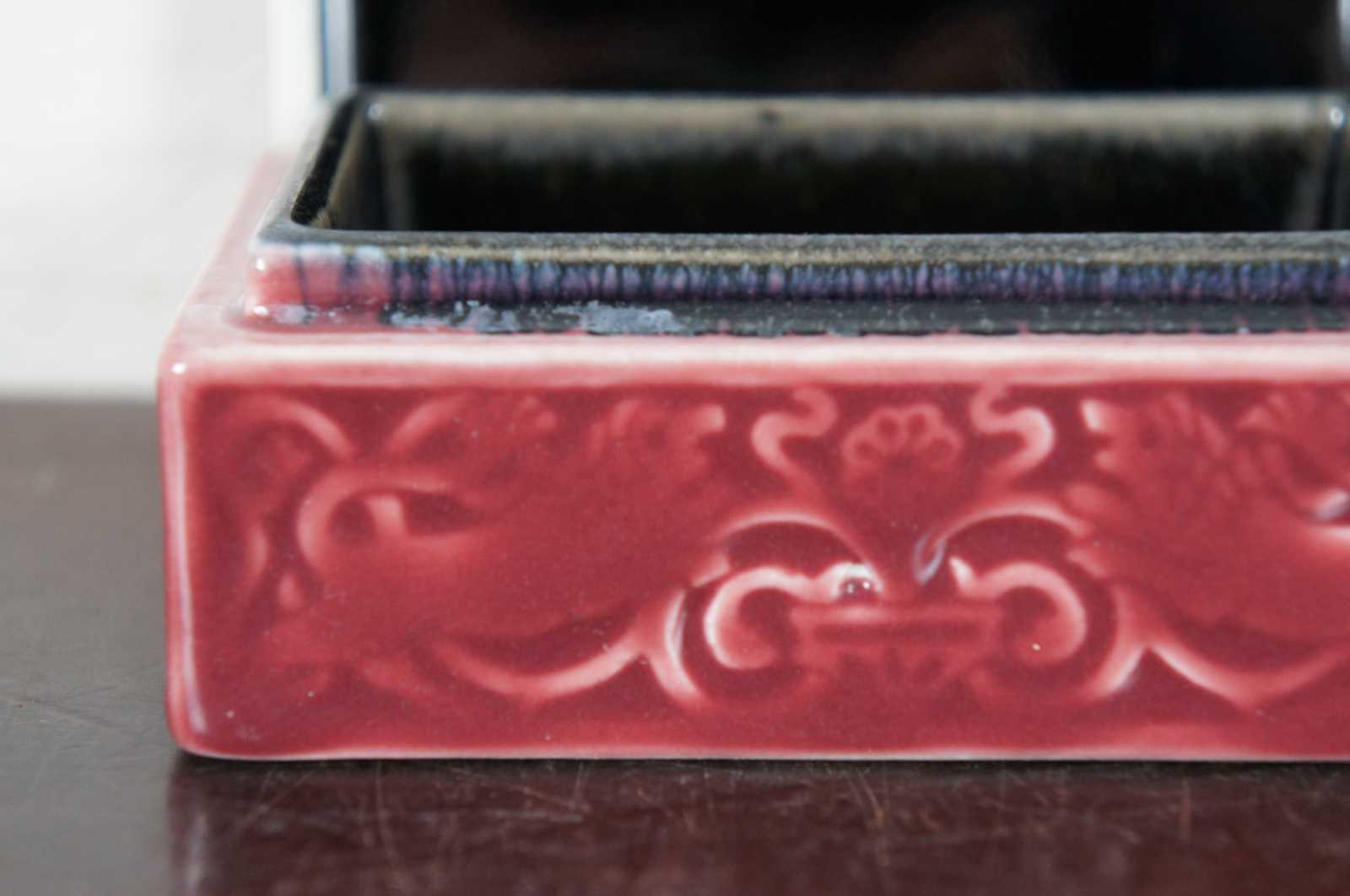 Antique 1922 Rookwood pottery porcelain trinket box finished in a red glaze with a pattern of flowers surrounding an image of the Madonna and Child (Virgin Mary and Baby Jesus). Floral motif throughout with two lions. Shape number 2456.