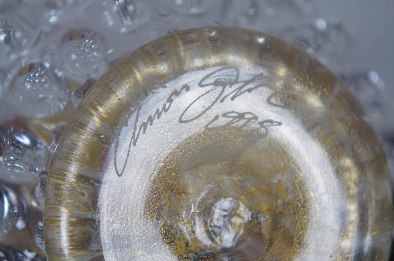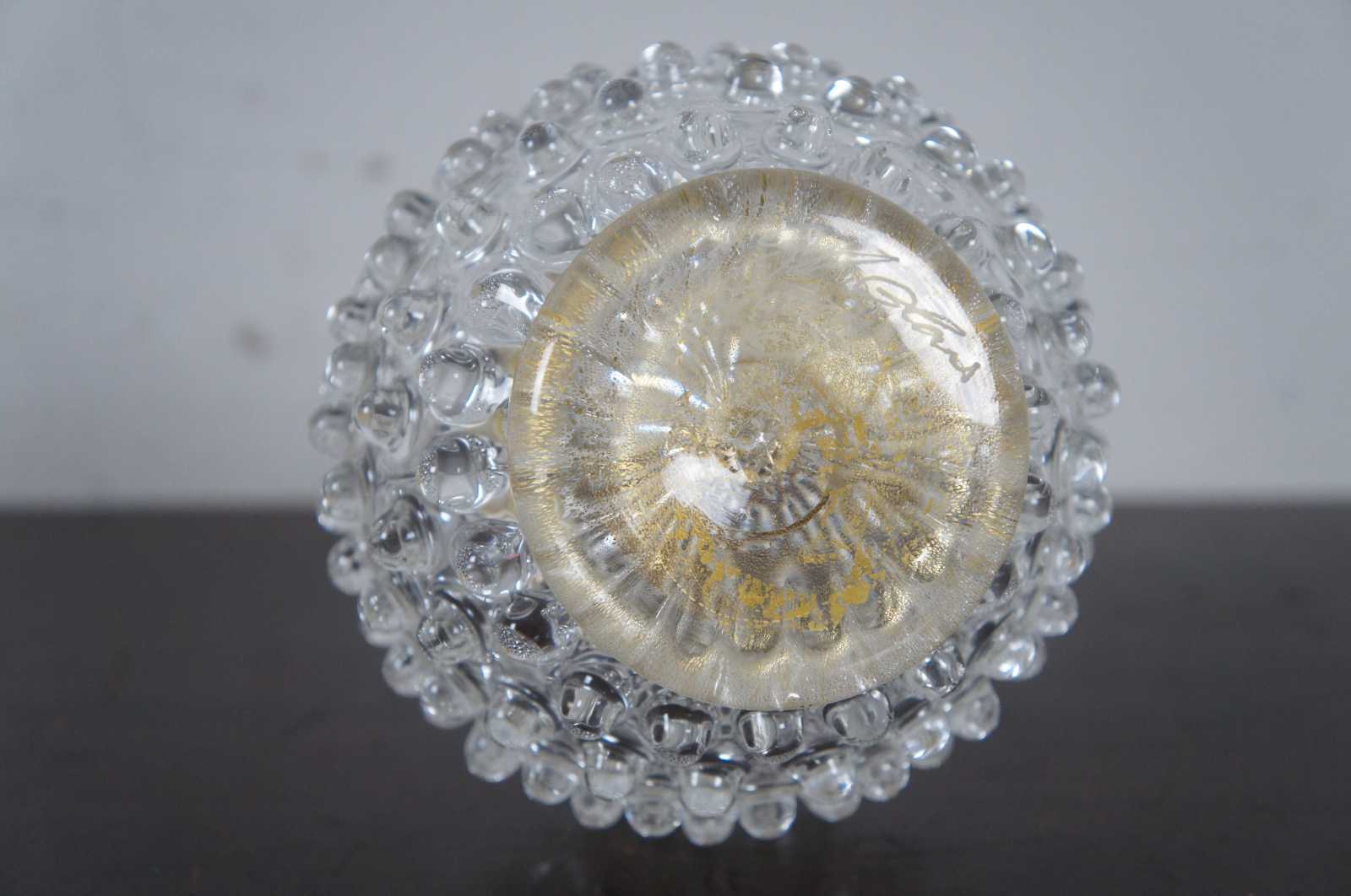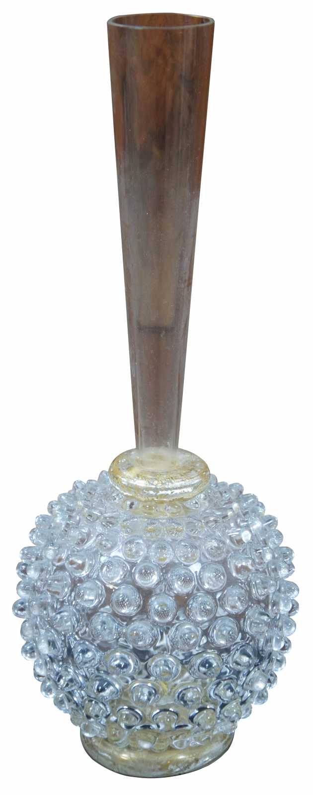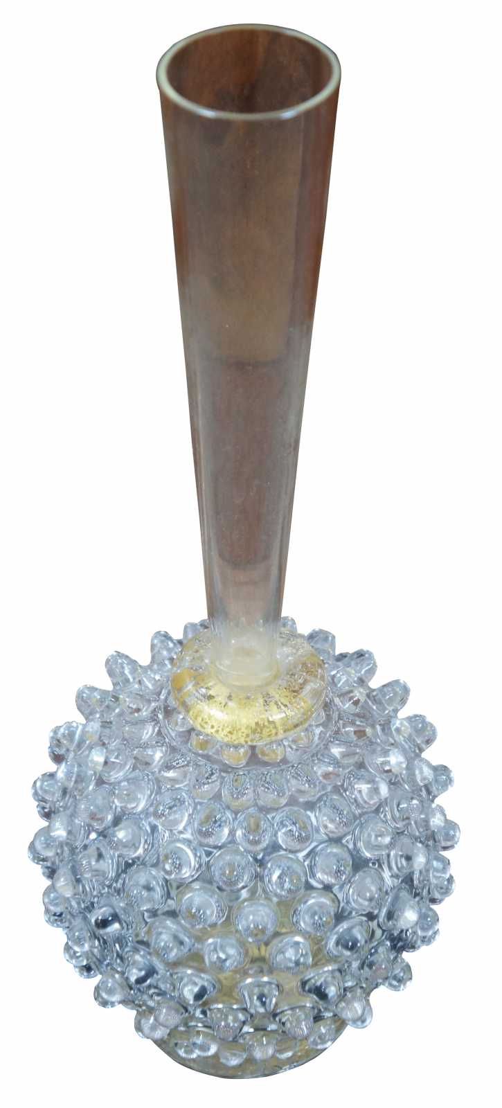 Vintage 1998 signed studio art glass vase with clear tapered neck atop a hobnail textured orb with speckled gold flake collar and foot.