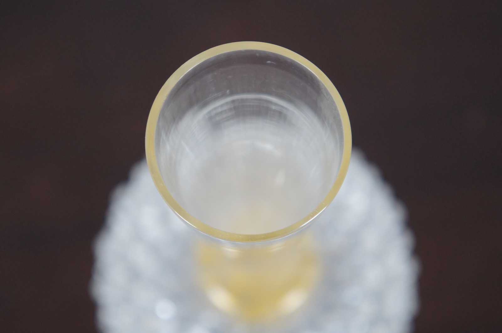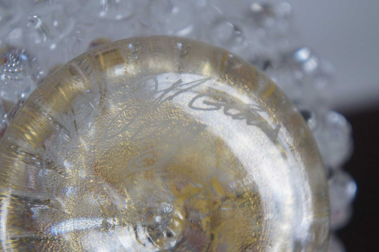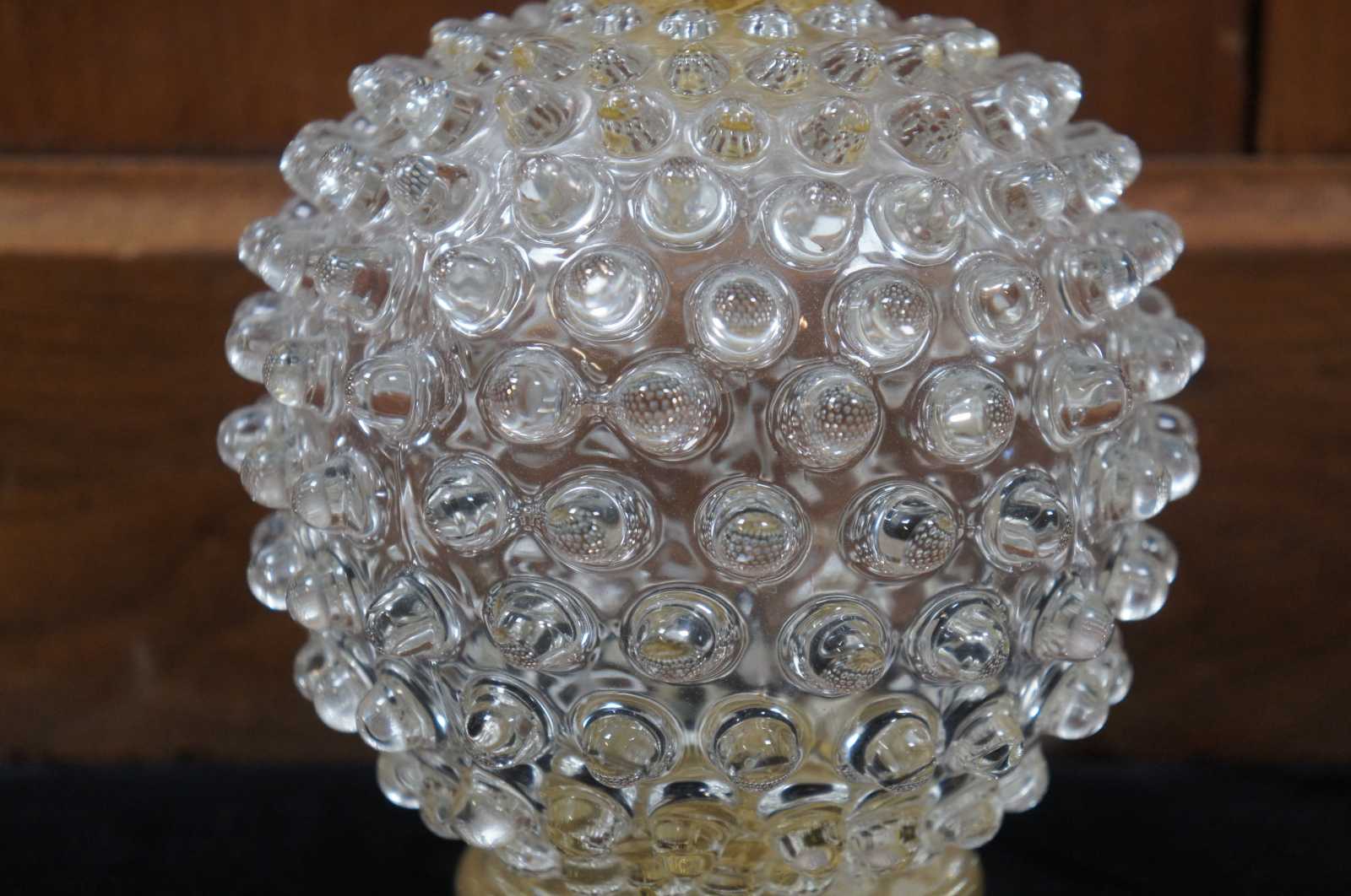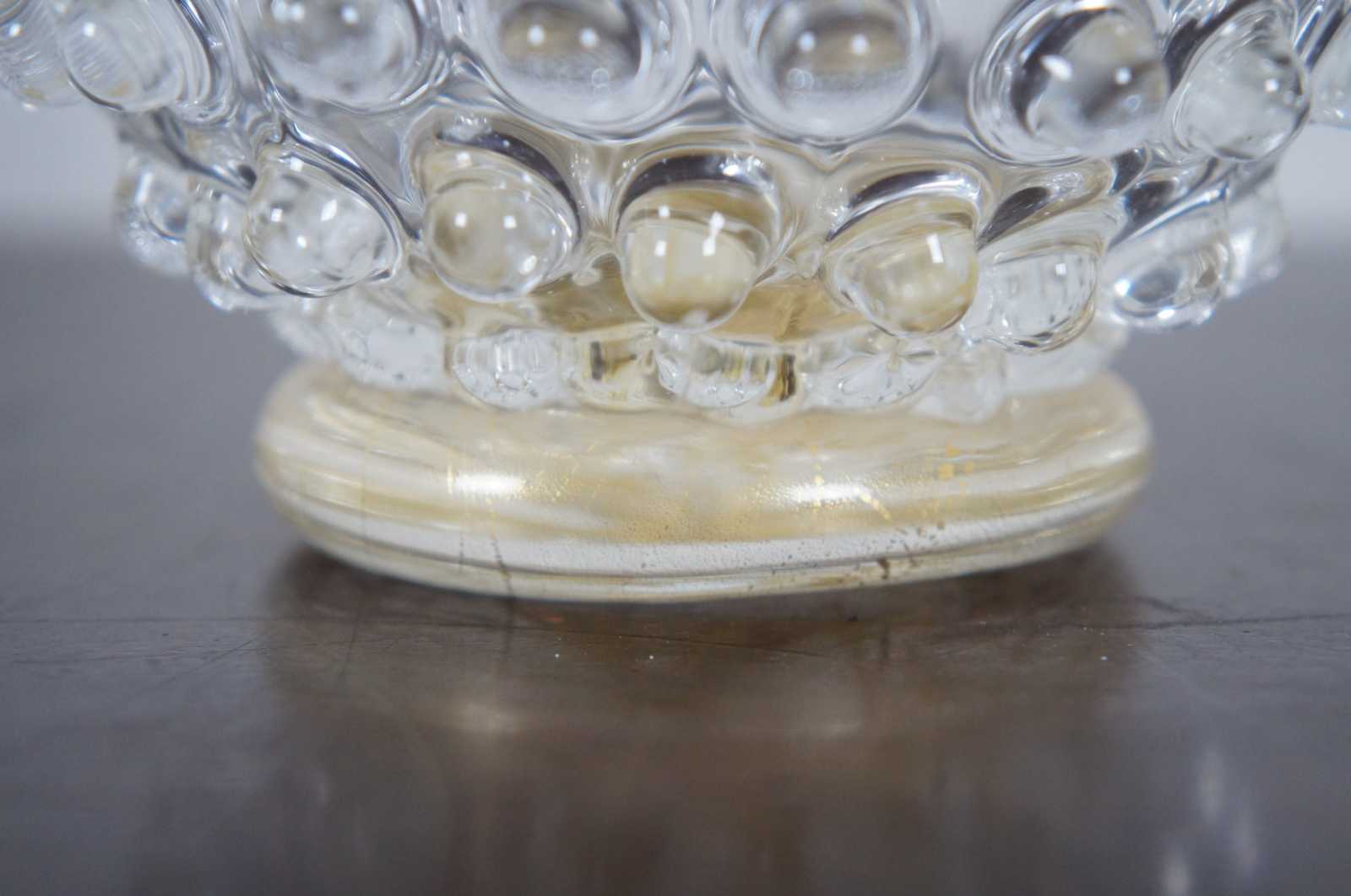 Vintage 1998 signed studio art glass vase with clear tapered neck atop a hobnail textured orb with speckled gold flake collar and foot.