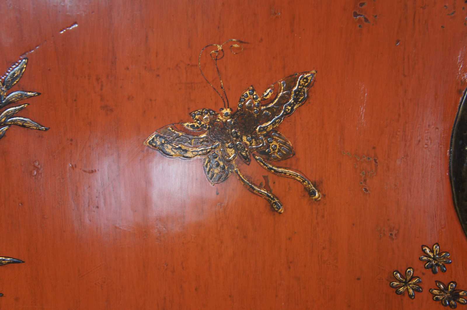 Antique 19th century Qing Dynasty wedding cabinet. Made from elm with red lacquer finish over dragonfly / butterfly motif. Features two shelves and hidden interior compartment.