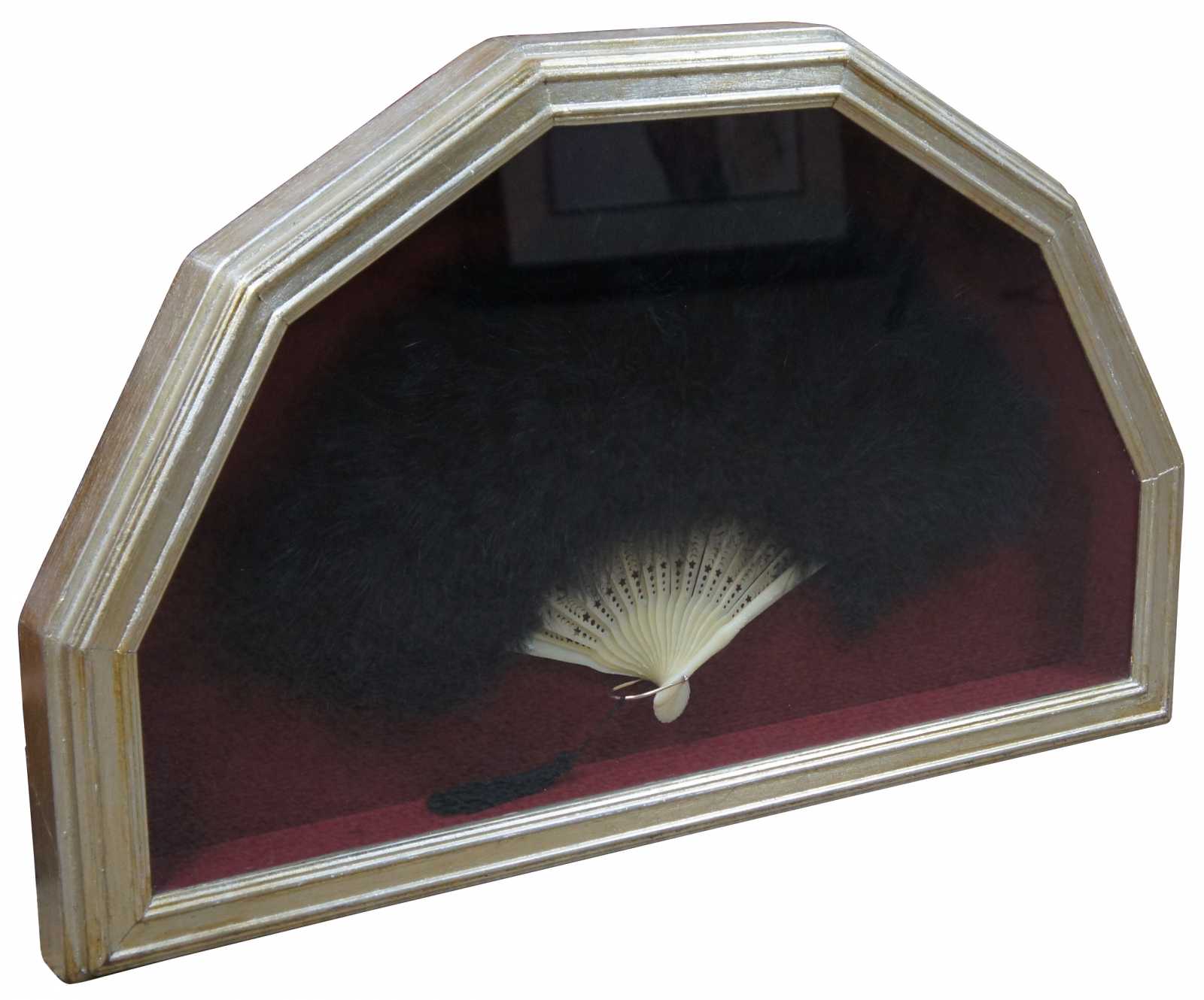 black ostrich feather folding fan with white plastic sticks pierced with stars and floral motifs, framed in a shadowbox on red fabric.