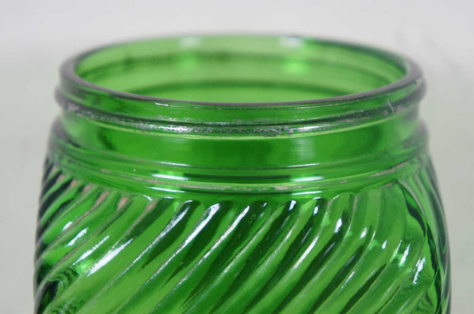 Antique Owens-Illinois green glass canister with diagonal ribs, Cereal label and metal screw top lid.