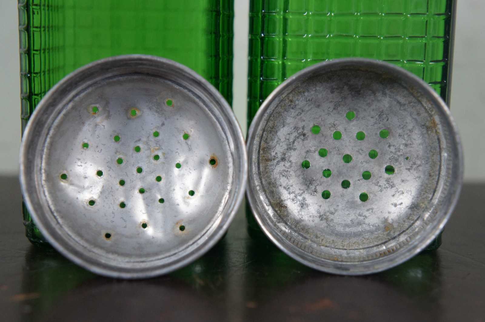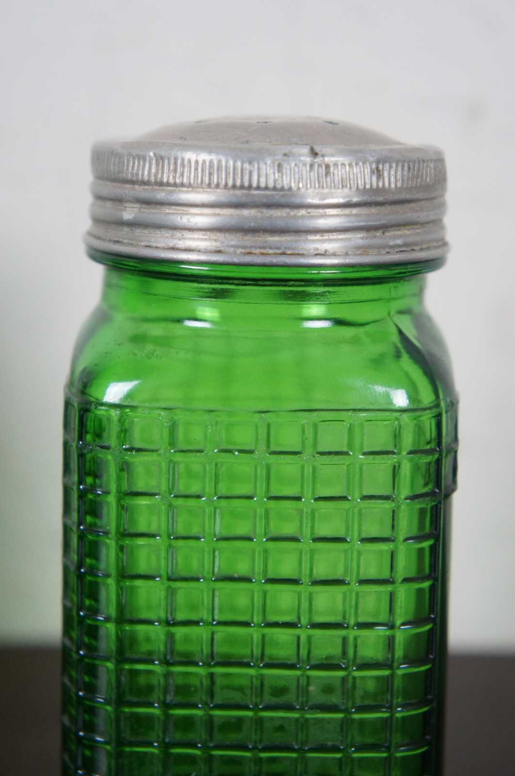 Antique Owens-Illinois green glass miniature canisters with shaker lids and a checkered texture, with flat space for a label.