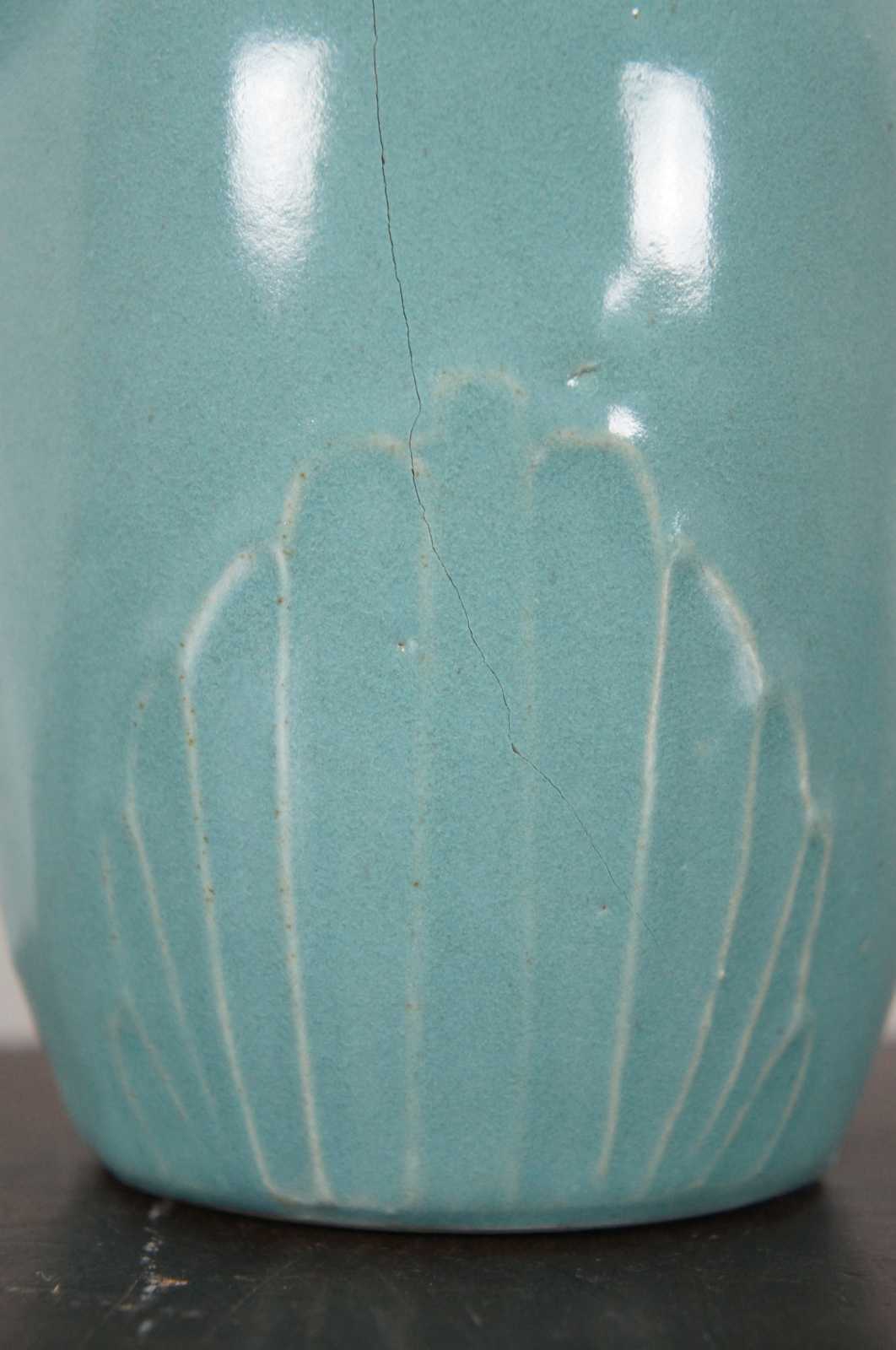 Vintage Monmouth USA stoneware ceramic pitcher with madeline-cookie syle fan accents at the base.
