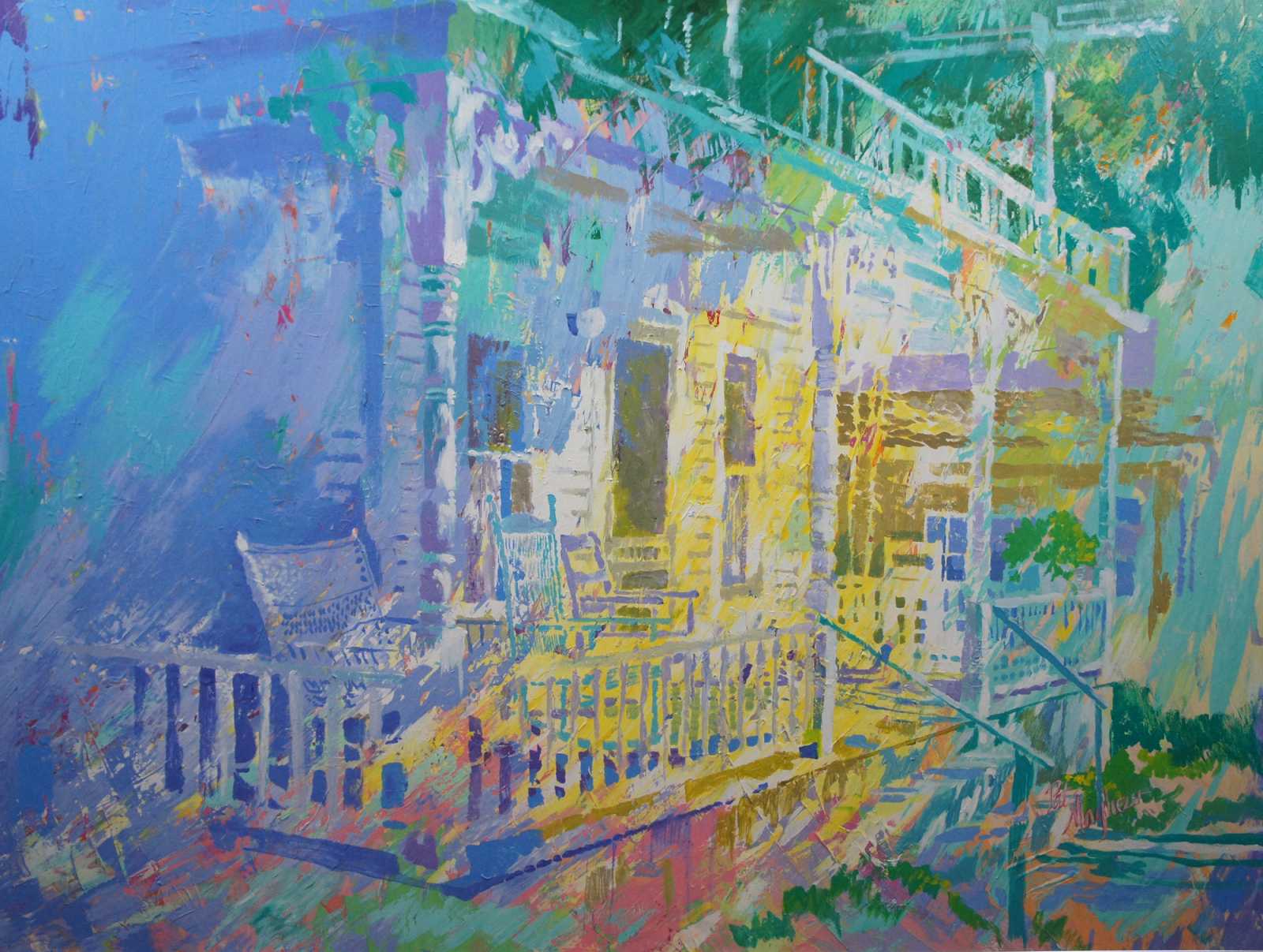 Impressionist architectural painting of a colonial porch reminiscent of New Orleans with rocking chairs under a balcony, oil on canvas signed by artist Pat Mayhew.