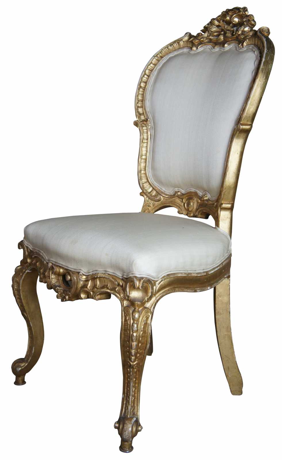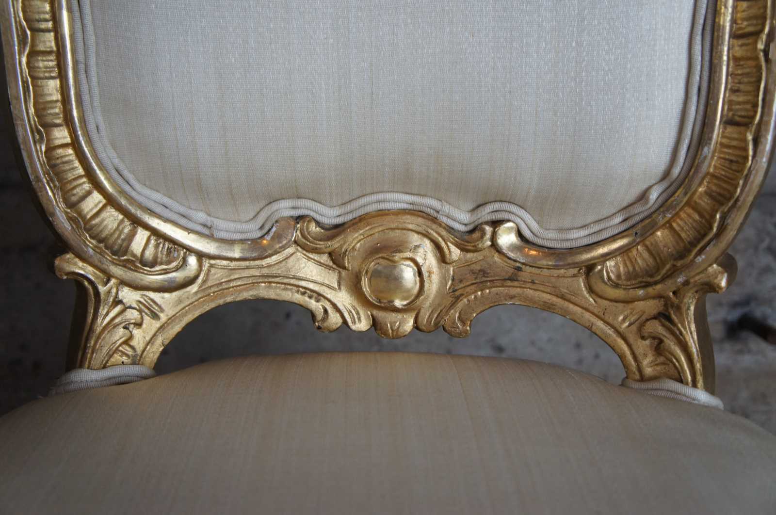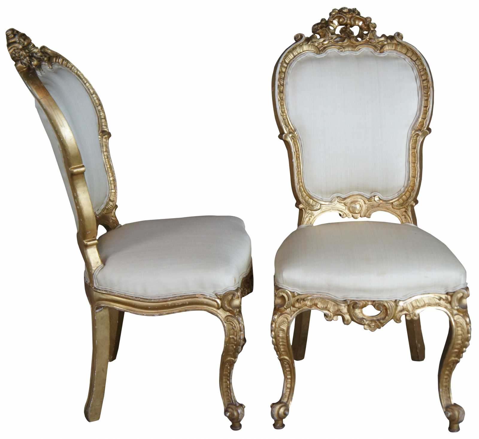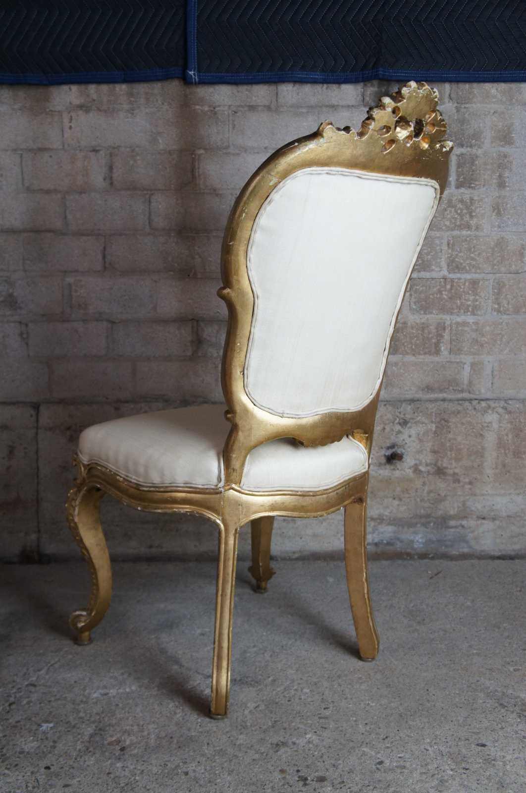 Suite of 8 Swedish gilt and gesso Louis XV/Rococo side chairs. Circa mid 18th century. Features an ornately scalloped frame with shell carvings on the apron and crest. Upholstered in a neutral silk fabric with horsehair fill. Supported by cabriole legs leading to scrolled feet.