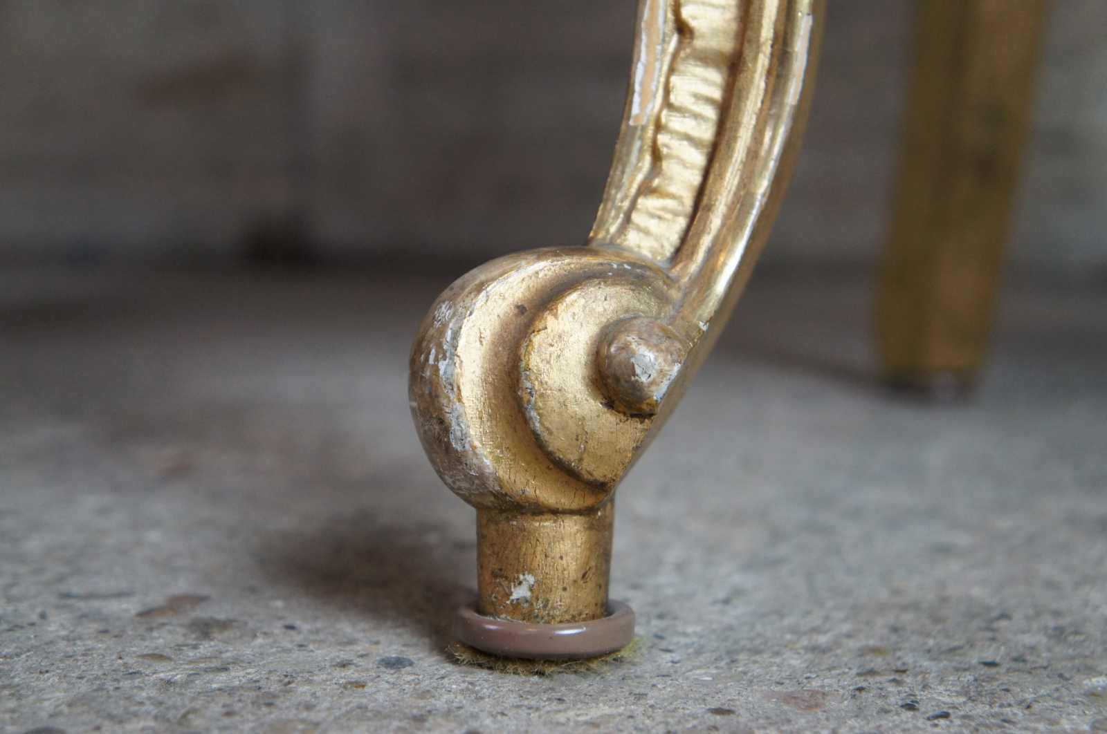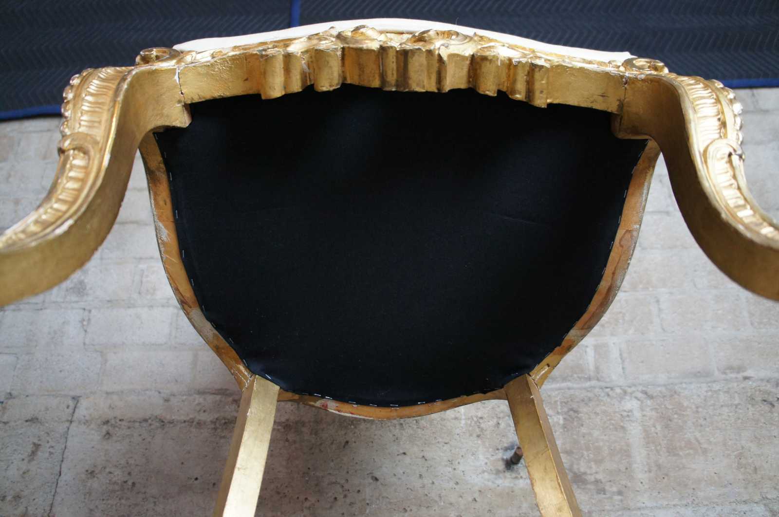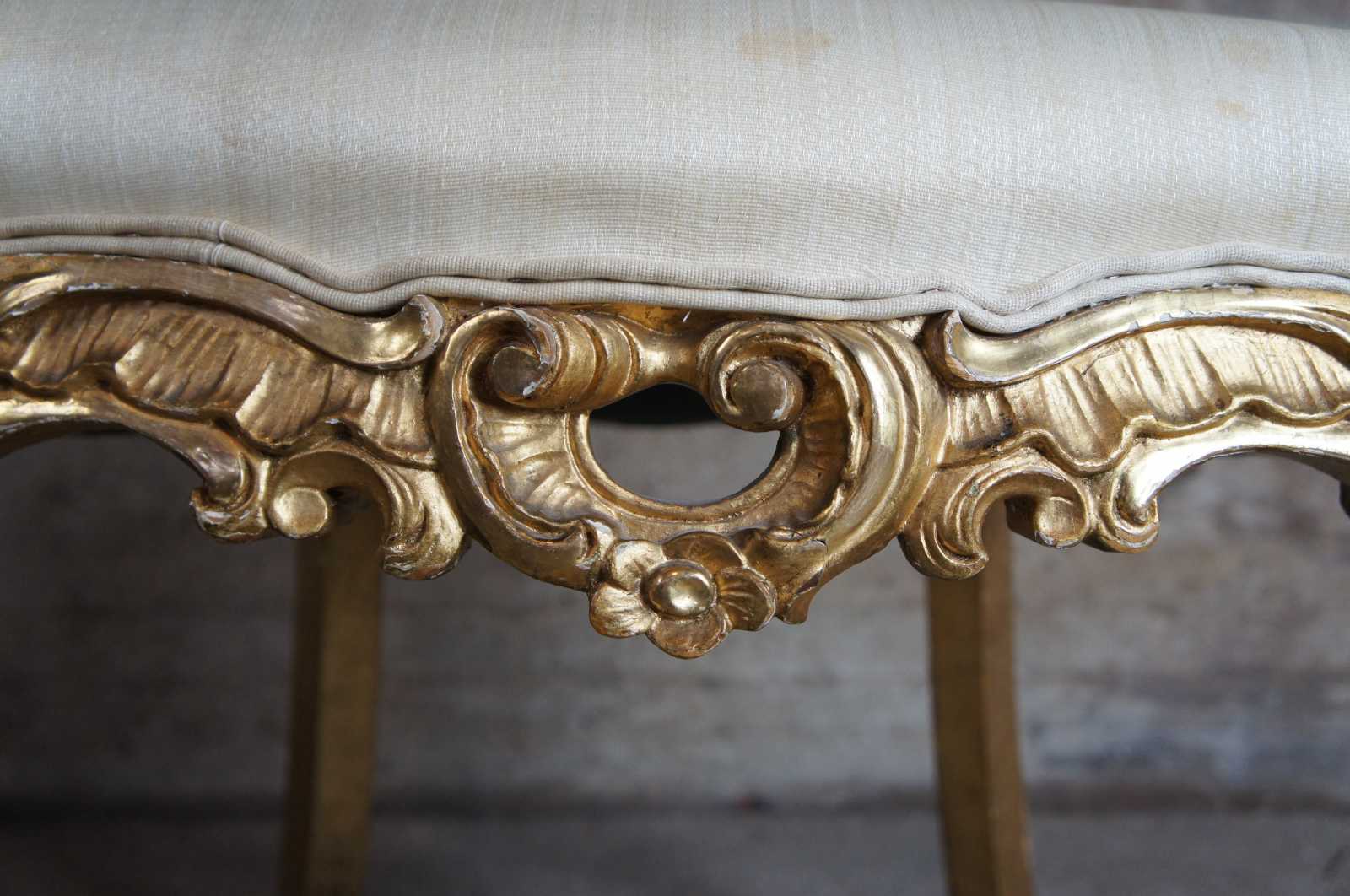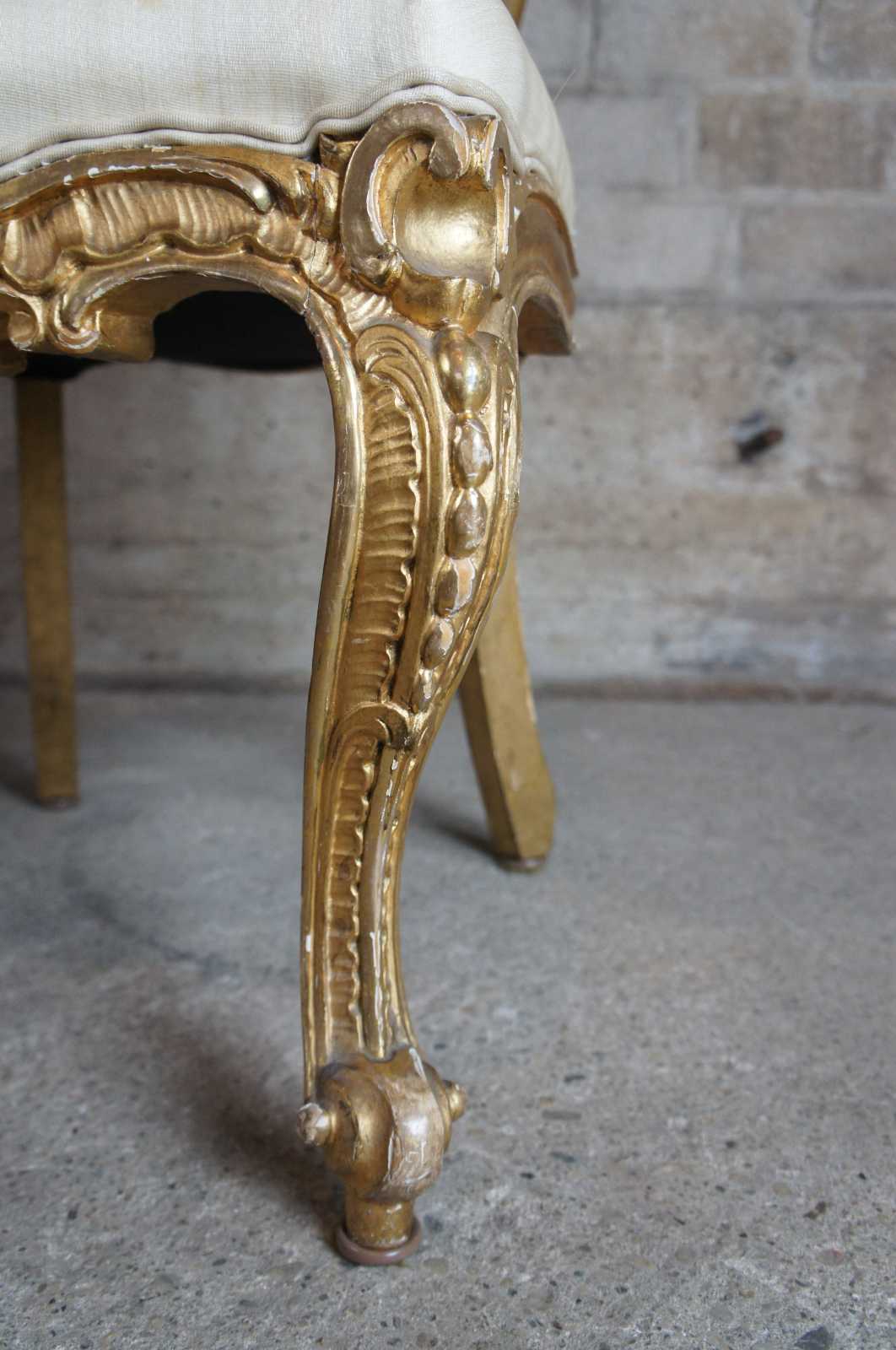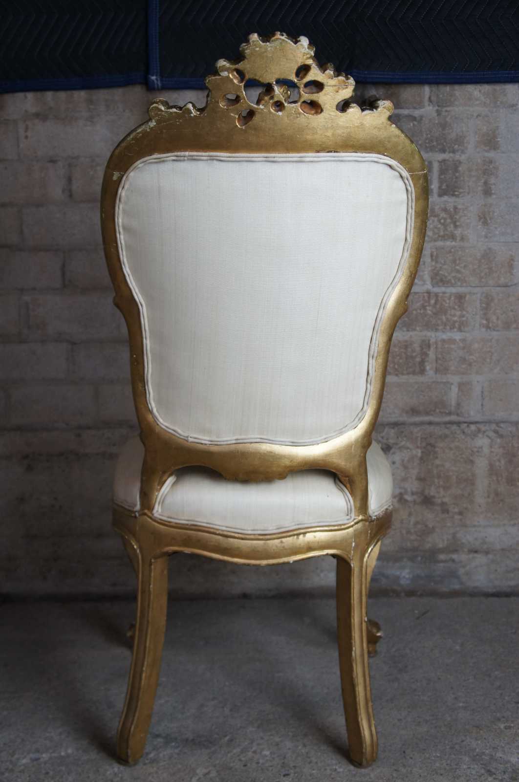 Suite of 8 Swedish gilt and gesso Louis XV/Rococo side chairs. Circa mid 18th century. Features an ornately scalloped frame with shell carvings on the apron and crest. Upholstered in a neutral silk fabric with horsehair fill. Supported by cabriole legs leading to scrolled feet.