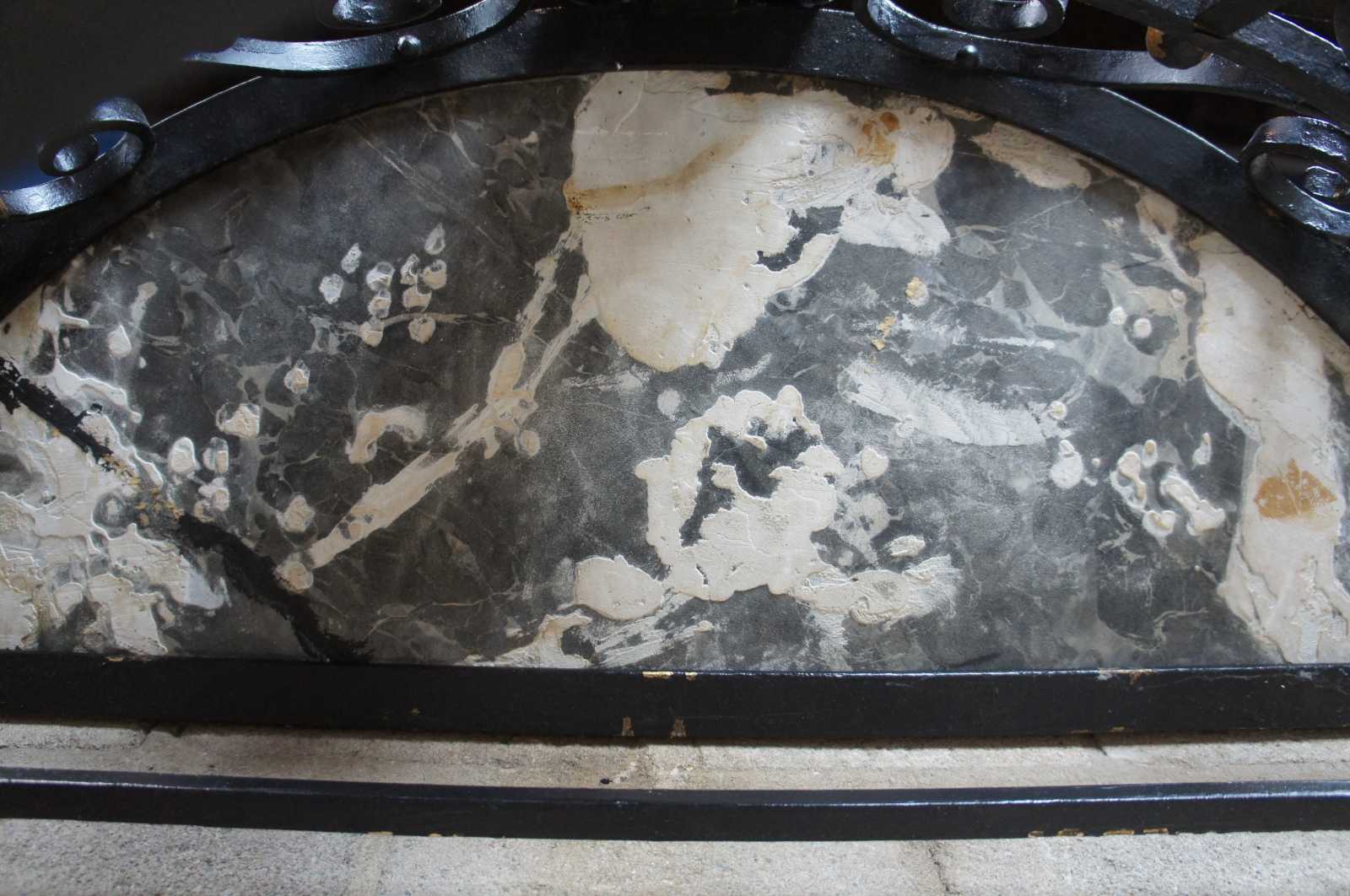 Circa 1980s demilune console table. Features Louis XV styling with scrolling iron, acanthus acccents and a marble top. Base is finished in black with gold trim. Marble top is black with white veining.