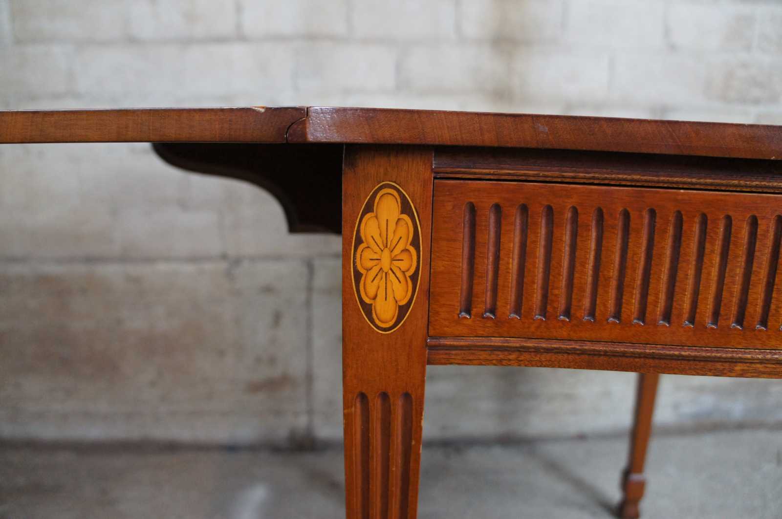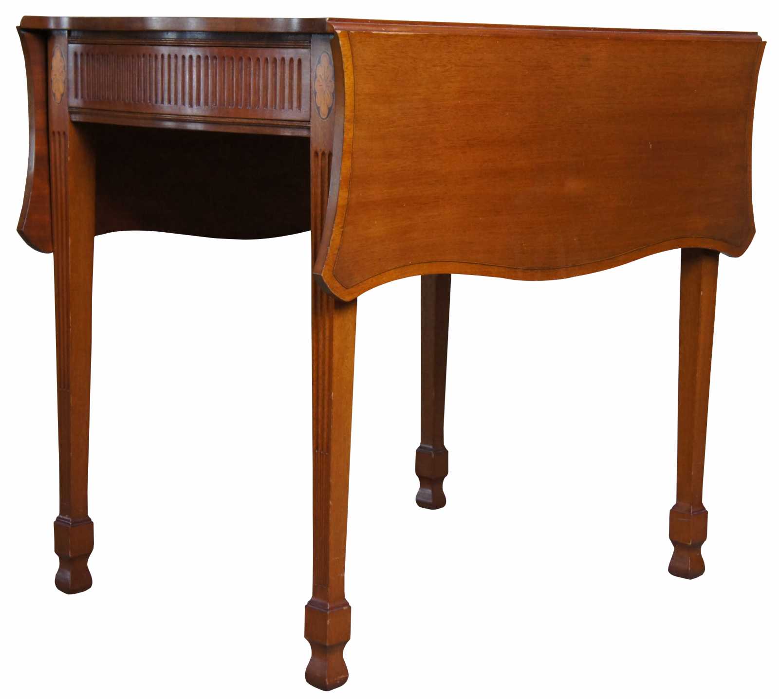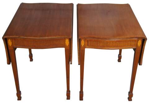 Pair of two vintage Nathan Margolis drop leaf tables. Made of mahogany, inspired by Federal and Hepplewhite styling with serpentine shape and square tapered legs. Features fluted accents,inlaid flowers and a hidden central drawer that can be opened using a groove underneath the drawer. Made by Harold Margolis.