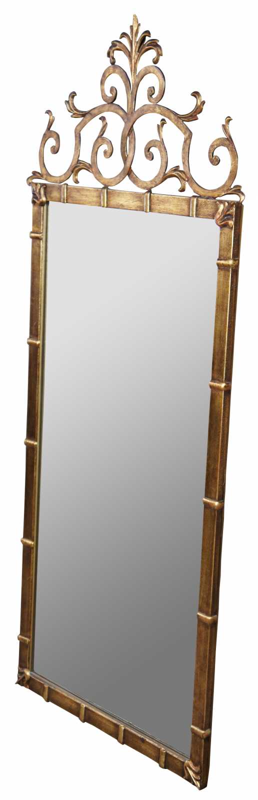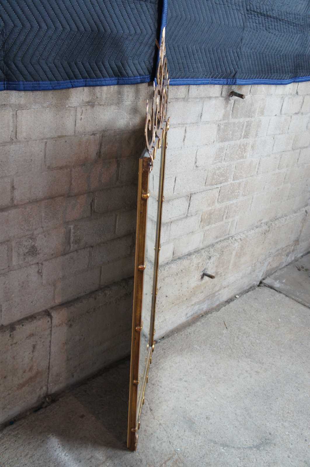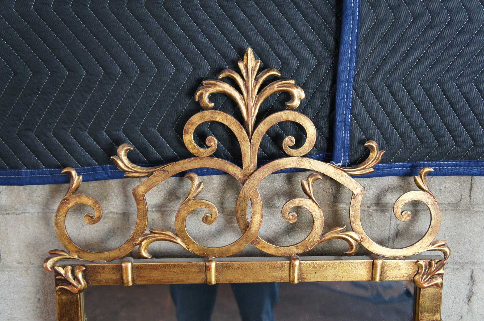 Circa 1960s Palladio Italian wall mirror in the manner of Rococo or Regency styling. Made from metal with an intermittent ribbed design along the frame and interlaced scrolling crown. Features an acanthus topper that is matched by fleur de lis leaves on each corner of the frame.