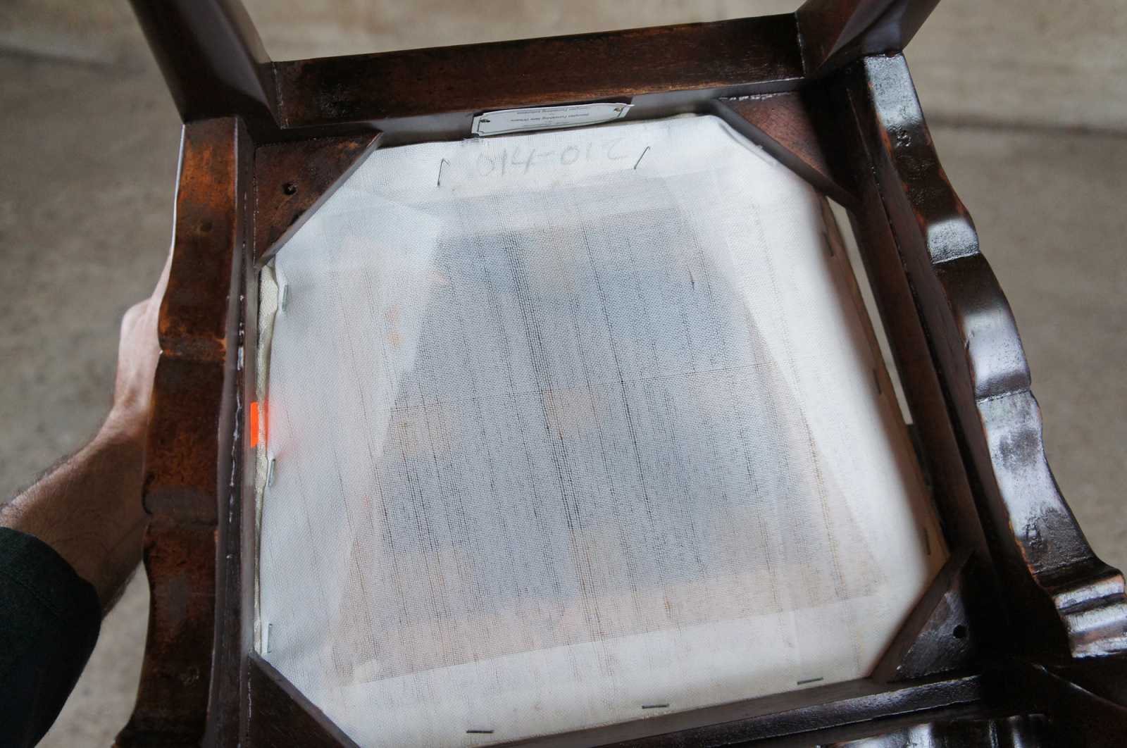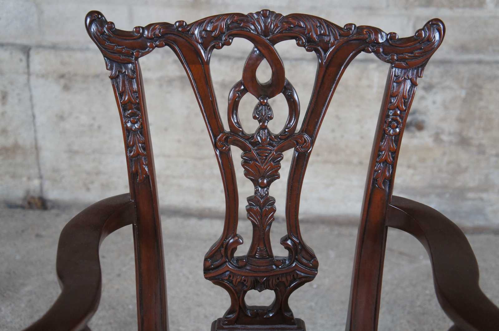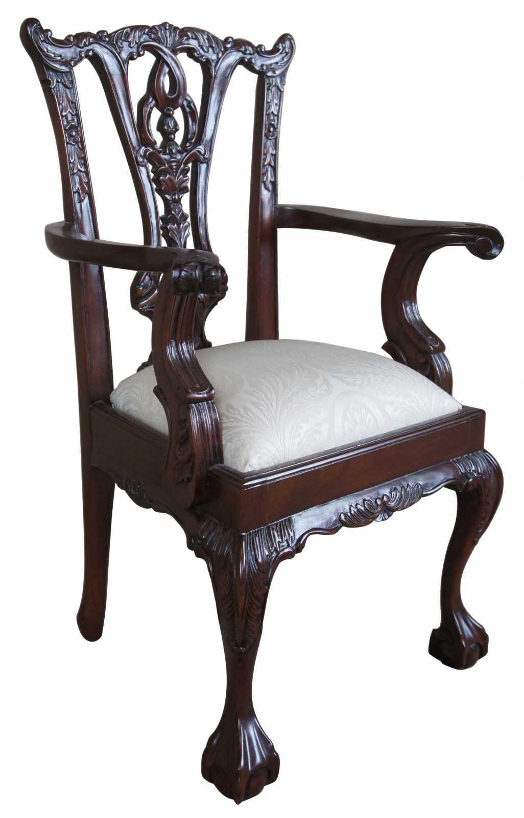 Late 20th century chippendale child or dolls chair. Made exclusively for Georgian Furnishing Co., LTD. in New Orleans, LA. Made from Mahogany with an intricately carved crest and rail over pierced splat. Upholstered in a white french fabric. The chair is supported by acanthus carved over ball and claw feet.