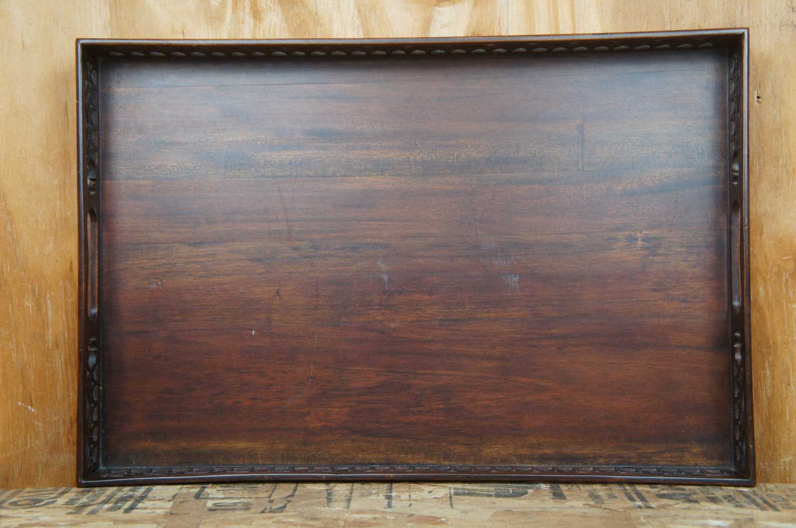 Vintage mahogany butlers serving tray or tea / coffee caddy by Selemat Designs of San Francisco. Made in Indonesia featuring a reticulated or pierced gallery with two handles and Chippensale styling.