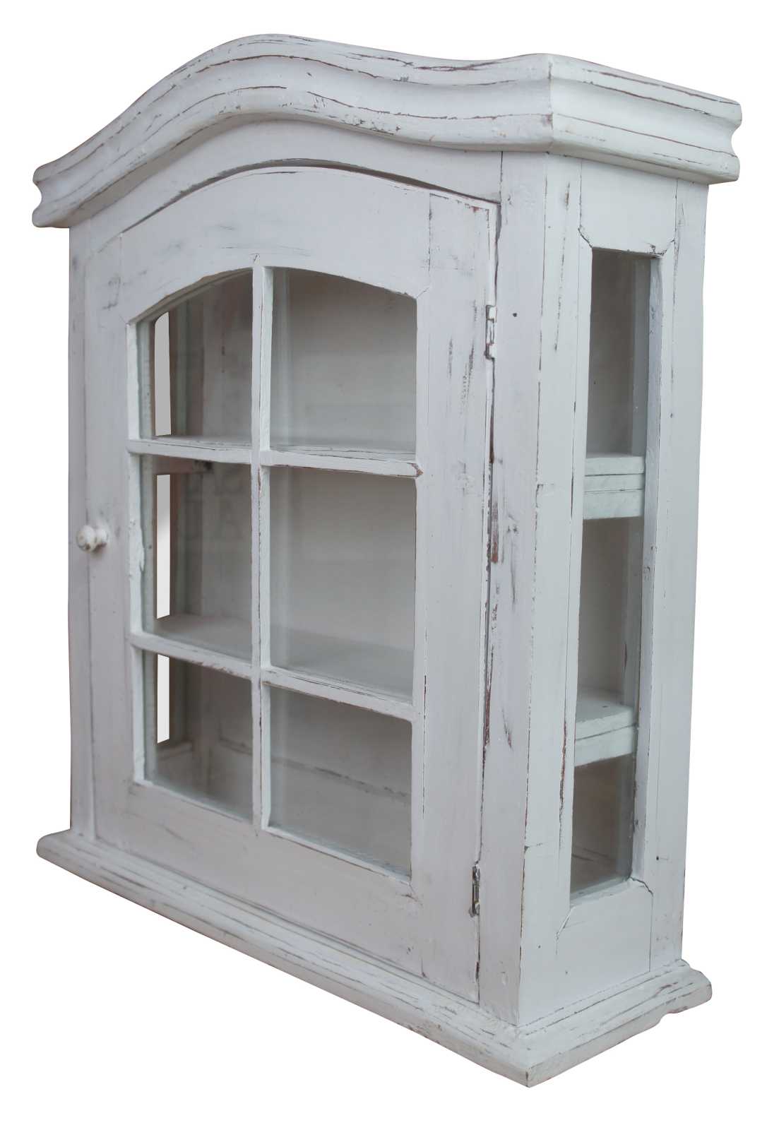 Vintage dome top wall curio cabinet featuring a distressed finish with paneled lattice glass door and three tiers.