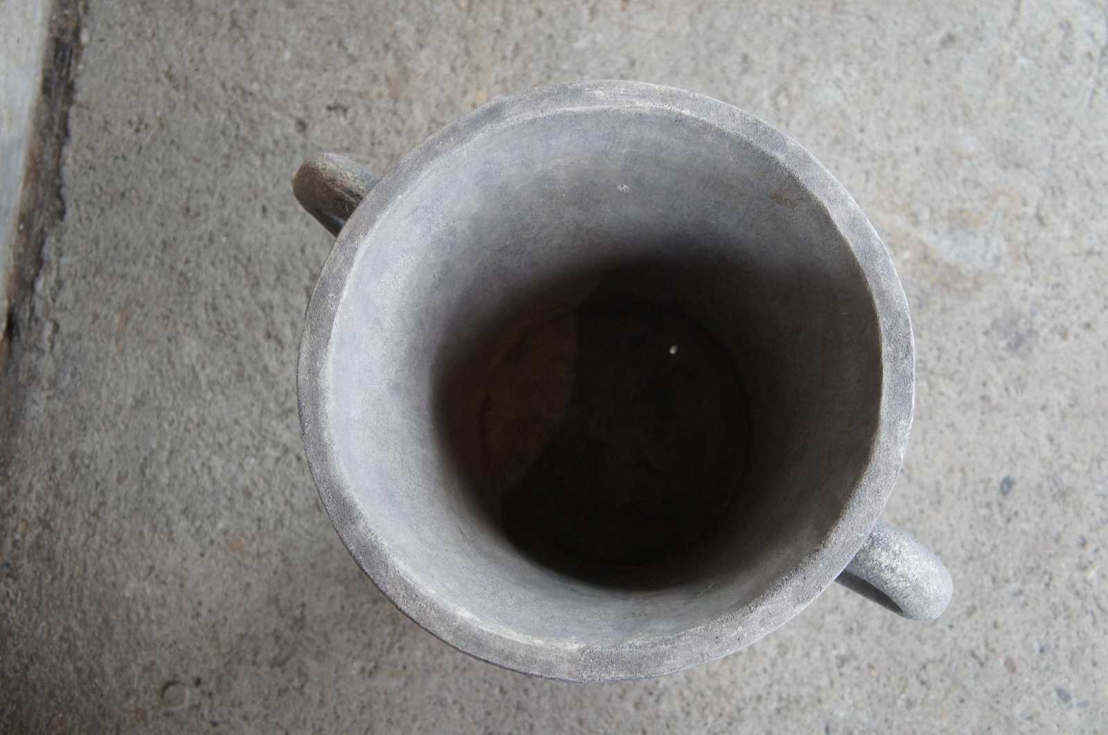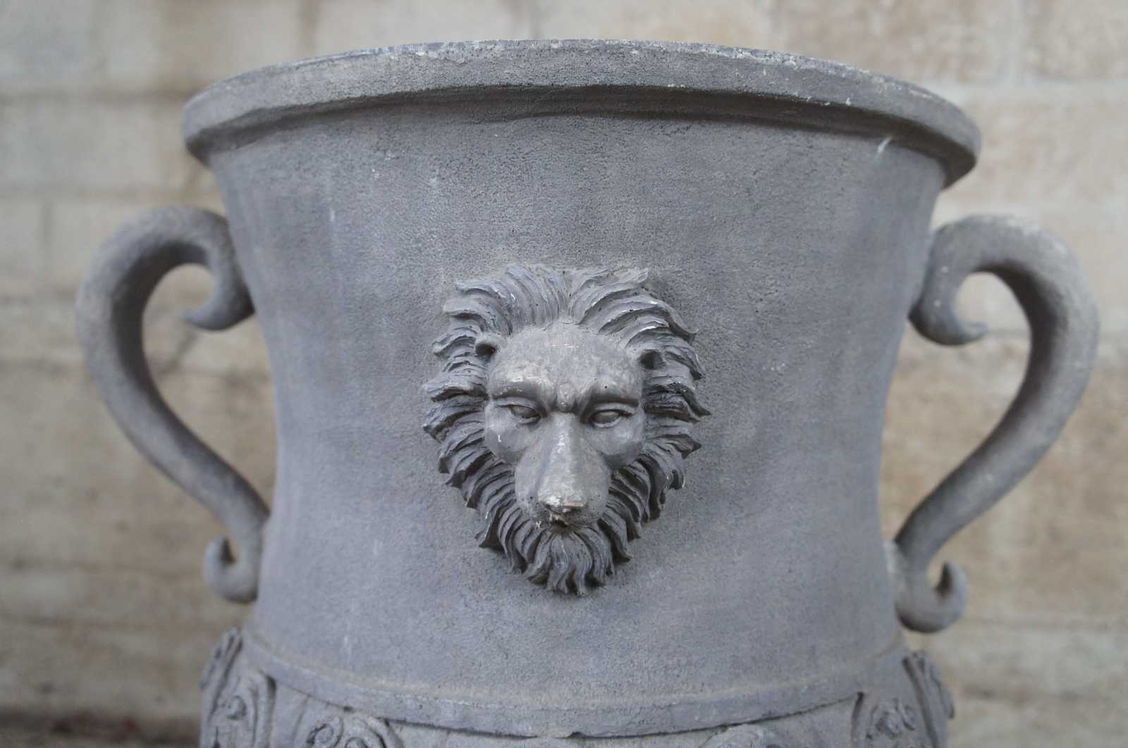 Vintage trophy shaped garden urn featuring scrolled handles, pedestal base and lion head accents.