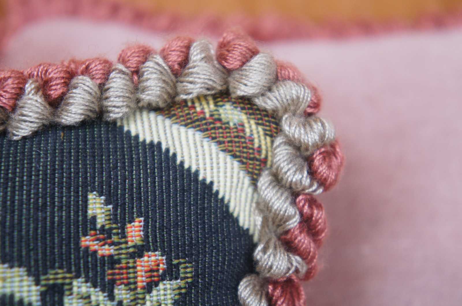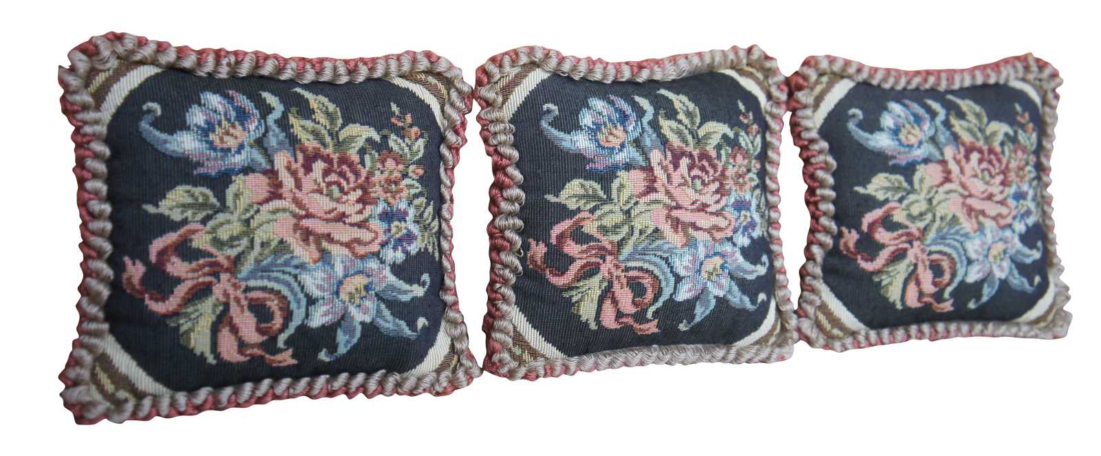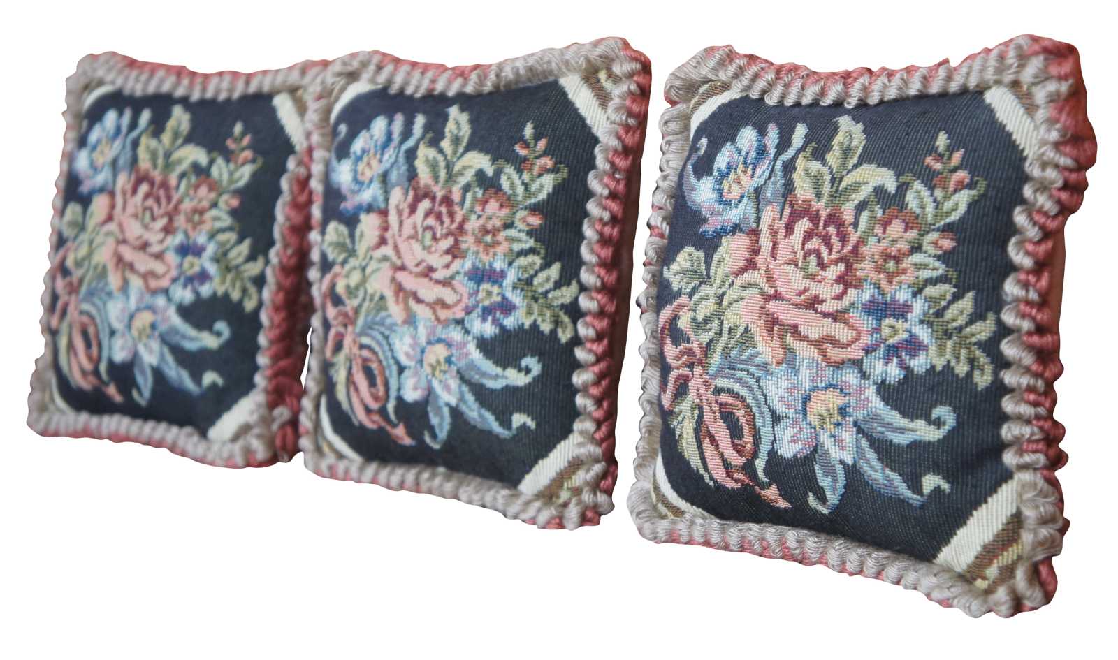 Three tapestry needlepoint accent pillows featuring a bouquet of multi-colored flowers on one side with soft pink velvet on the other, finished with braided fringe.