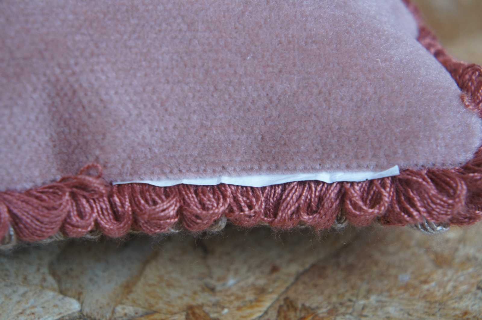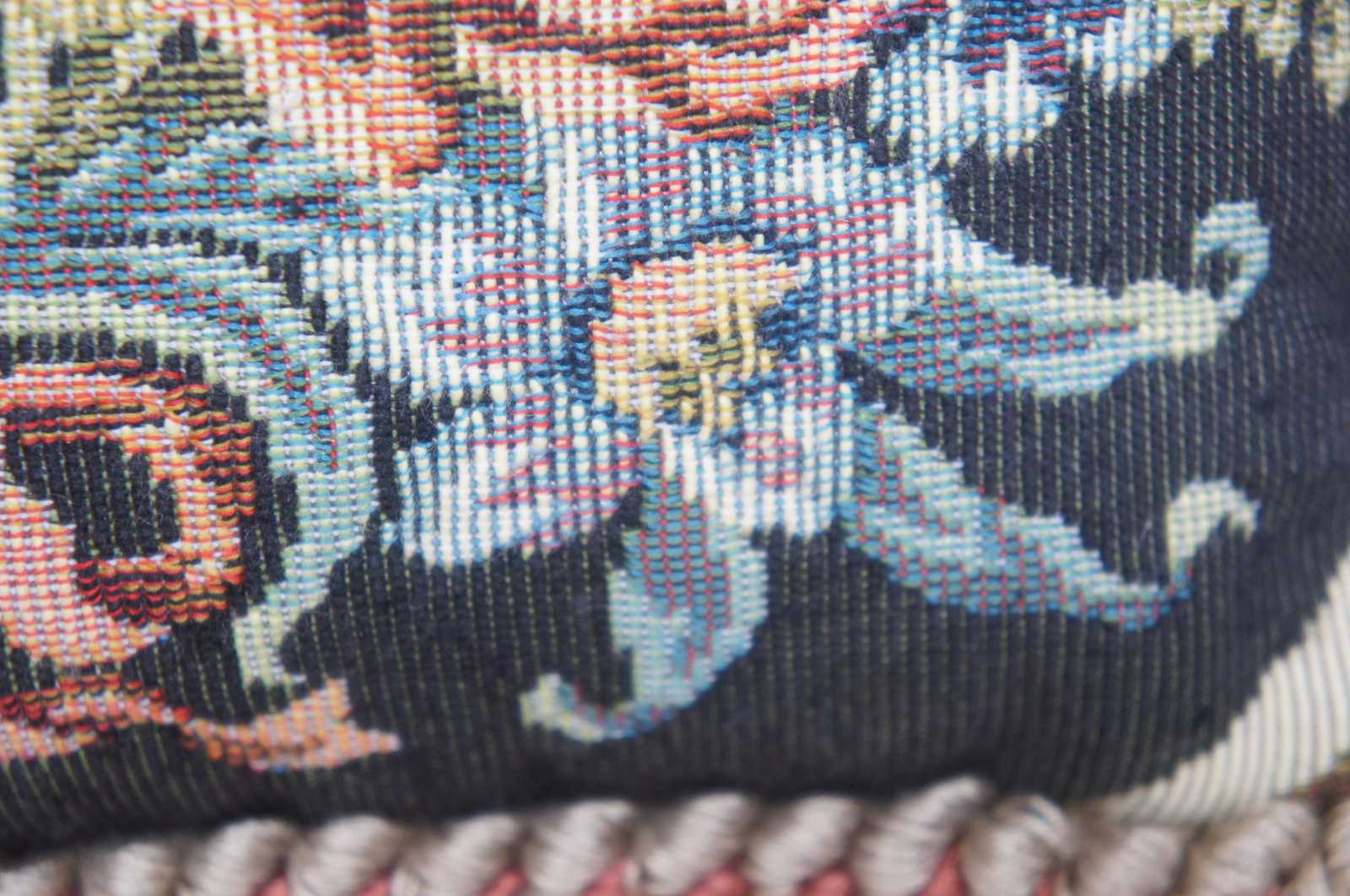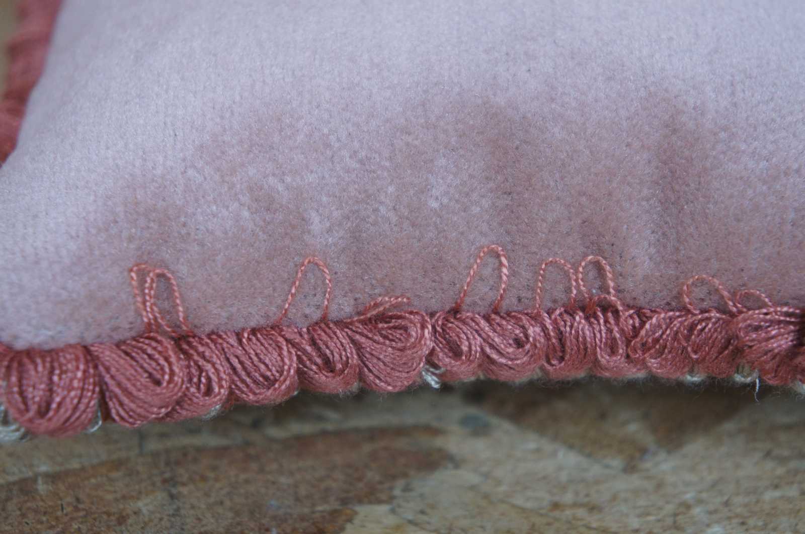 Three tapestry needlepoint accent pillows featuring a bouquet of multi-colored flowers on one side with soft pink velvet on the other, finished with braided fringe.