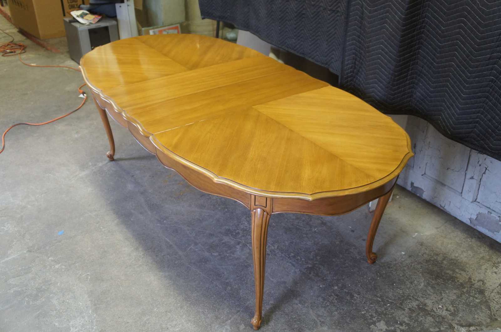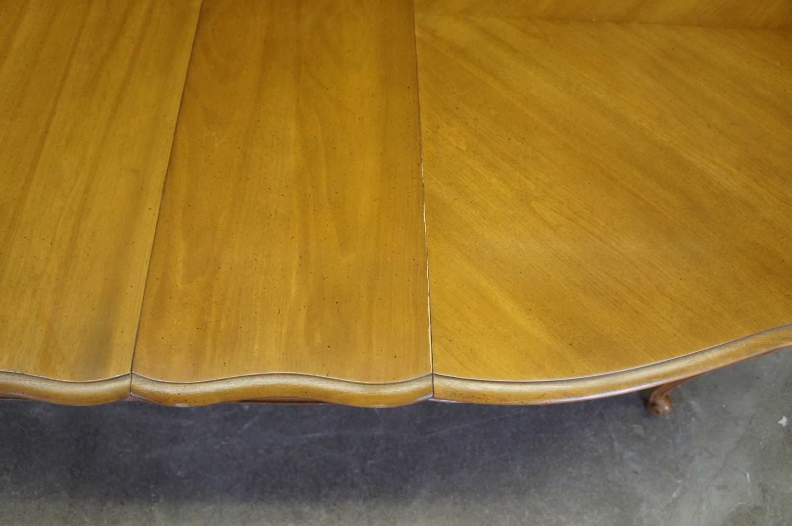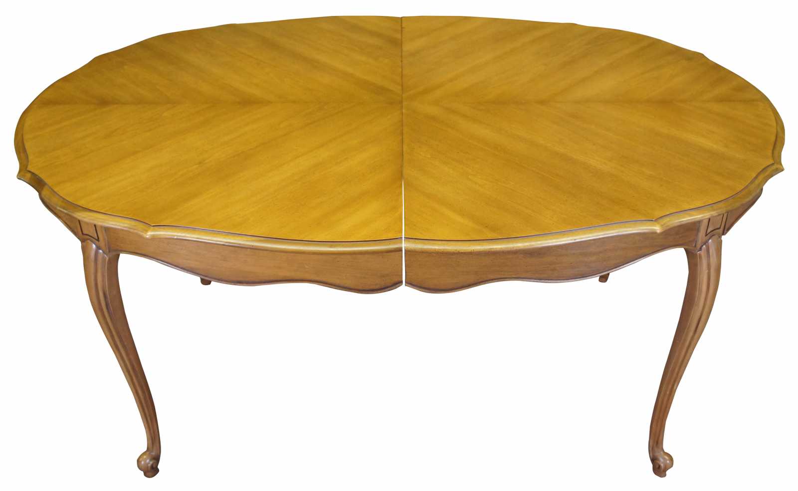 Mid 20th century French Provincial dining table. Made from walnut with an oval form featuring a scalloped top with matchbook veneer ang long scrolled french legs. Extends to 101