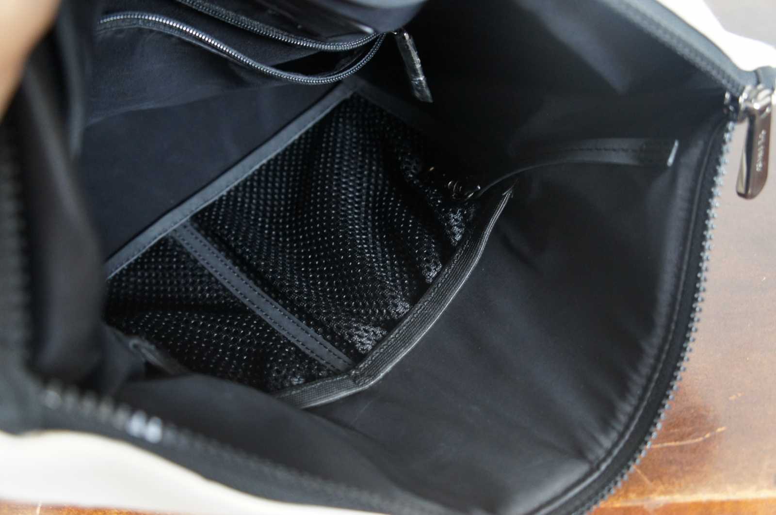 Stylish black and white backpack by Caraa Athleta including gray zipper pouch with optional purse strap.