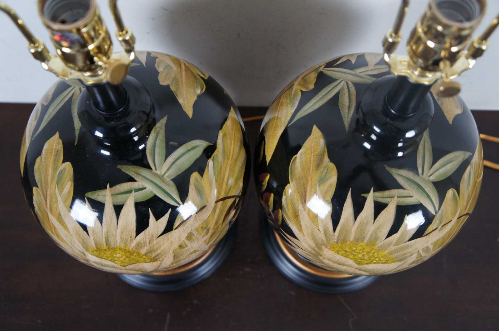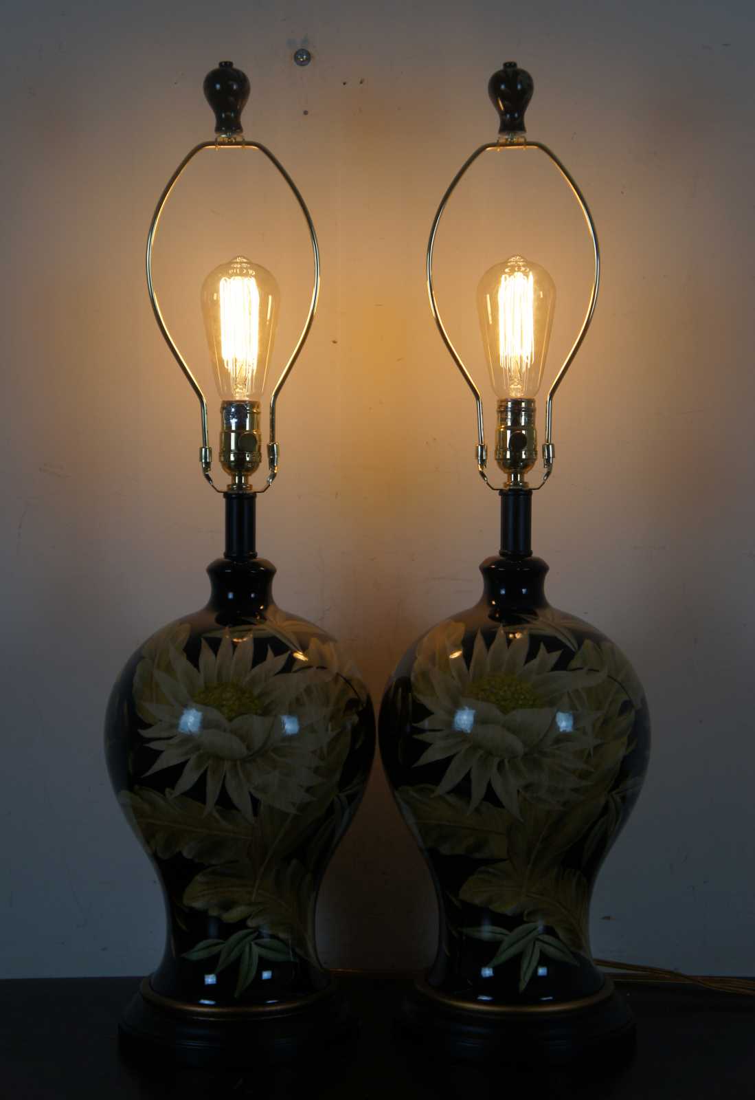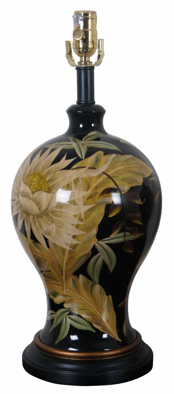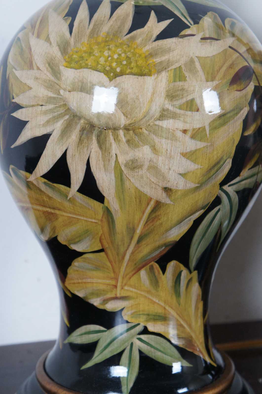 Pair of vase shaped black porcelain table lamps with hand painted flowers and matching finials by John Richard.