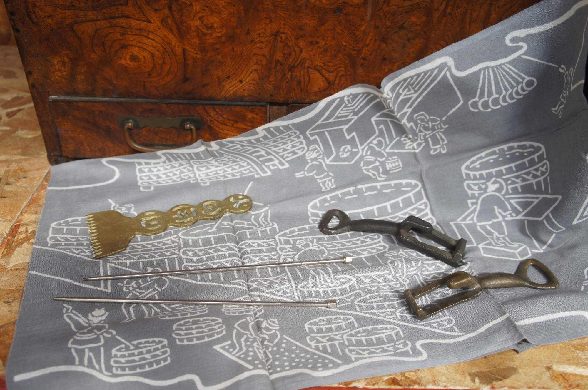 Early 20th century, dovetailed keyaki burl wood case with beautiful grain, copper-lined well, upper removable panel, over five drawers, with copper kettle mount and accessories.